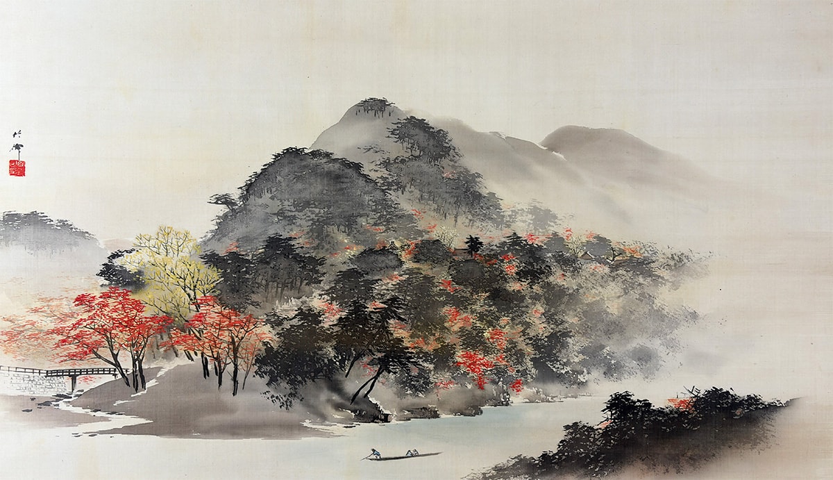 兵庫・相生出身の画家、西田竹僊による秋景の傑作。嵐山の峡谷を望む静謐な水辺に、紅葉に染まる山並みと一艘の舟が浮かび、季節の移ろいと人の営みが詩的に描かれています。