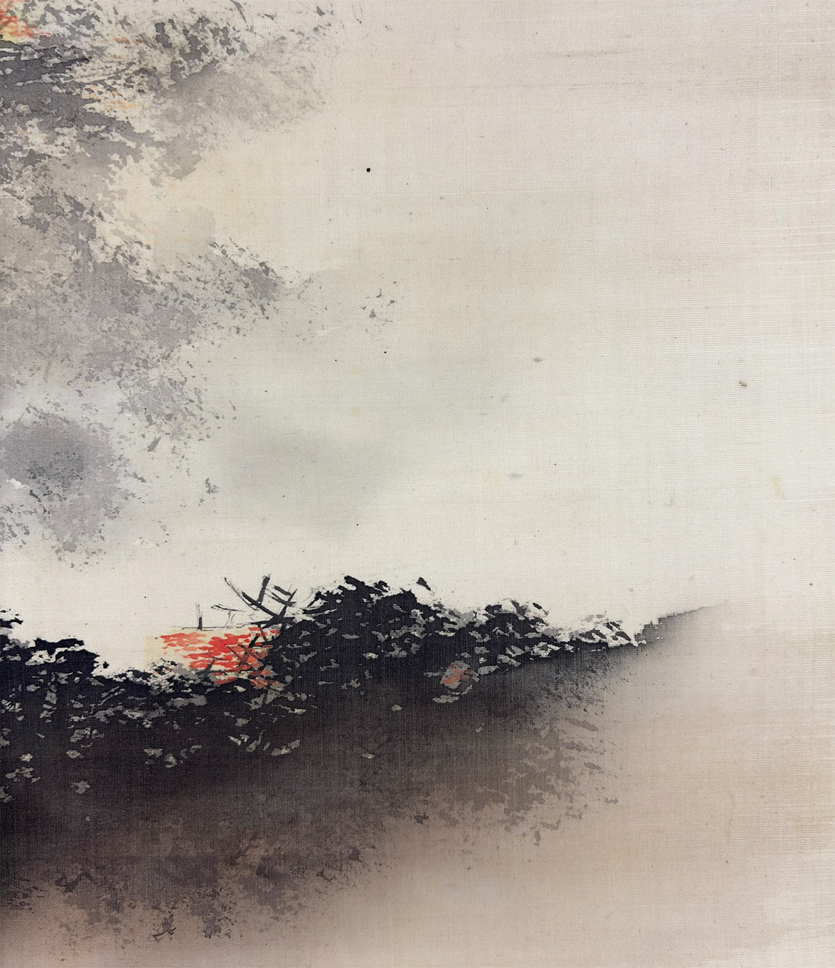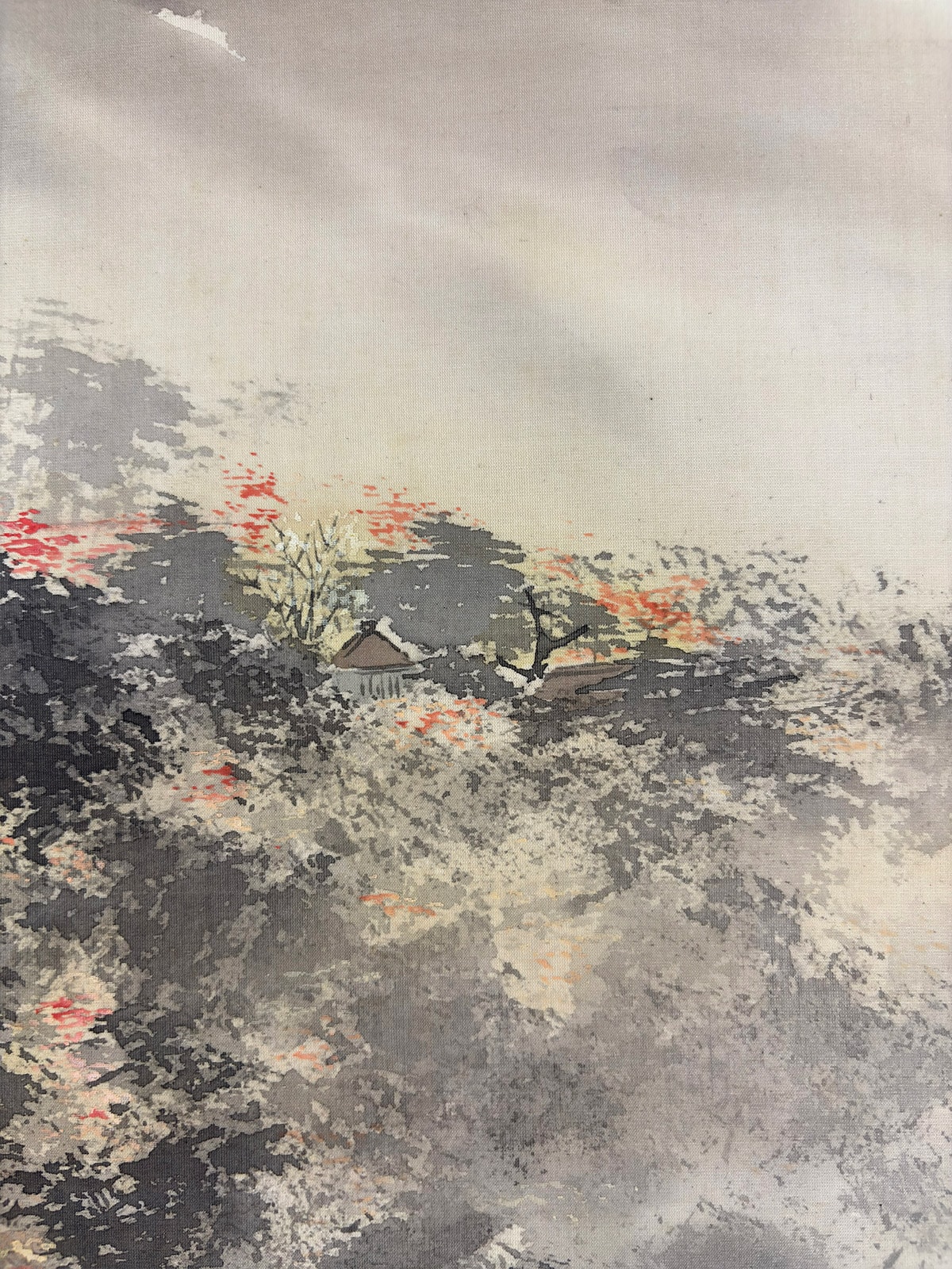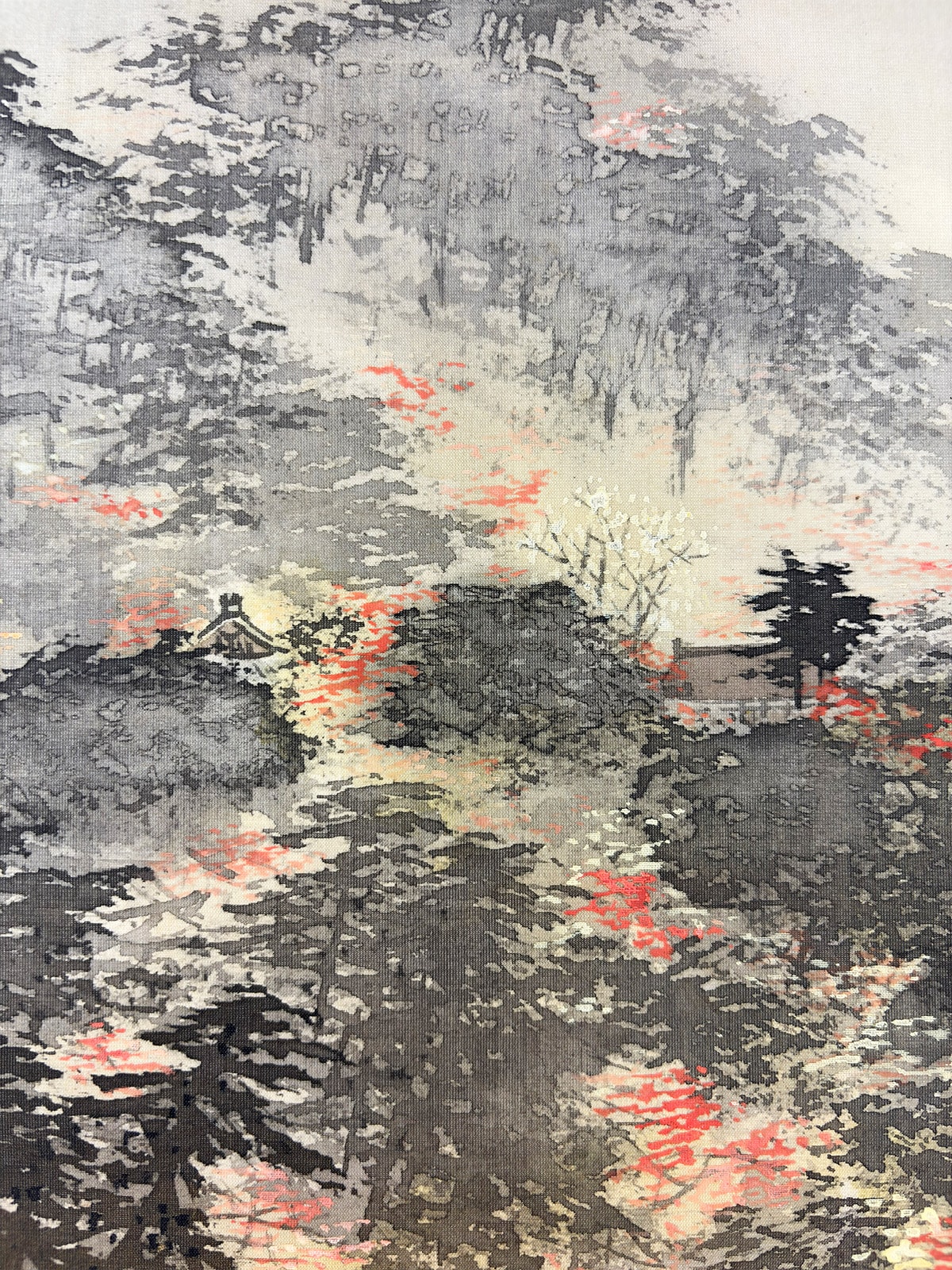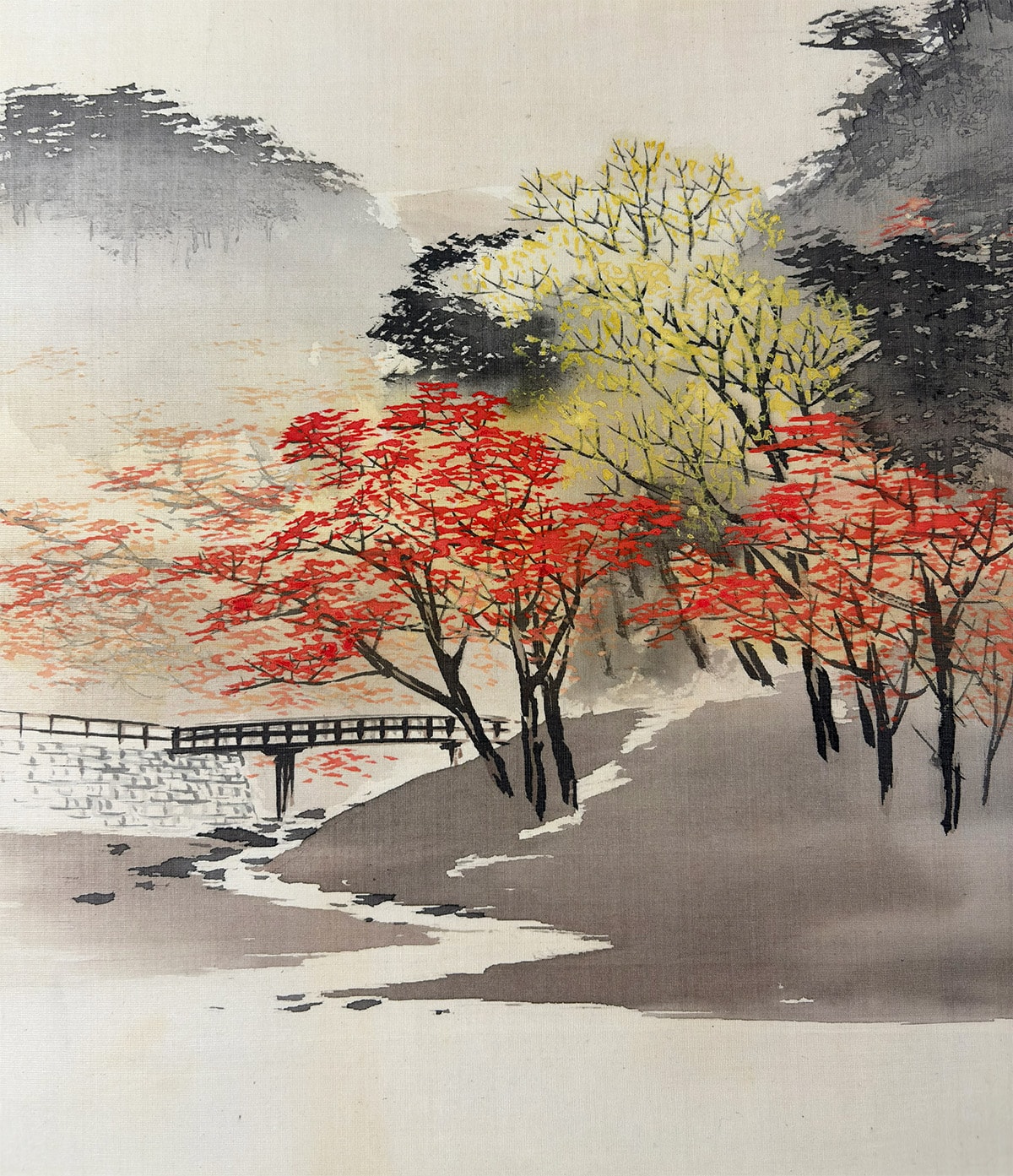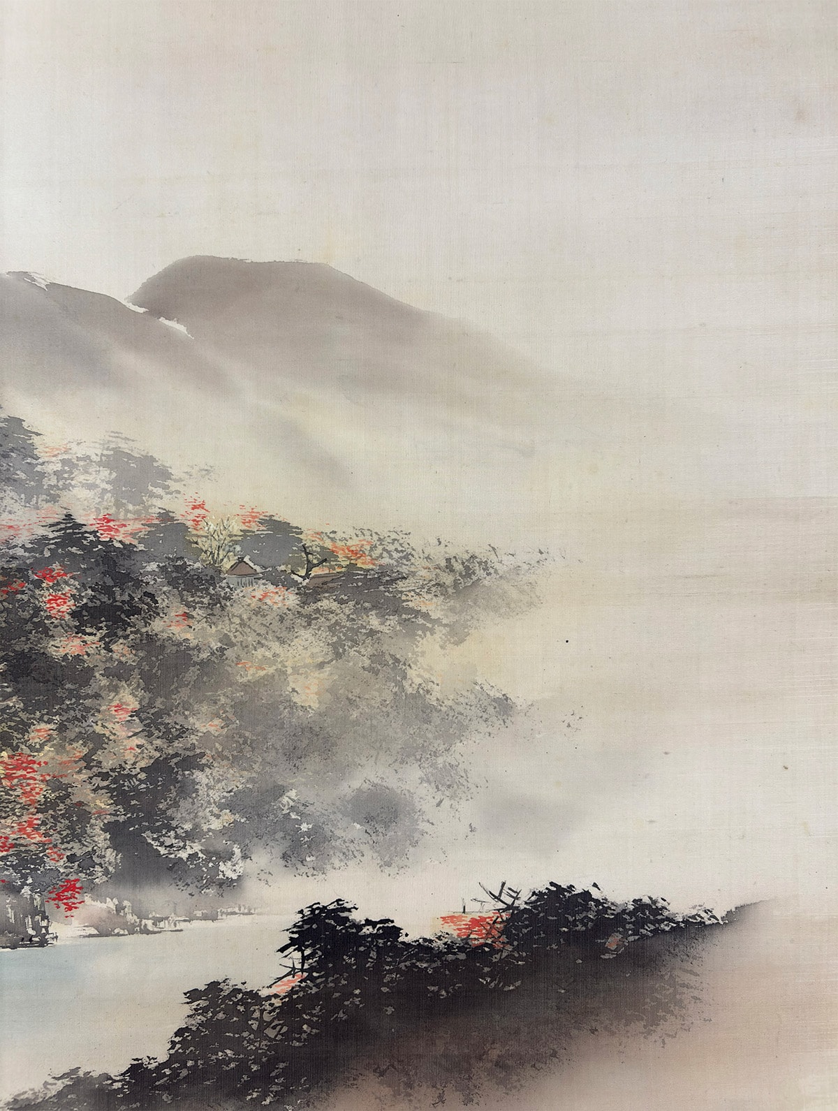 ●一間床にお掛け頂ければ、画面の広がりと余白の美が際立ち、空間全体に静謐な秋の気配が満ちます。紅葉の彩りと水面の余情が、床の間の「間」と響き合い、季節の設えとしても格別の趣を添えます。