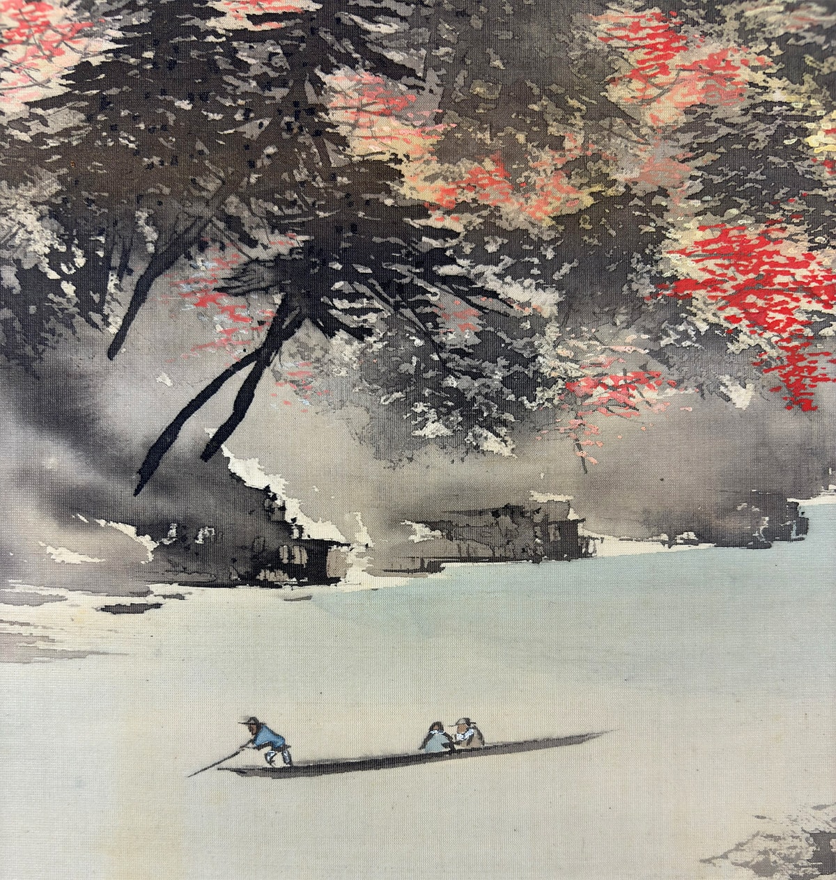 ●紅葉に染まる山並みと一艘の舟が浮かび、季節の移ろいと人の営みが詩的に描かれています。