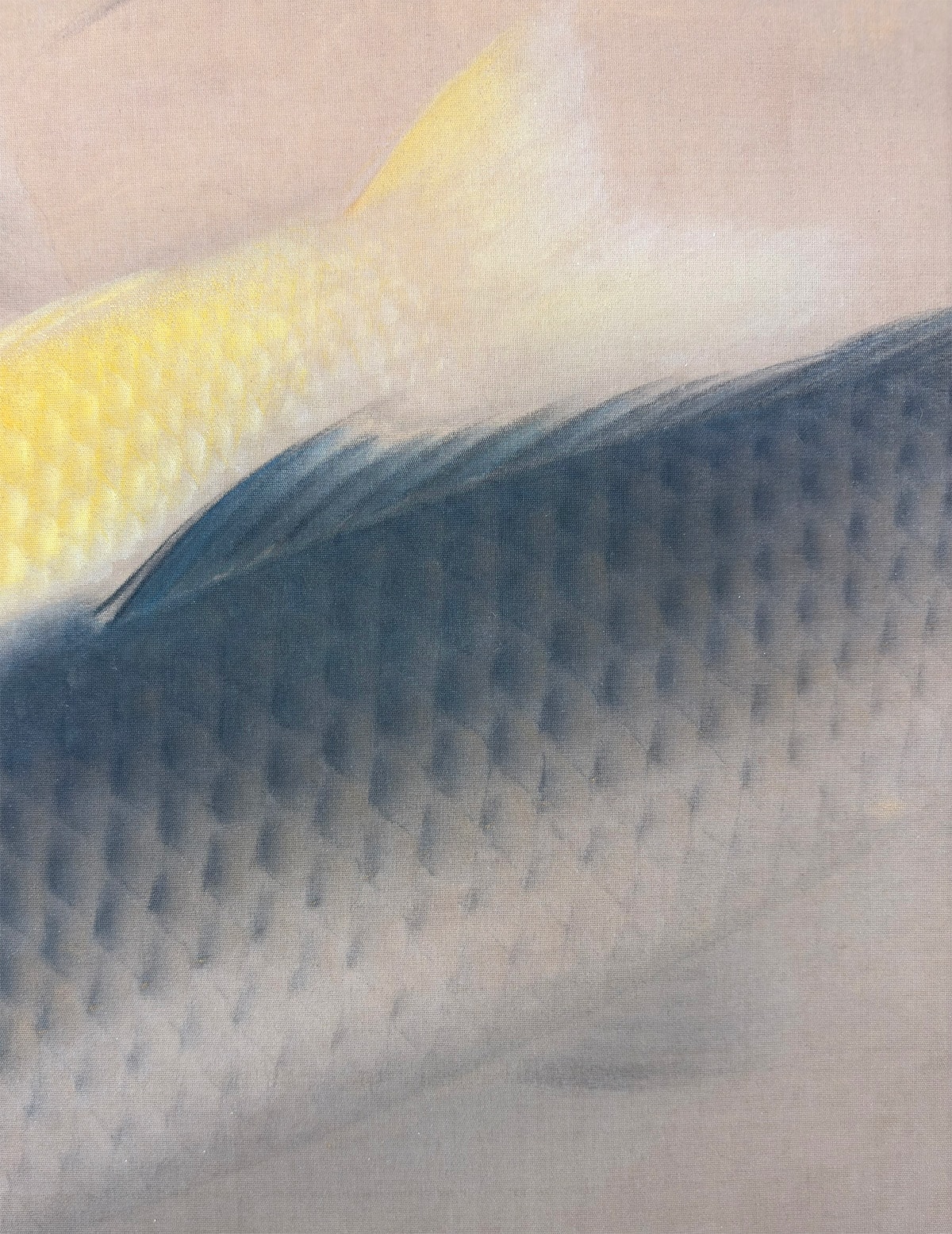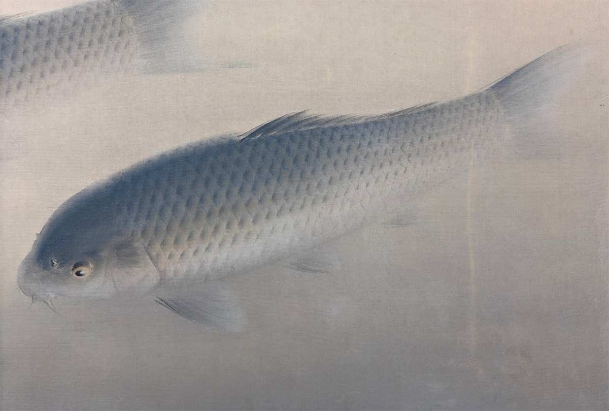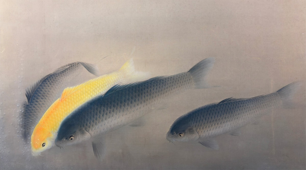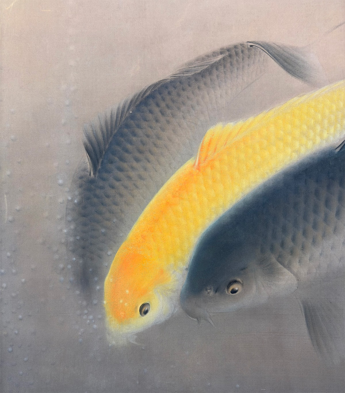 ●五匹の鯉が水中を泳ぐ構図。金鯉が一匹入り、画面に華やぎと吉祥性を添えています。