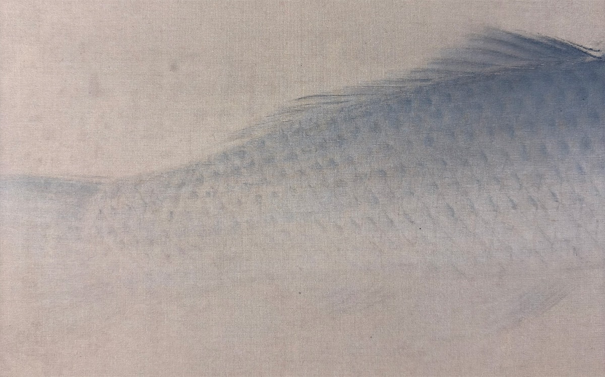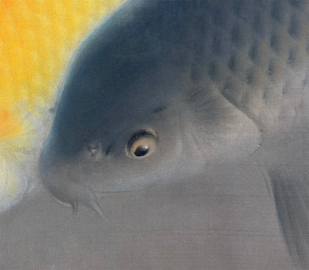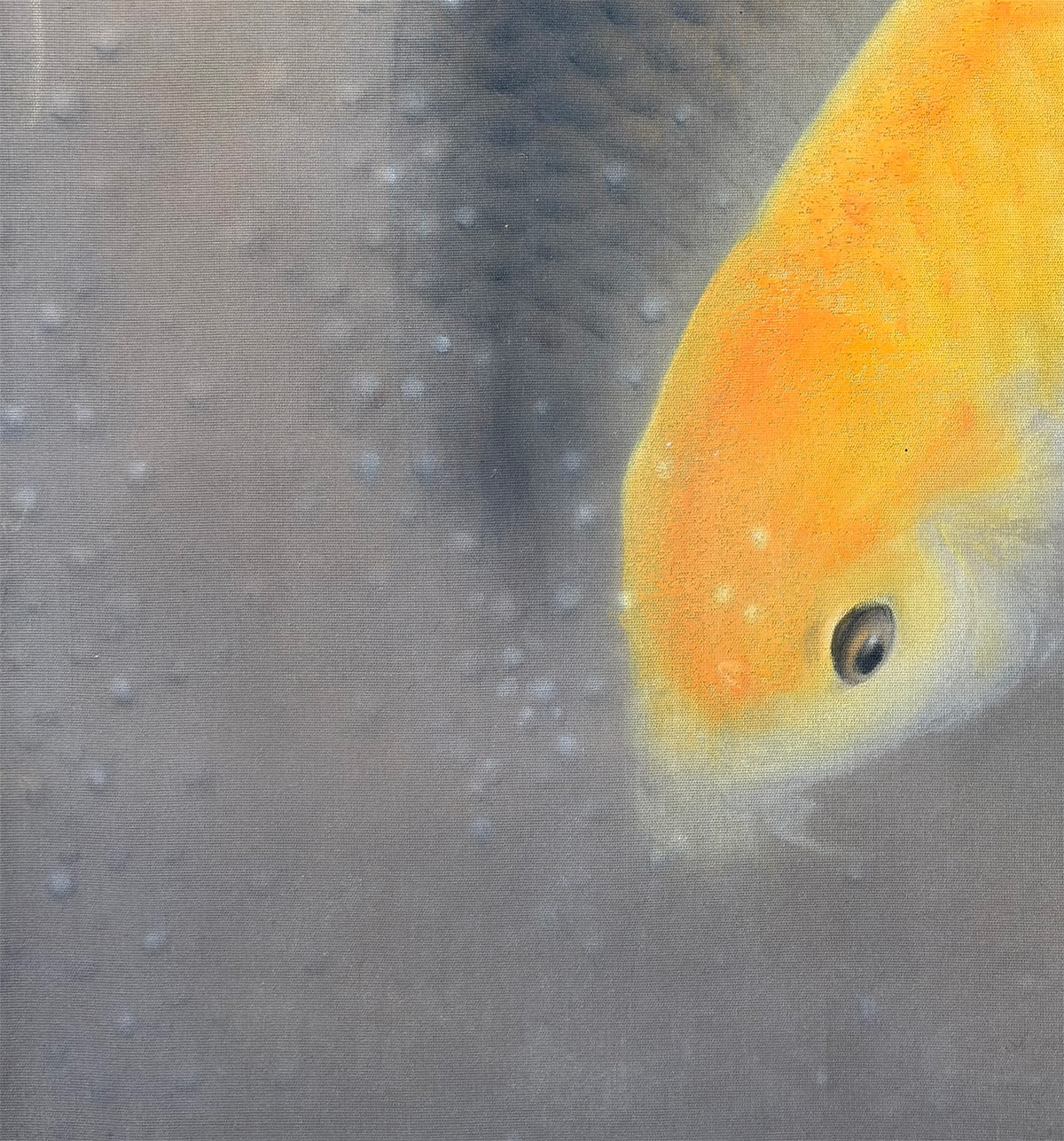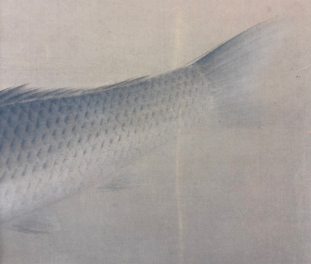 ●五匹の鯉が水中を泳ぐ構図。金鯉が一匹入り、画面に華やぎと吉祥性を添えています。