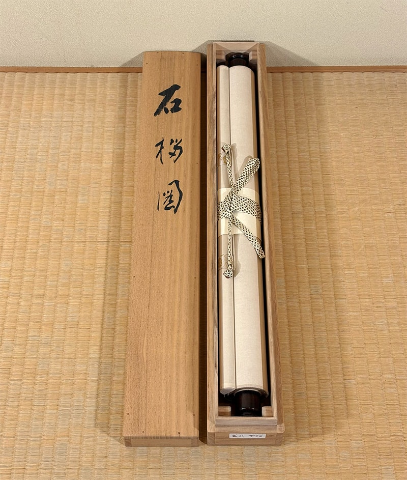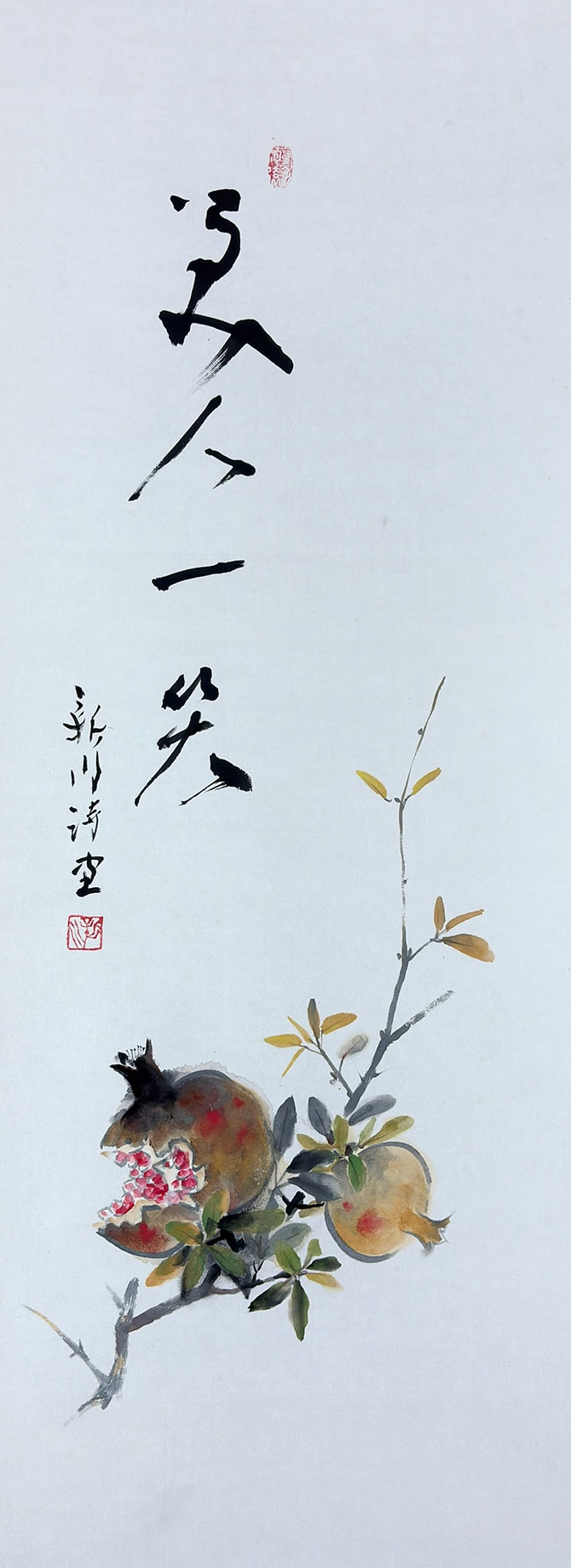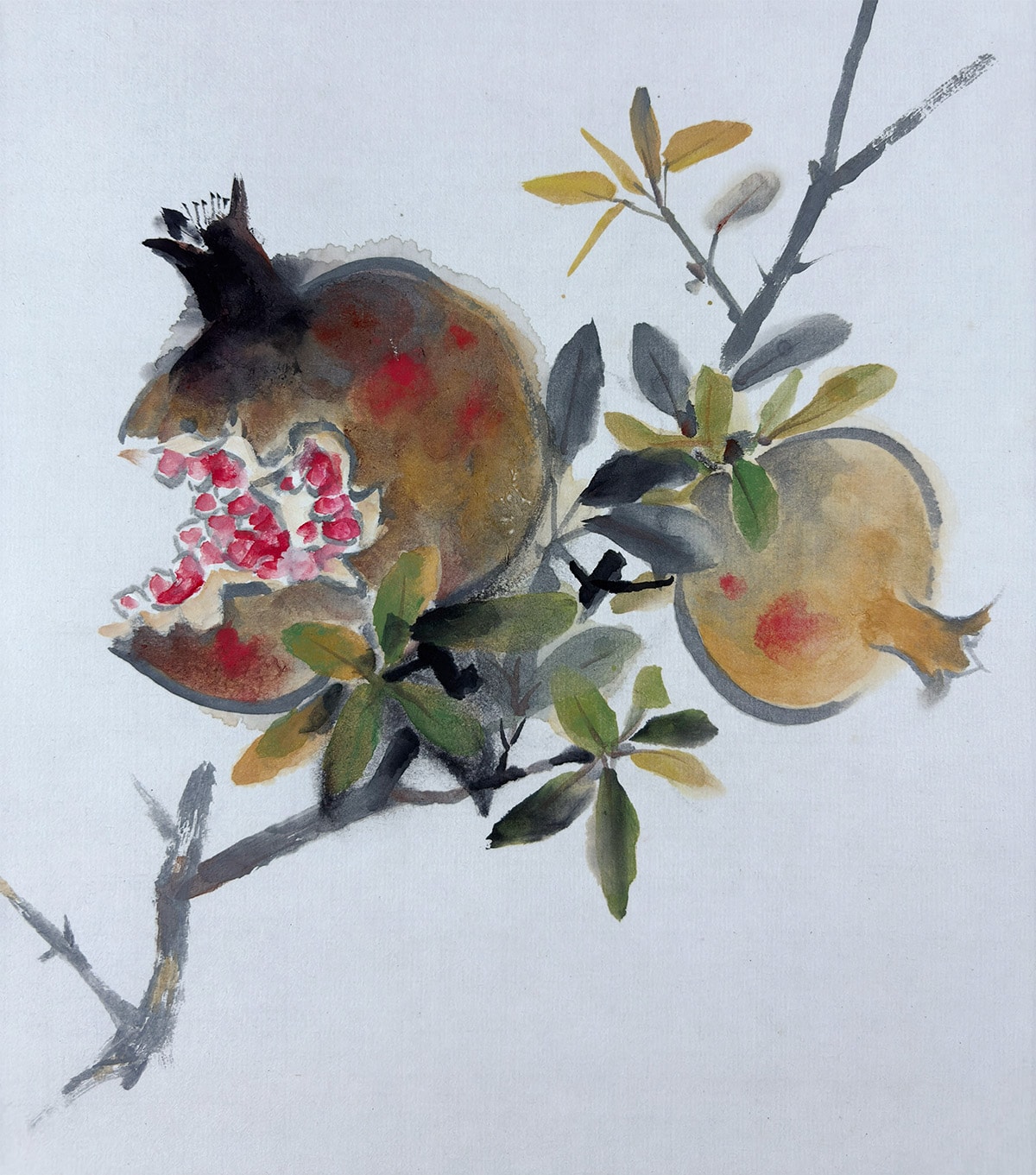 赤い実がはじける柘榴は、しあわせと豊かさのしるし。やさしい色と筆づかいで、静かに力強い美しさを描いた一幅です。