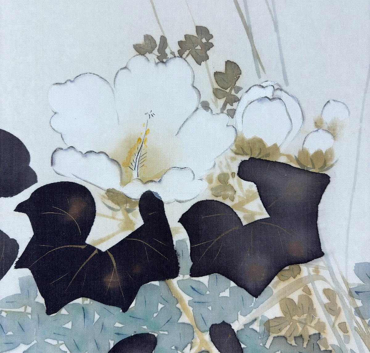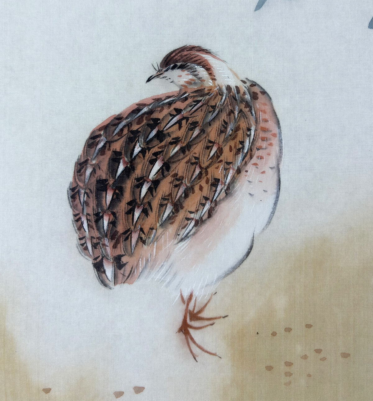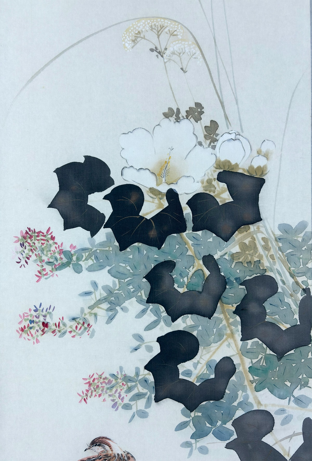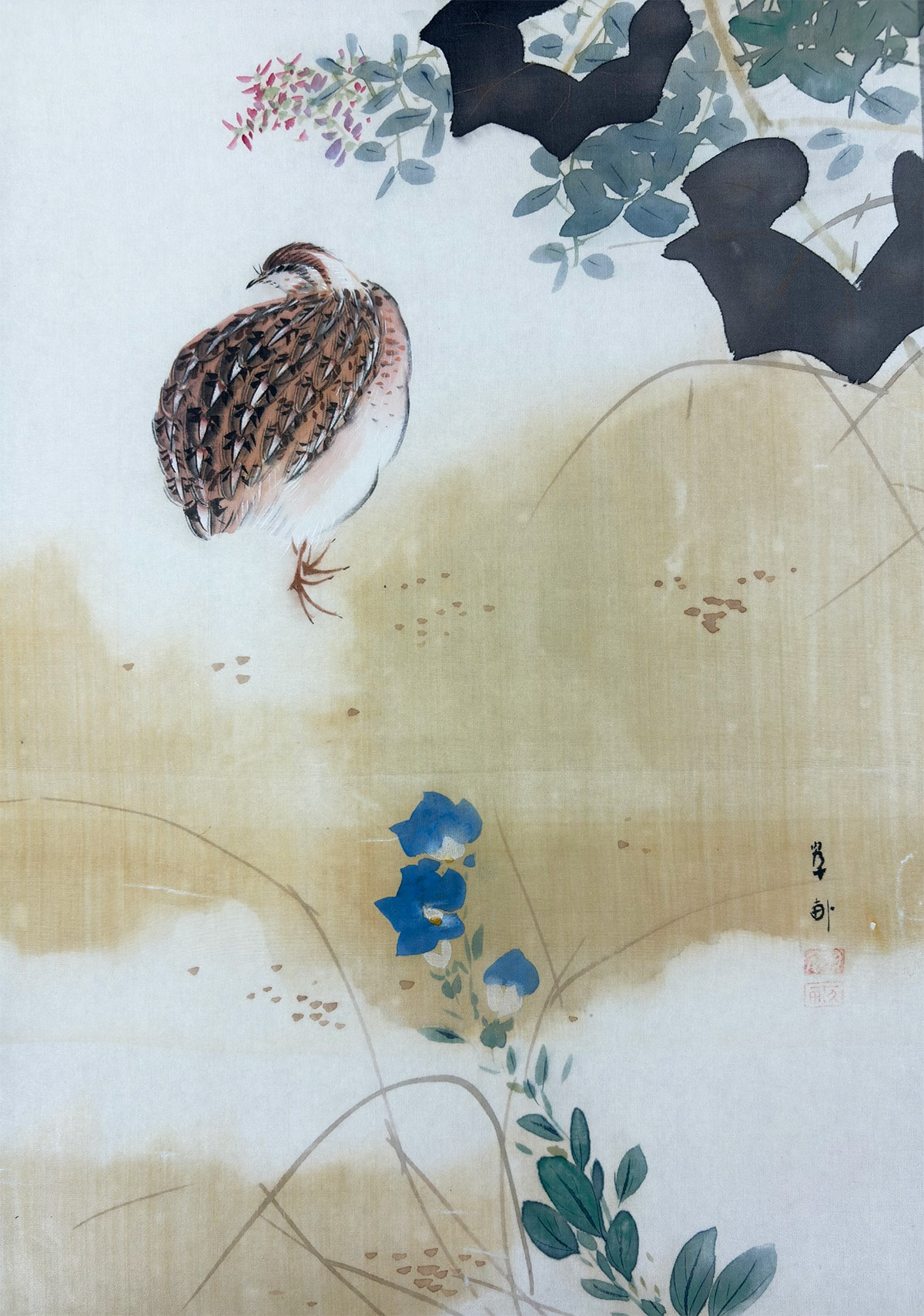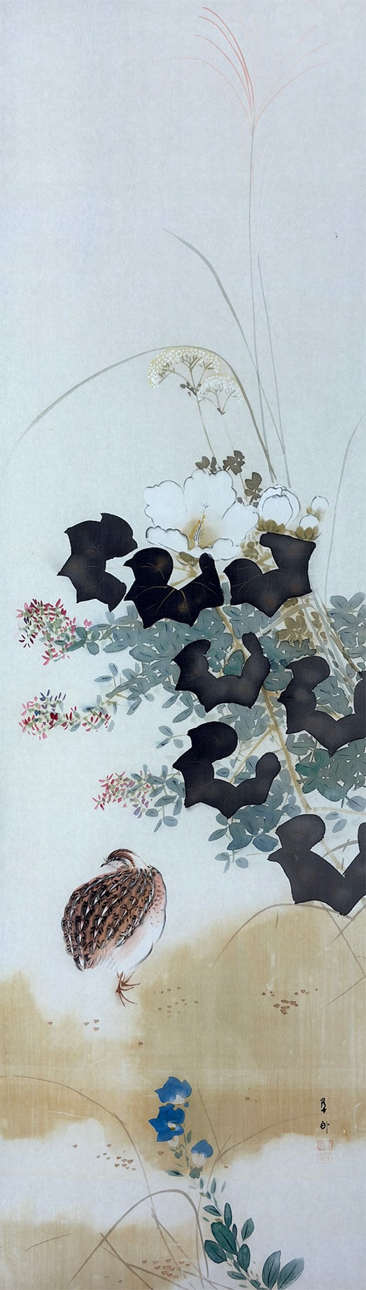 ●鶉が静かにたたずむ秋の草花の中で、桔梗の青紫と芙蓉の白が美しく映え、季節のやさしさと気品を感じさせる作品です。