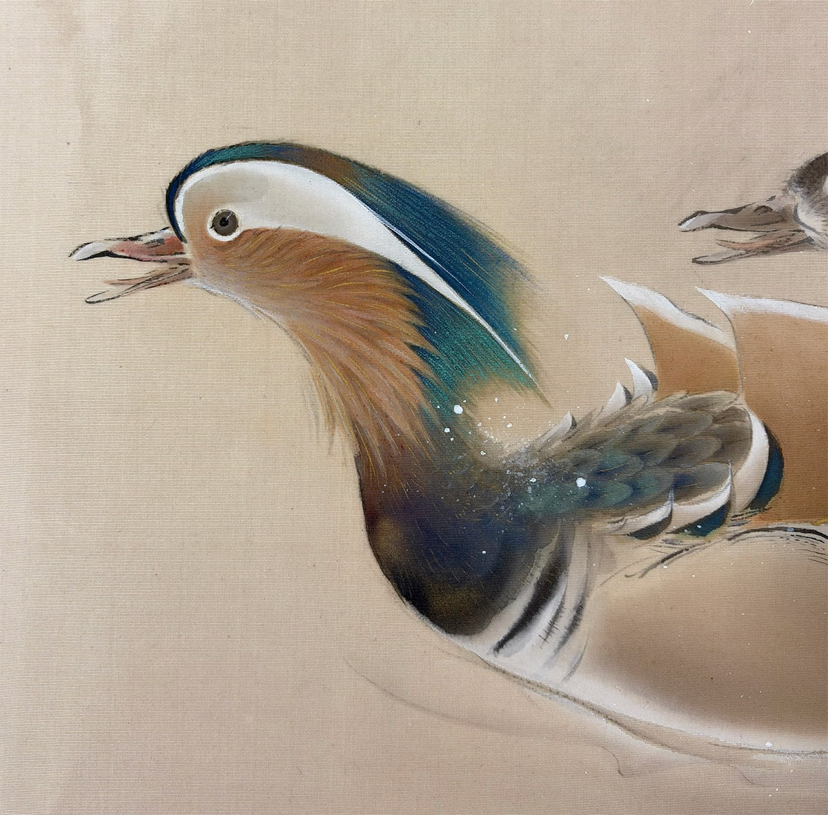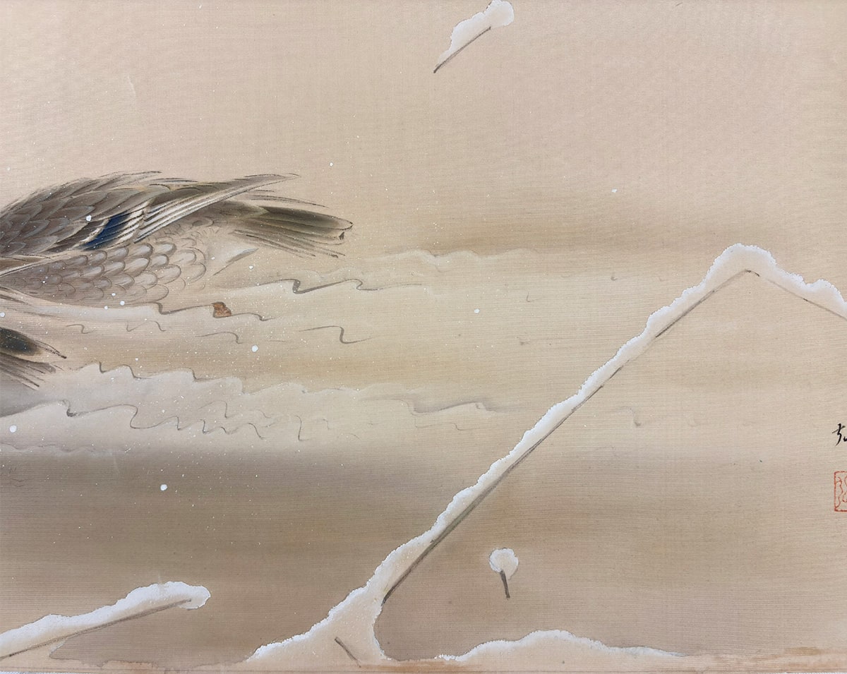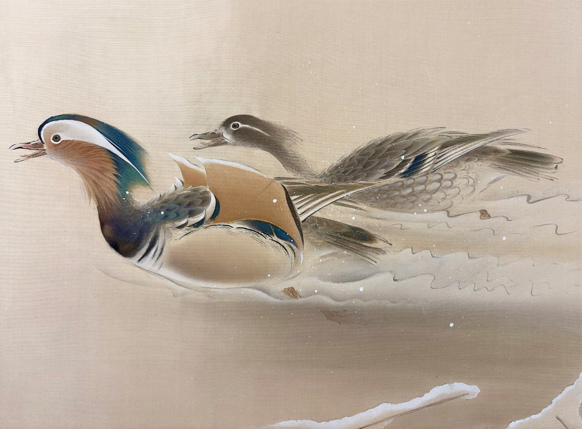 ●鴛鴦は古来より夫婦和合の象徴とされ、雪景の中に描かれることで、冬の静けさの中に温もりと吉祥が宿ります。水面の表現は極めて簡潔ながら、鴛鴦の羽根の描写には細やかな筆致が光り、画面全体に呼吸するような余白の美が漂います。