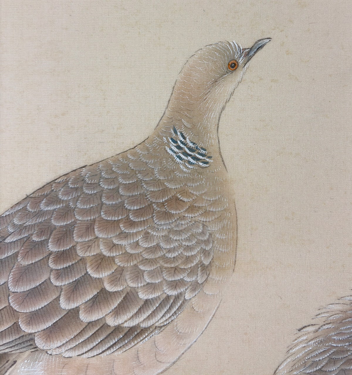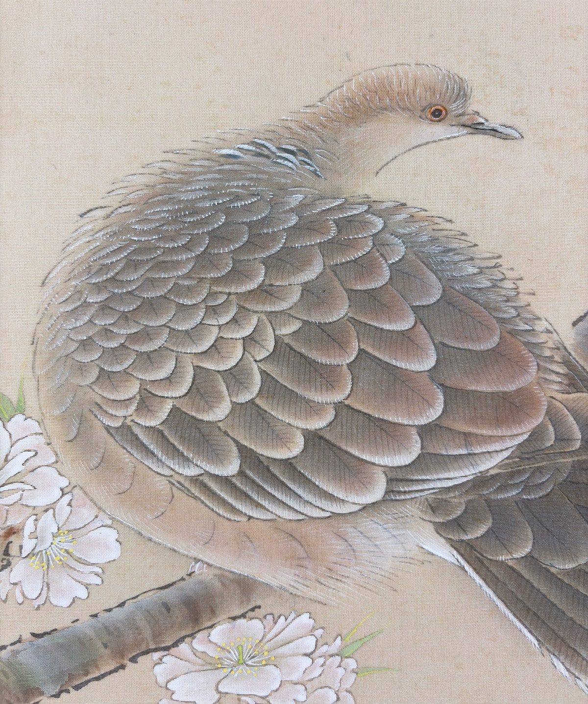 ●本作は、画風・構成・筆致に榊原紫峰の流れを感じさせる一幅です。とくに桜花の描写と鳩の柔らかな造形には、紫峰系花鳥画の静雅な美学が宿ります。