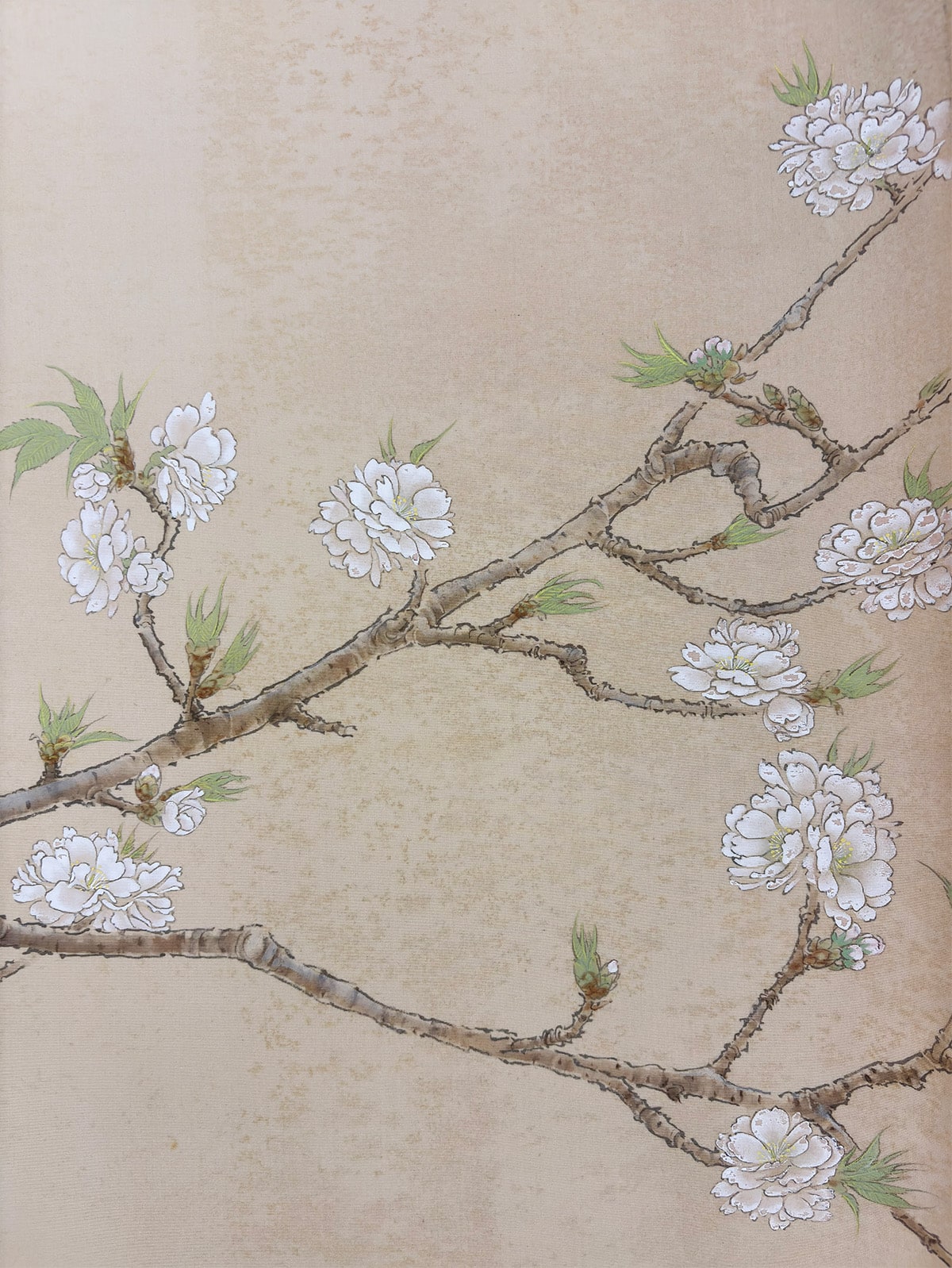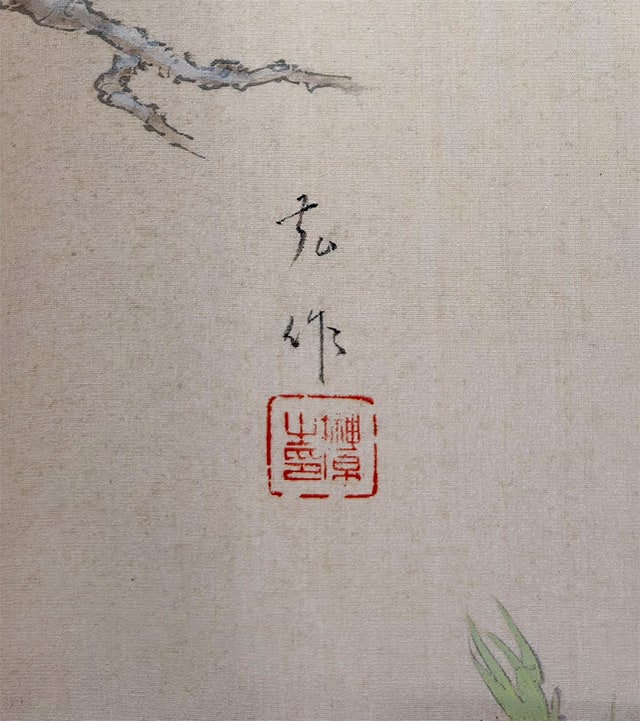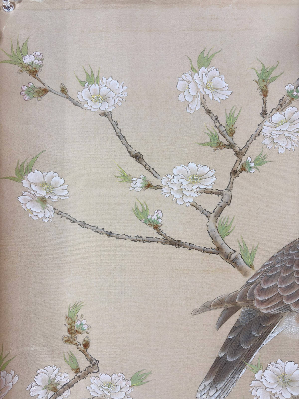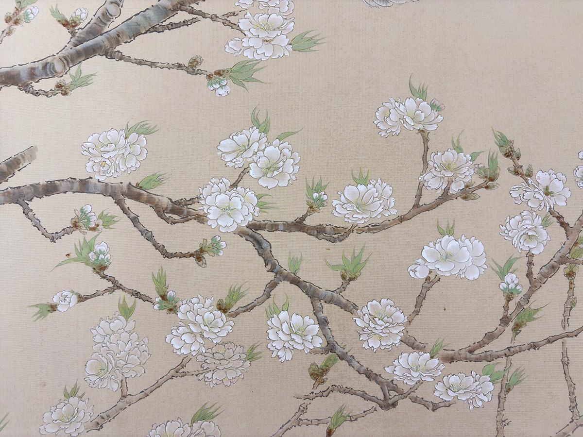 桜花の繊細な描写、鳩の柔らかな造形、そして画面全体に漂う静けさは、紫峰の門下生やその流れを汲む作家に共通する特徴です。とくに春の吉祥を象徴する構成は、紫峰が好んだ題材と重なり、品格ある花鳥画の系譜に位置づけるにふさわしいものといえるでしょう。