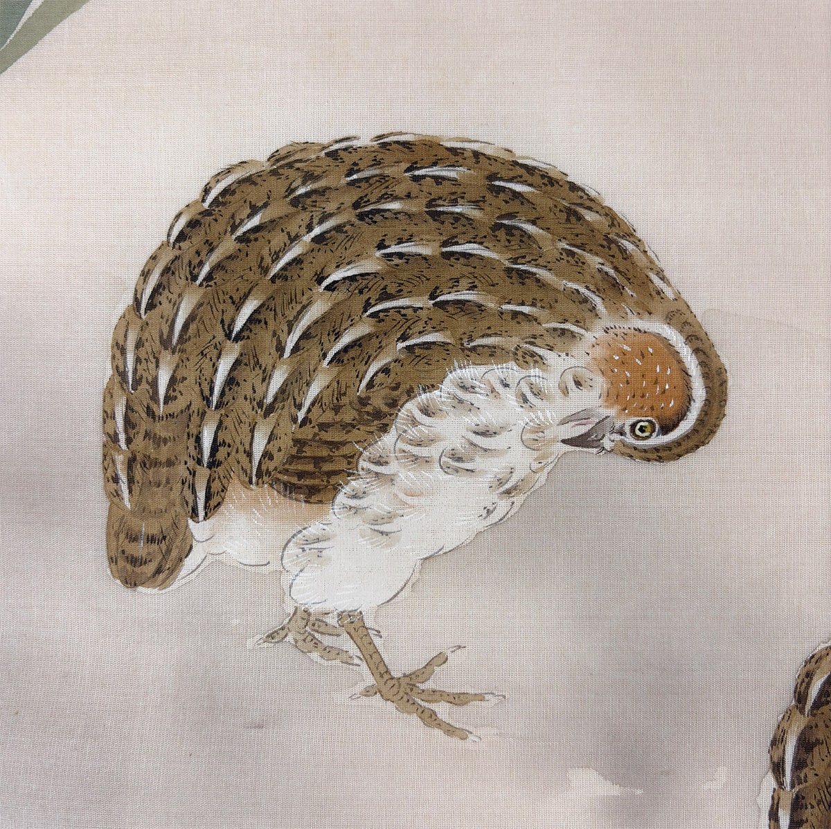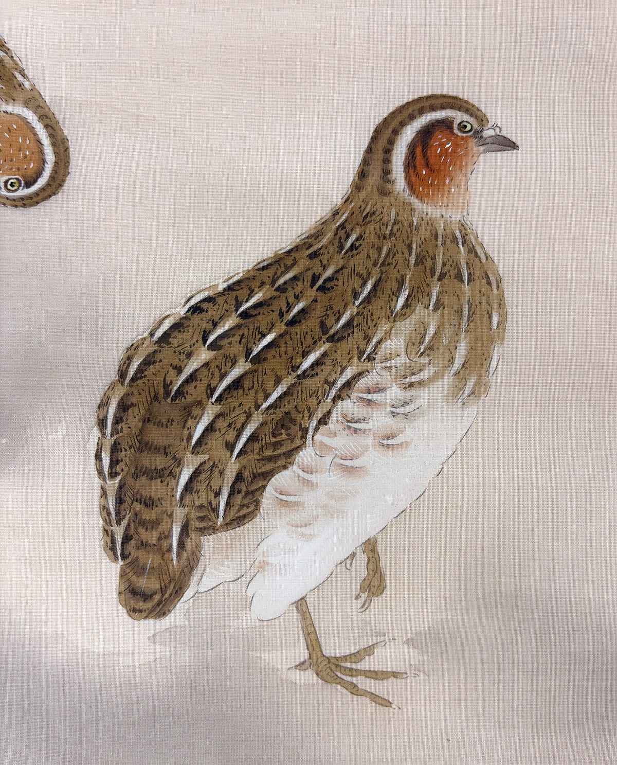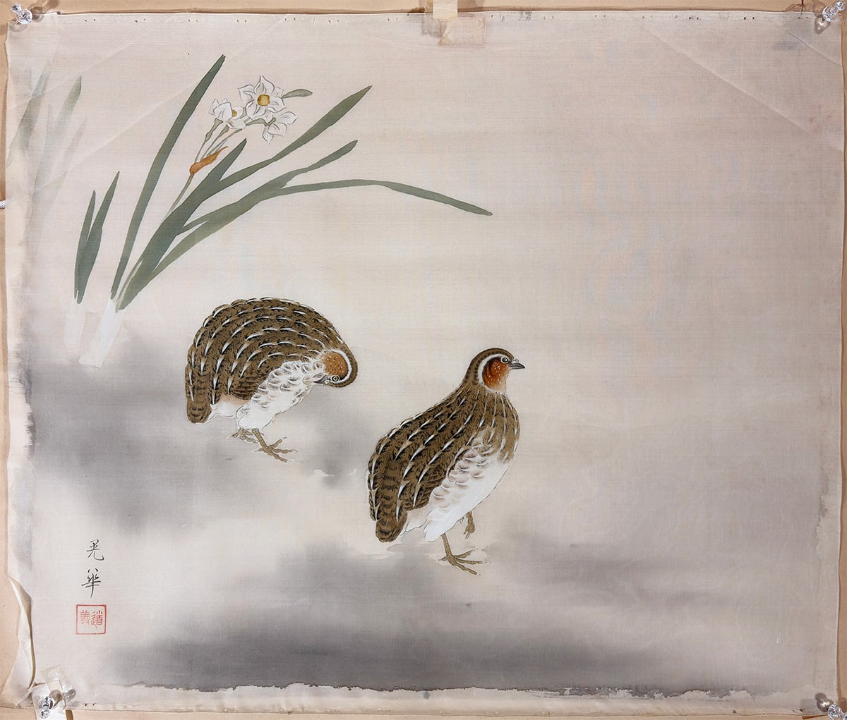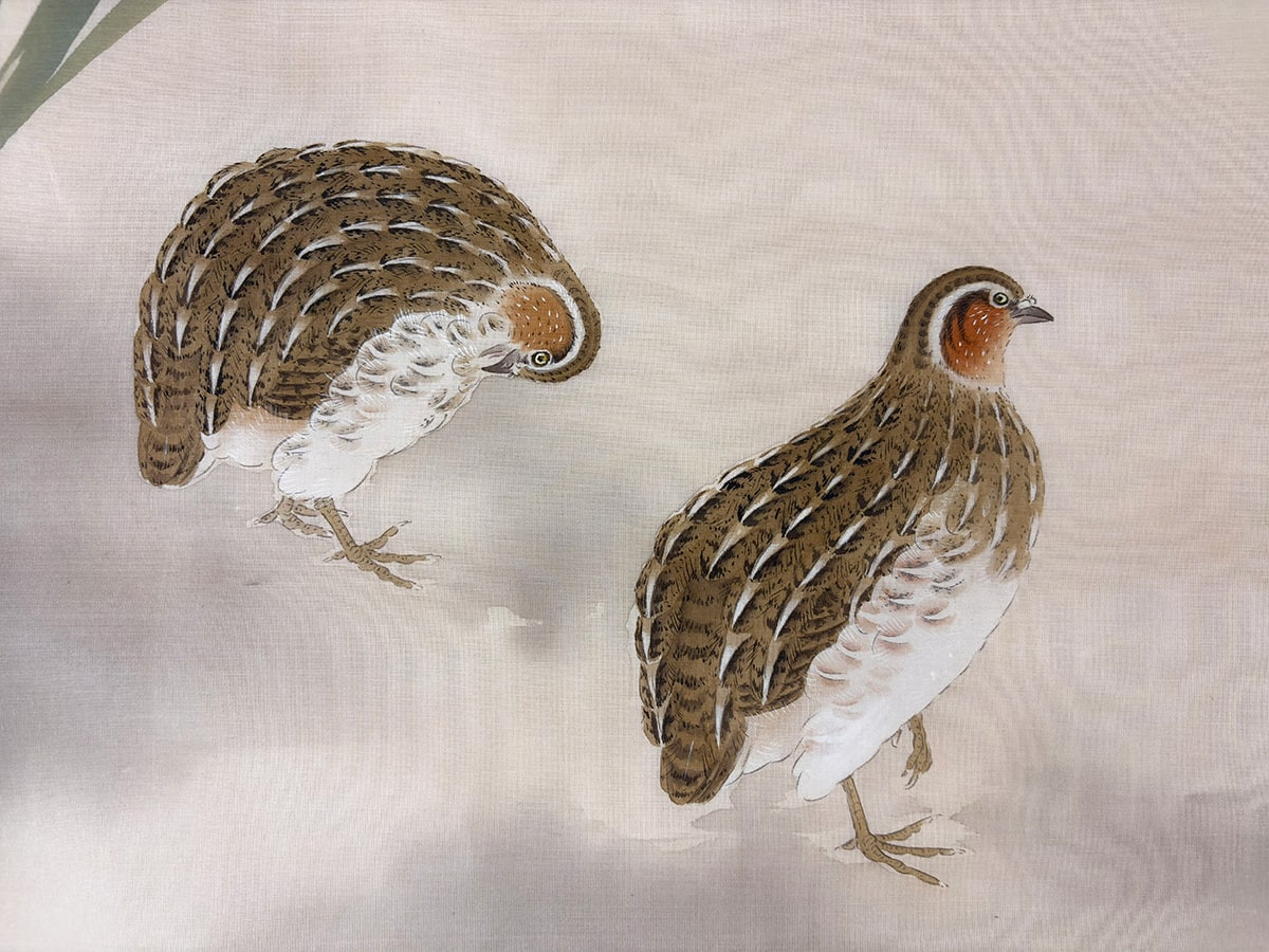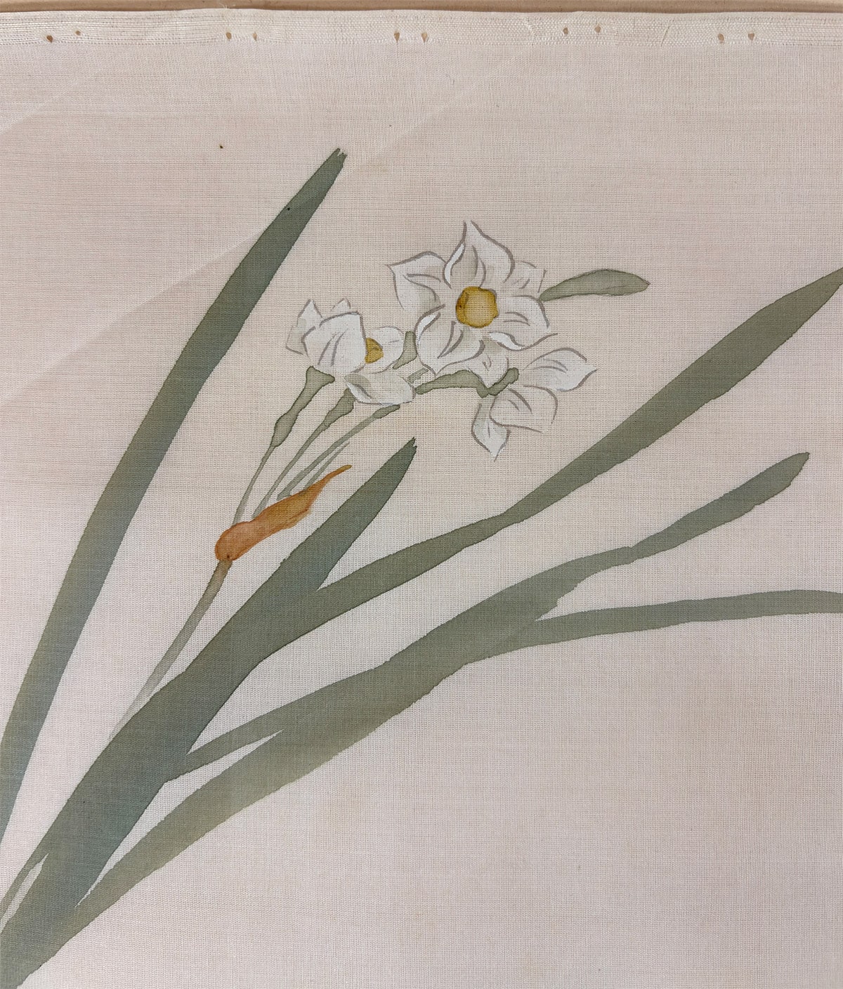 ●若井晃華による本作は、静かに咲く水仙と鶉の佇まいを描いた一幅。冬の静けさの中に、春の兆しをそっと感じさせる構図です。水仙は清廉の象徴、鶉は家庭円満を意味し、穏やかな余白が空間に静謐な彩りを添えます。