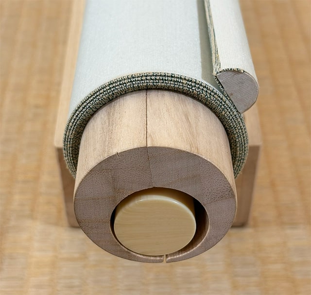 掛軸をしまう時は必ず太巻き芯棒を挟んで巻いてください。