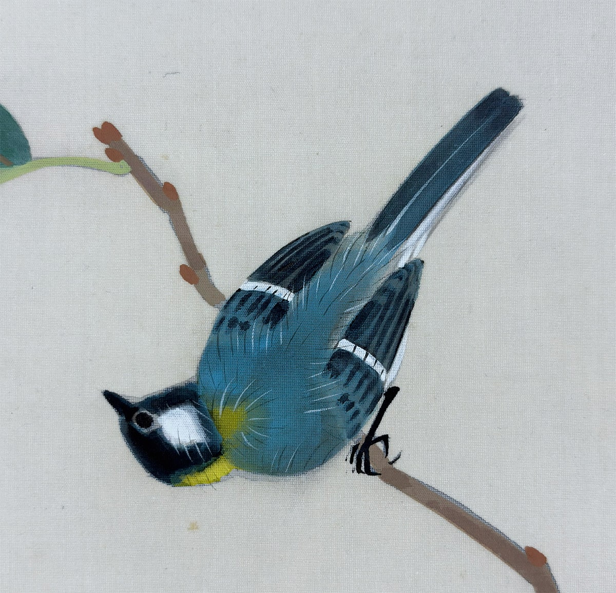 墨線の強弱と絵具の濃淡を巧みに使い分け、羽根のふくらみ・風を受ける質感・動きの予兆を表現。とくに翼の付け根や尾羽には、重ね描きによる立体感が見られます。