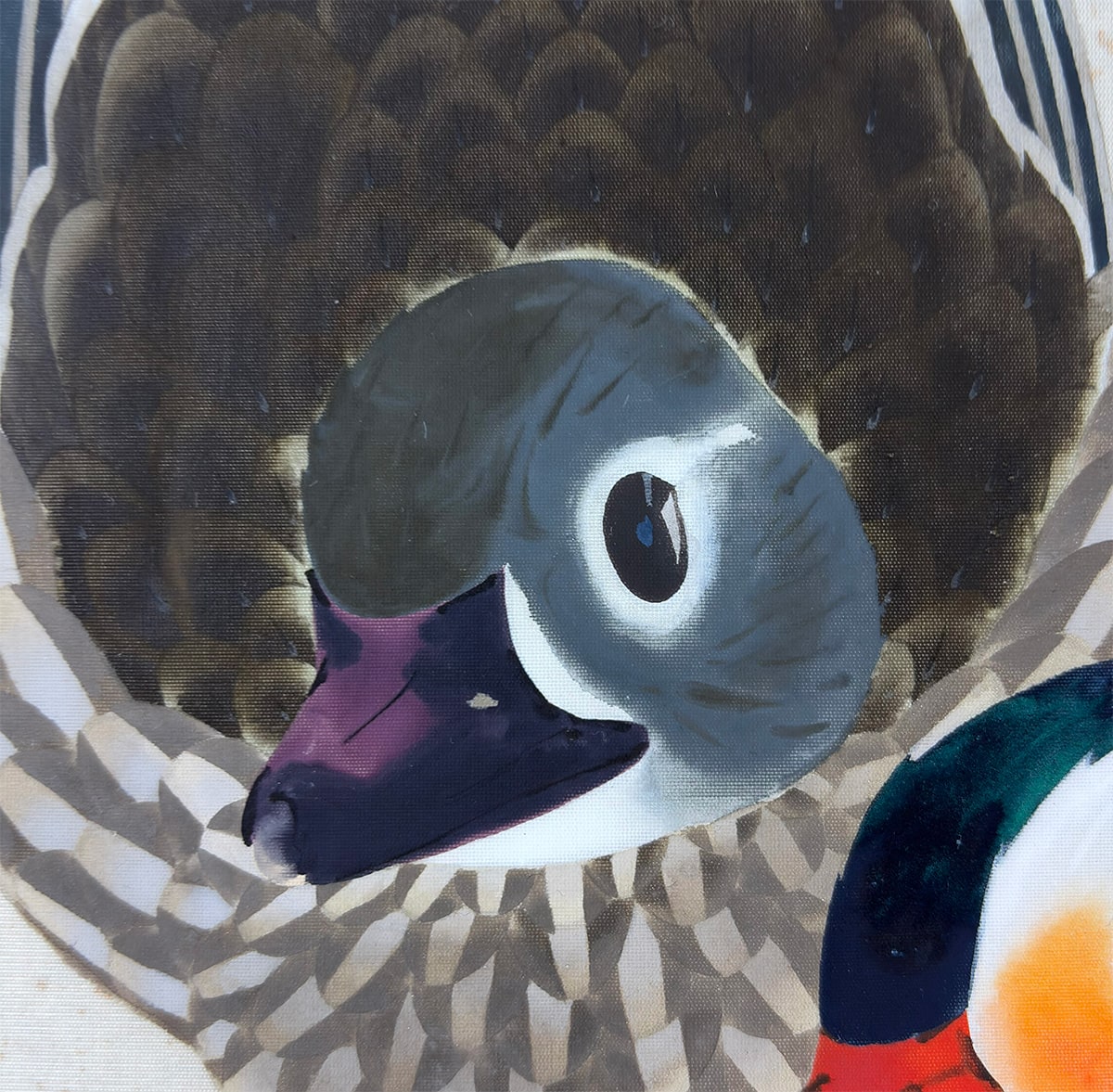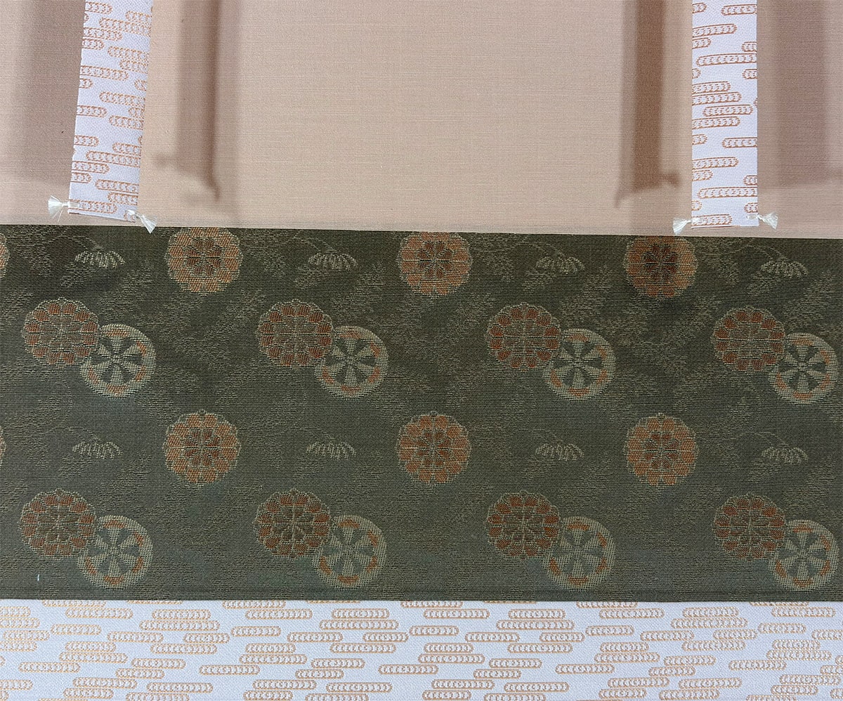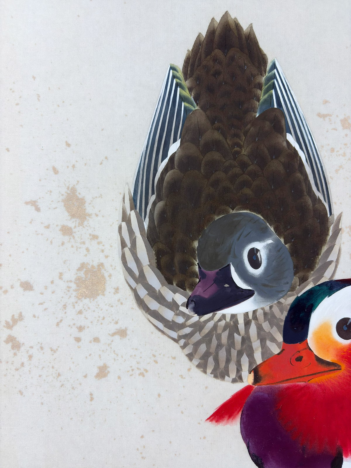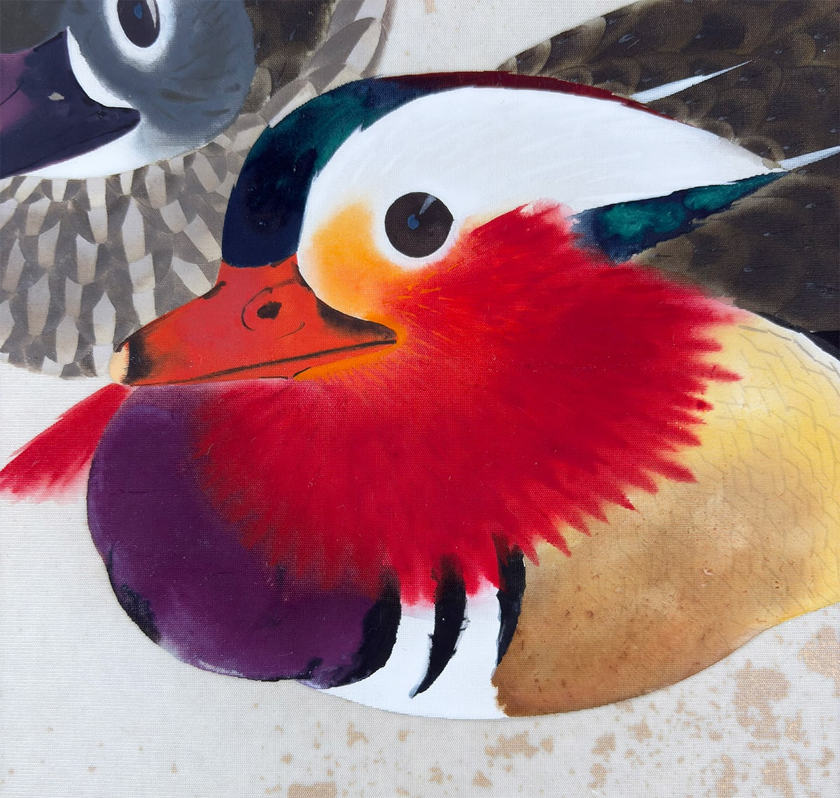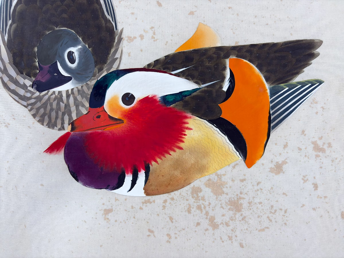 ●裏箔(うらはく)が使われています。これは、絵の裏側に金箔を貼ることで、画面全体にほのかな輝きと奥行きをもたらす技法。直接的な金彩とは異なり、品よく控えめな光が絵に深みを与え、鴛鴦の存在感を静かに引き立てます。
