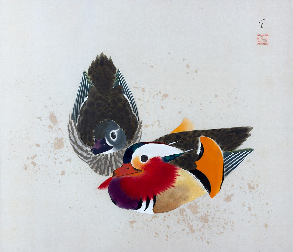 ●仲むつまじく寄り添う二羽の鴛鴦(おしどり)を、細やかな筆づかいで描いた一幅。鮮やかな羽色のオスと、やさしいグレーのメスが、静かな余白の中で美しく映えます。