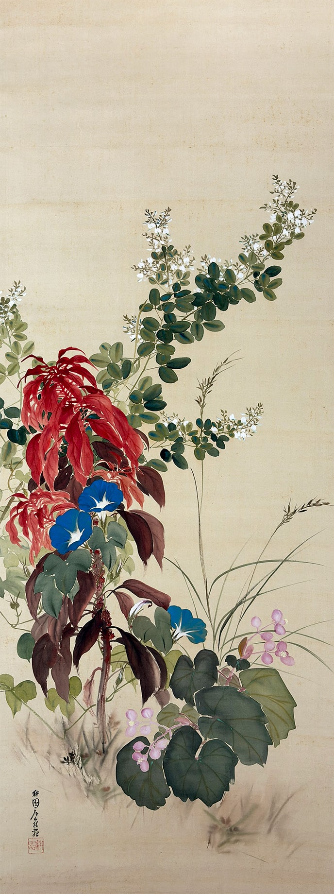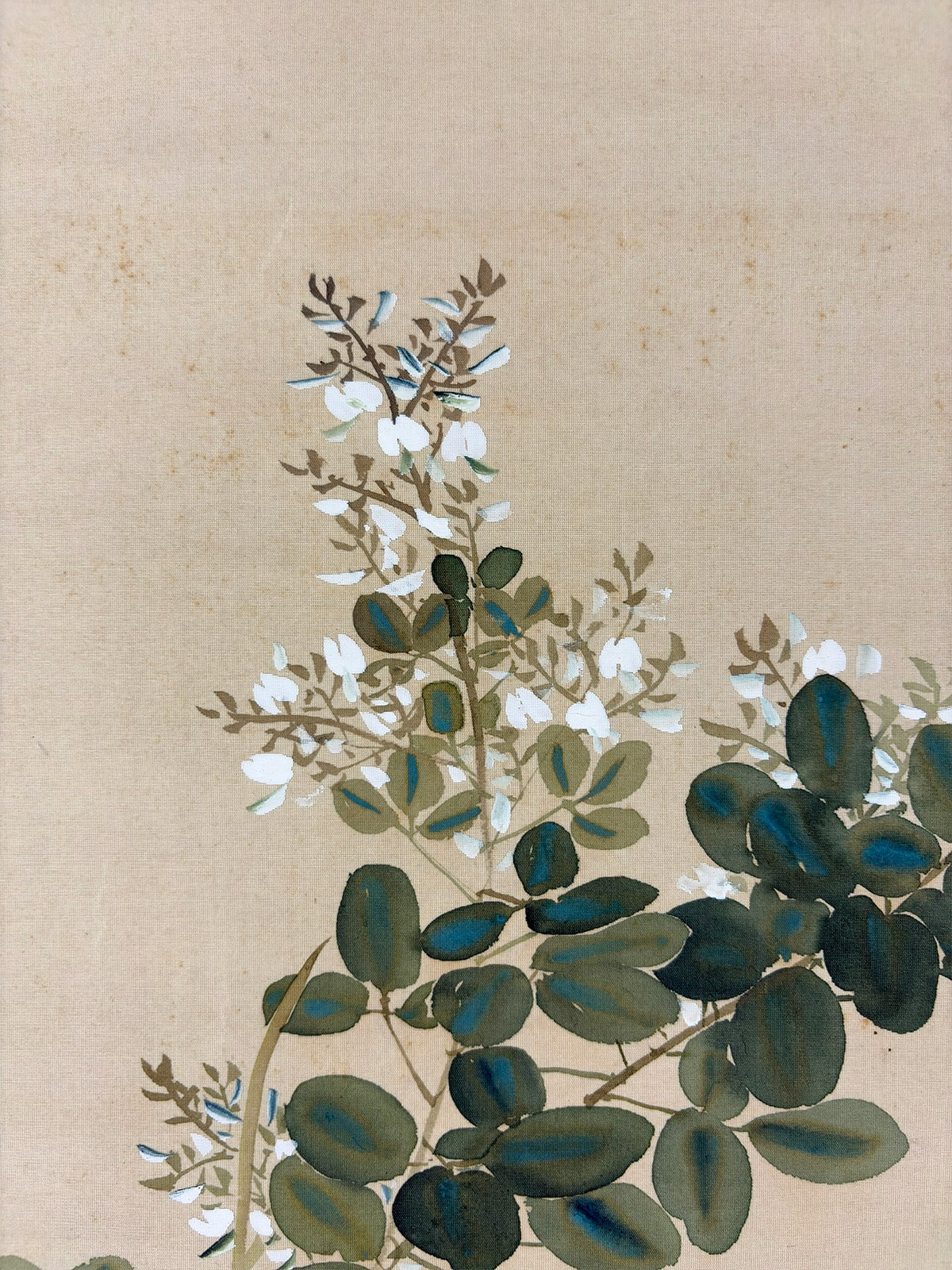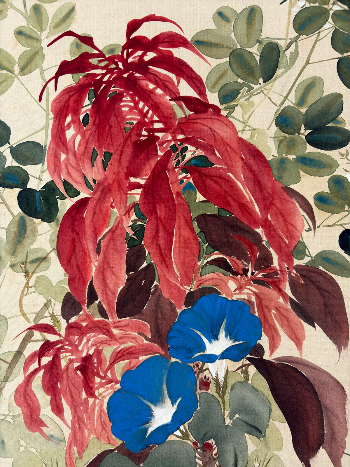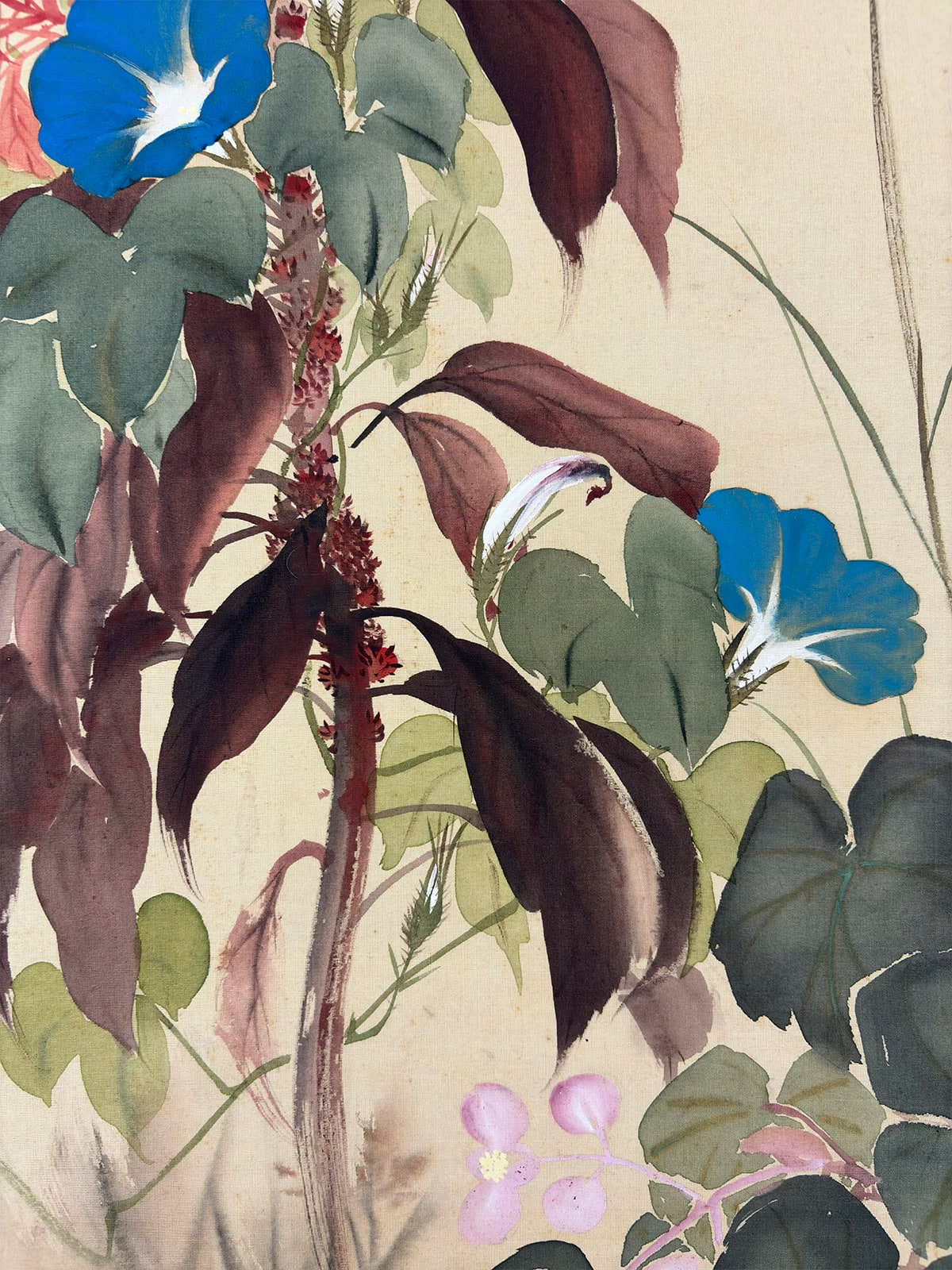 本作《秋草》は、耕園先生が手がけた掛軸で、萩・葉鶏頭・朝顔:秋海棠など、秋の野に咲く草花を繊細な筆致と淡雅な彩色にて描いた一幅です。四条派の写生精神を基調としつつ、余白を活かした構成と静謐な色調が、秋の風趣を静かに湛えております。床の間に掛けた際の「映り」を意識した構成は、茶席や季節の設えにふさわしく、現代の住空間にも自然に調和いたします。