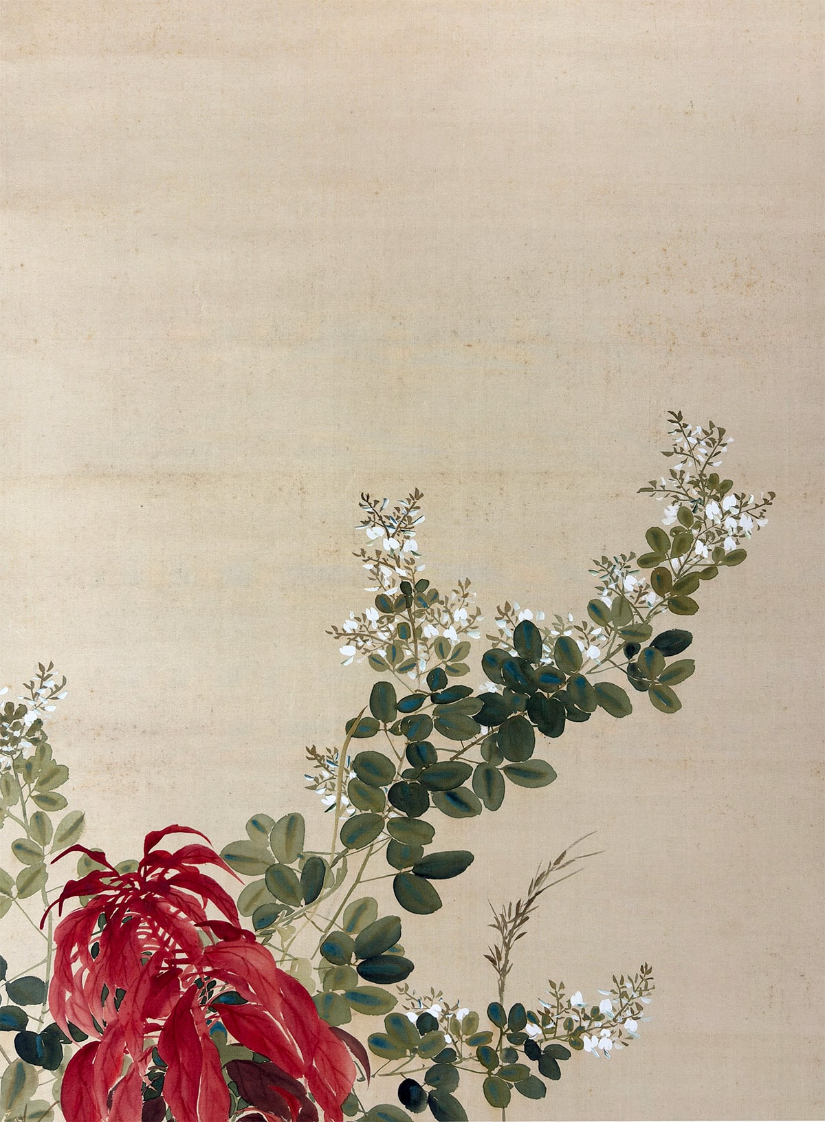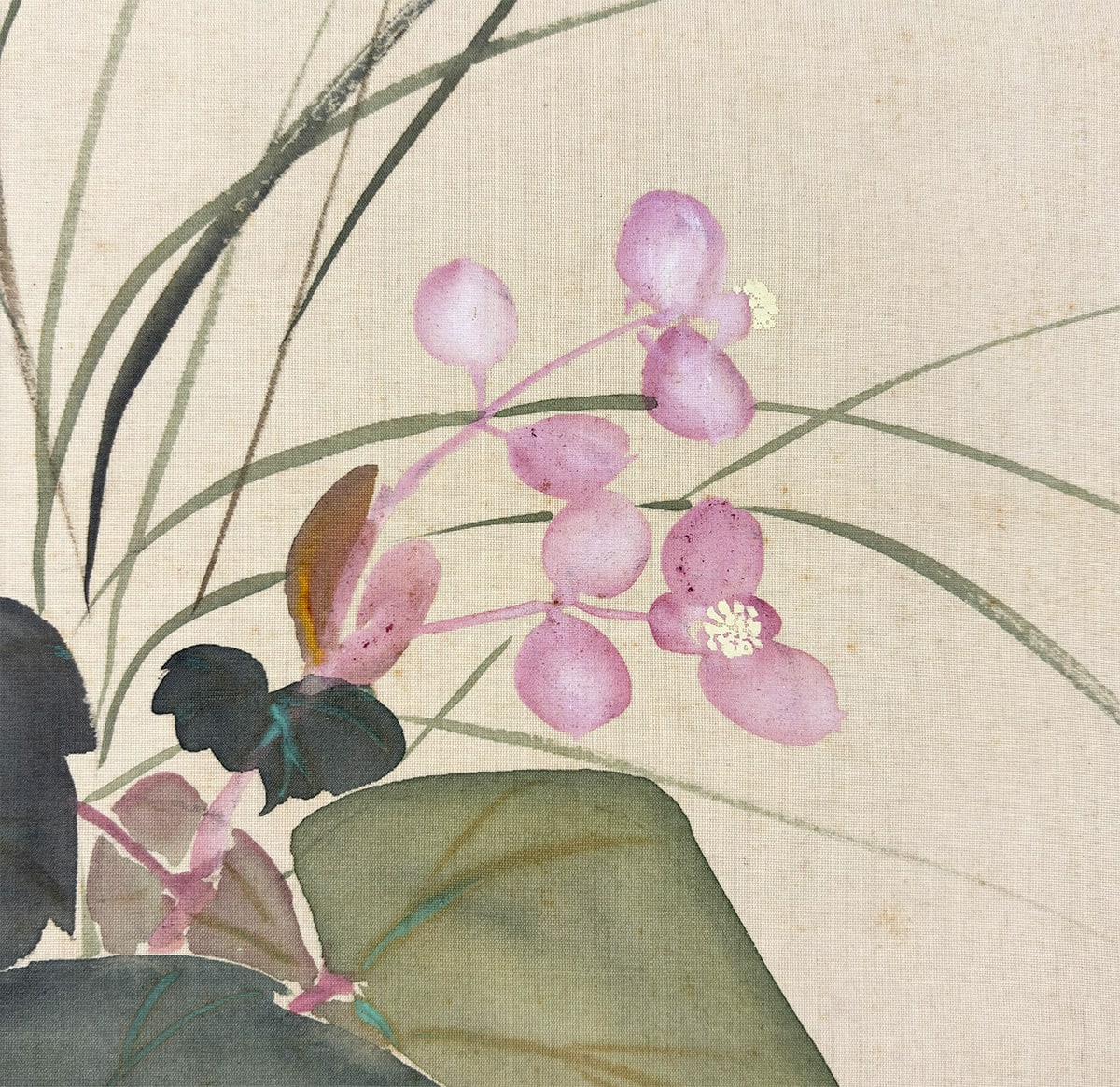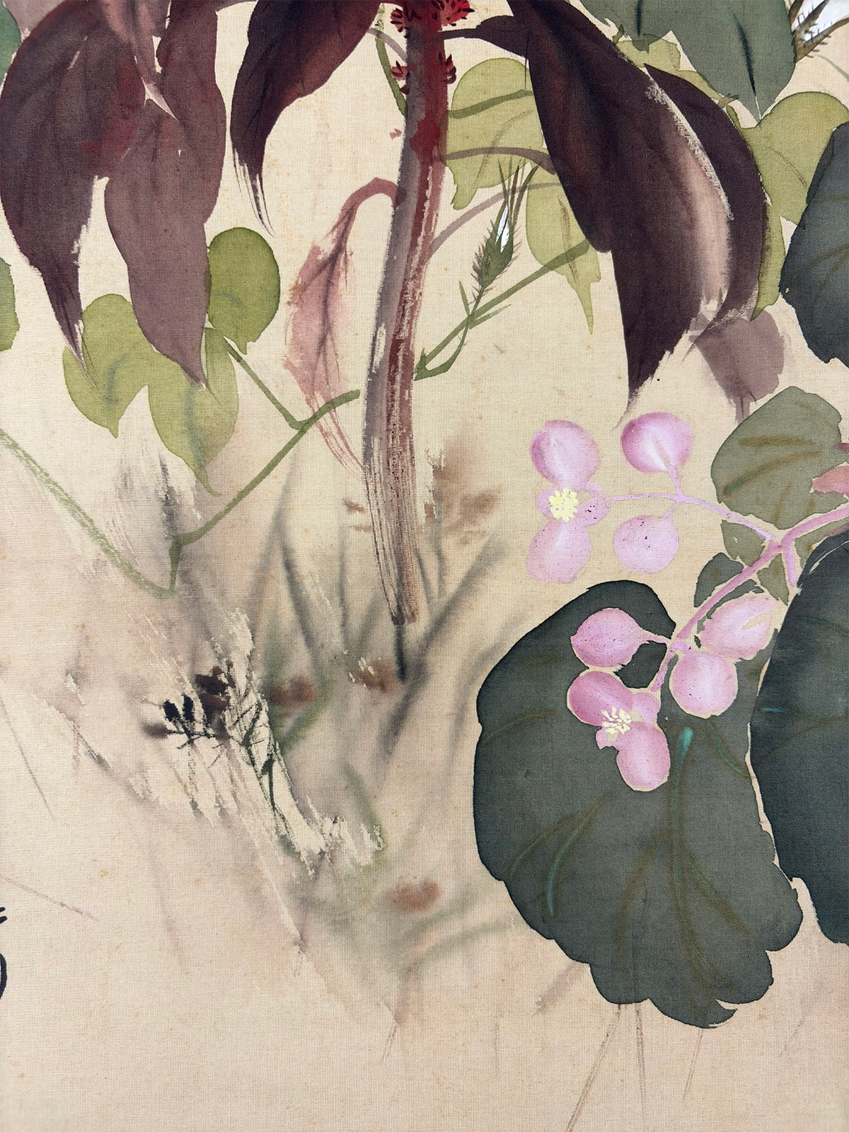 本作《秋草》は、耕園先生が手がけた掛軸で、萩・葉鶏頭・朝顔:秋海棠など、秋の野に咲く草花を繊細な筆致と淡雅な彩色にて描いた一幅です。四条派の写生精神を基調としつつ、余白を活かした構成と静謐な色調が、秋の風趣を静かに湛えております。床の間に掛けた際の「映り」を意識した構成は、茶席や季節の設えにふさわしく、現代の住空間にも自然に調和いたします。