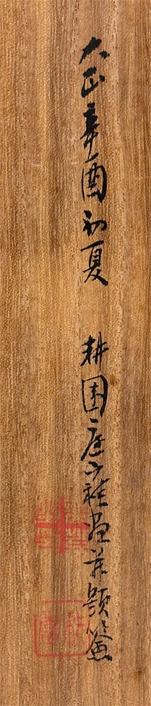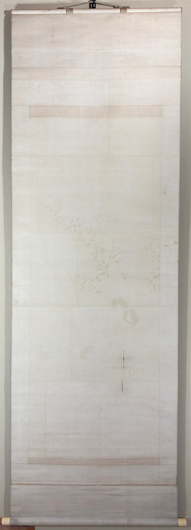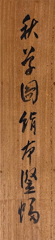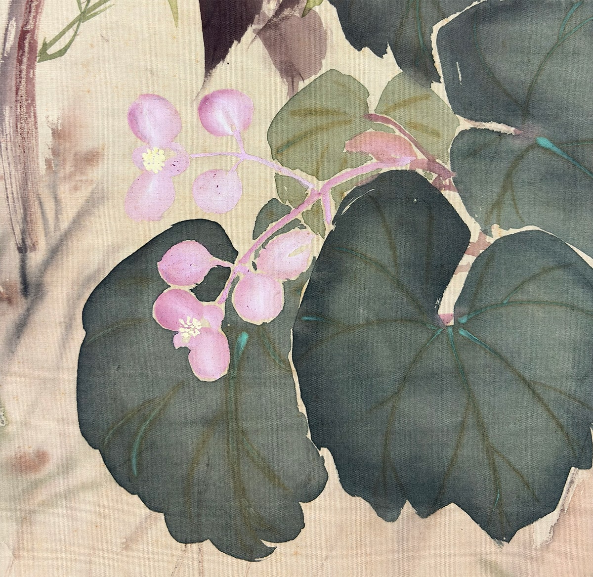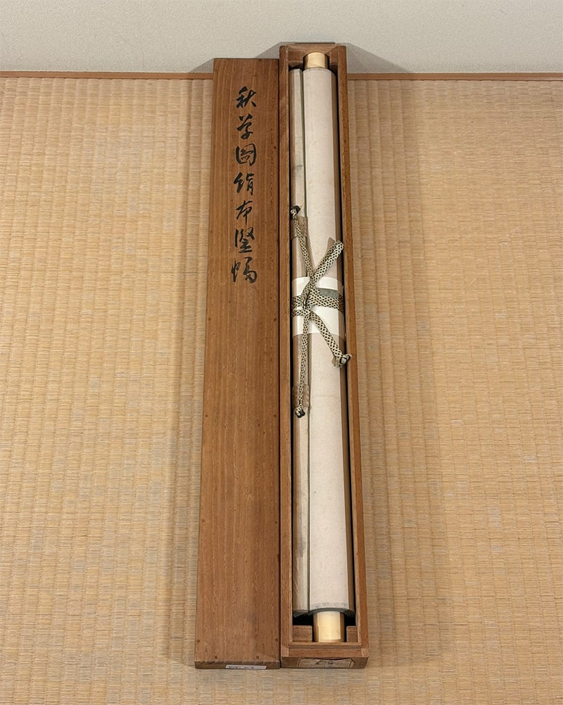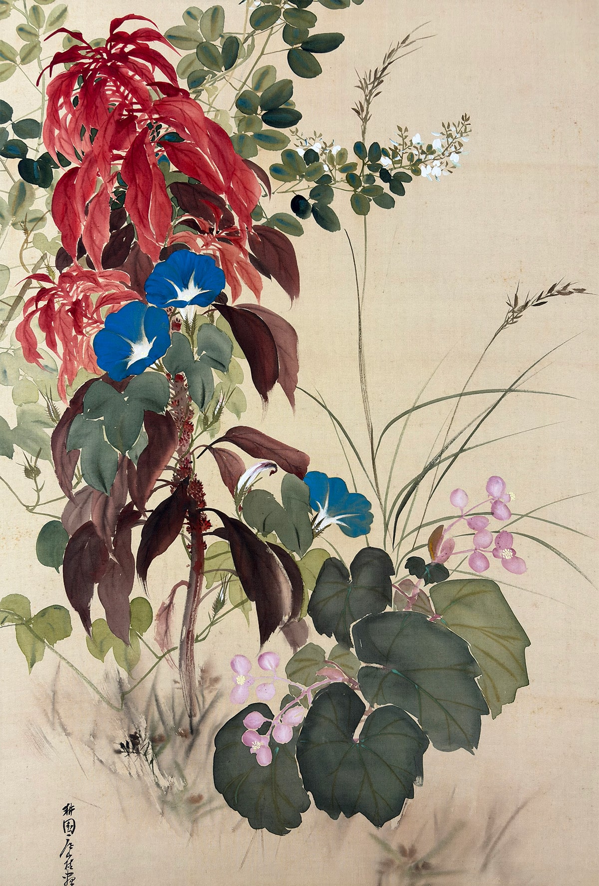 本作《秋草》は、耕園先生が手がけた掛軸で、萩・葉鶏頭・朝顔:秋海棠など、秋の野に咲く草花を繊細な筆致と淡雅な彩色にて描いた一幅です。四条派の写生精神を基調としつつ、余白を活かした構成と静謐な色調が、秋の風趣を静かに湛えております。床の間に掛けた際の「映り」を意識した構成は、茶席や季節の設えにふさわしく、現代の住空間にも自然に調和いたします。