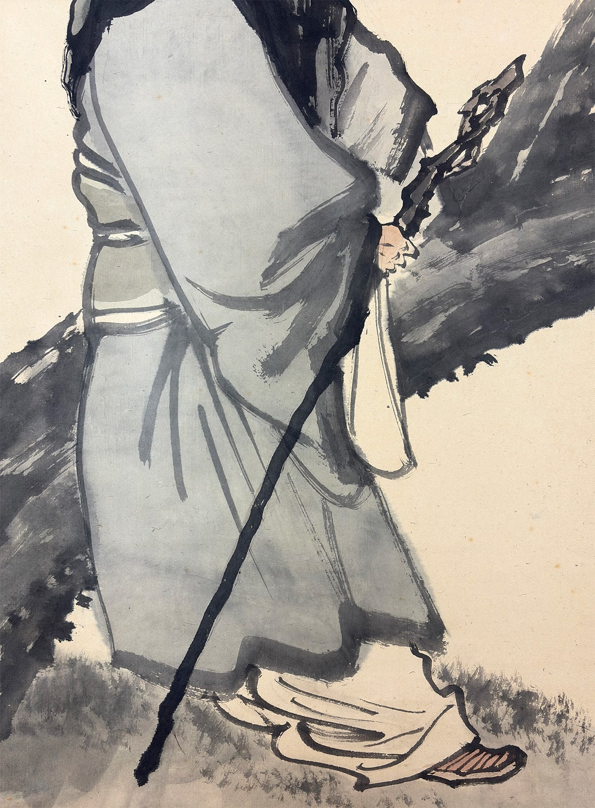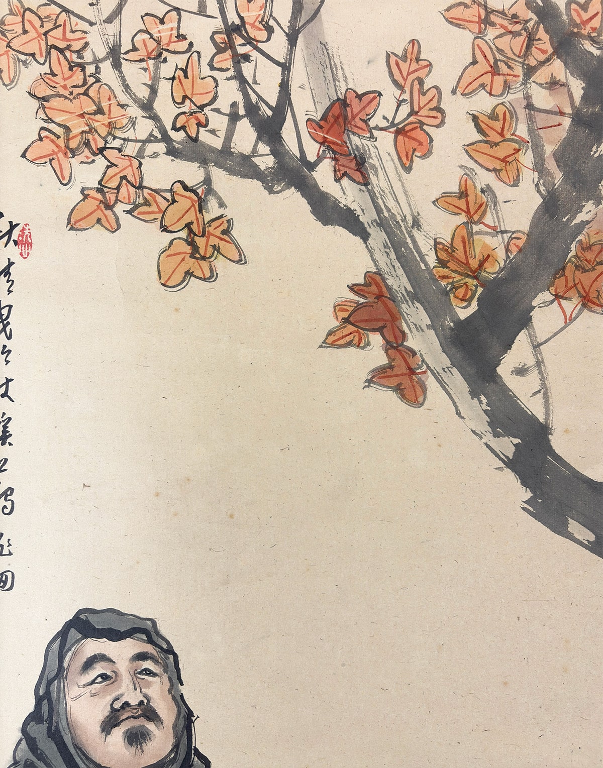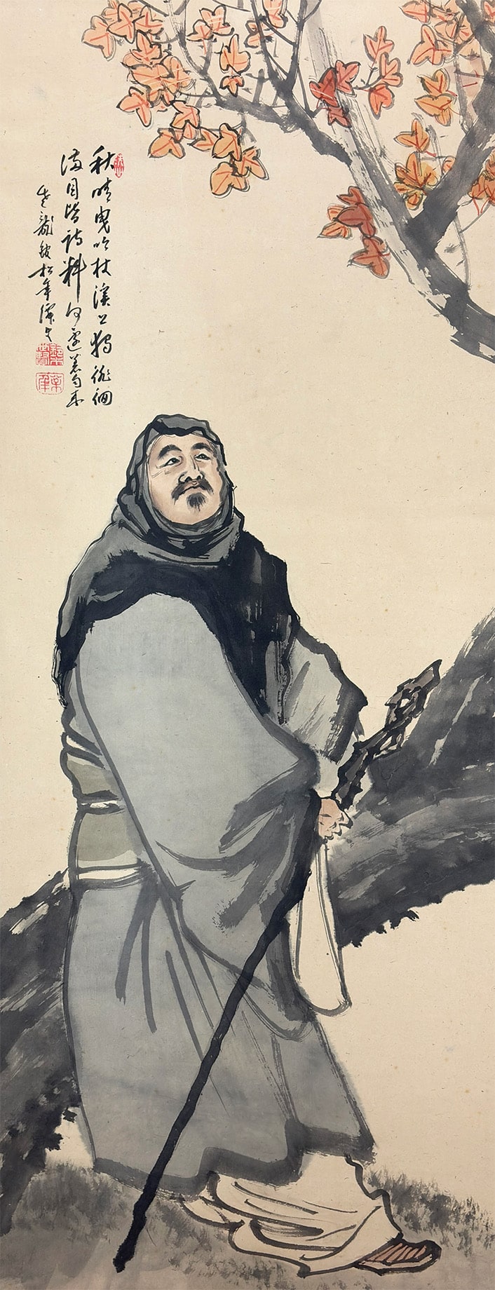 ●秋の渓谷を歩く人物が、紅葉を見上げる静かな一瞬を描いた一幅です。松年先生らしい力強い筆づかいと、淡彩のやわらかな色合いが調和し、自然の中で心を澄ませるような雰囲気が漂っています。人物は陶淵明や蘇東坡を思わせる文人風の姿で、季節の移ろいと内面の思索が重ねられています。