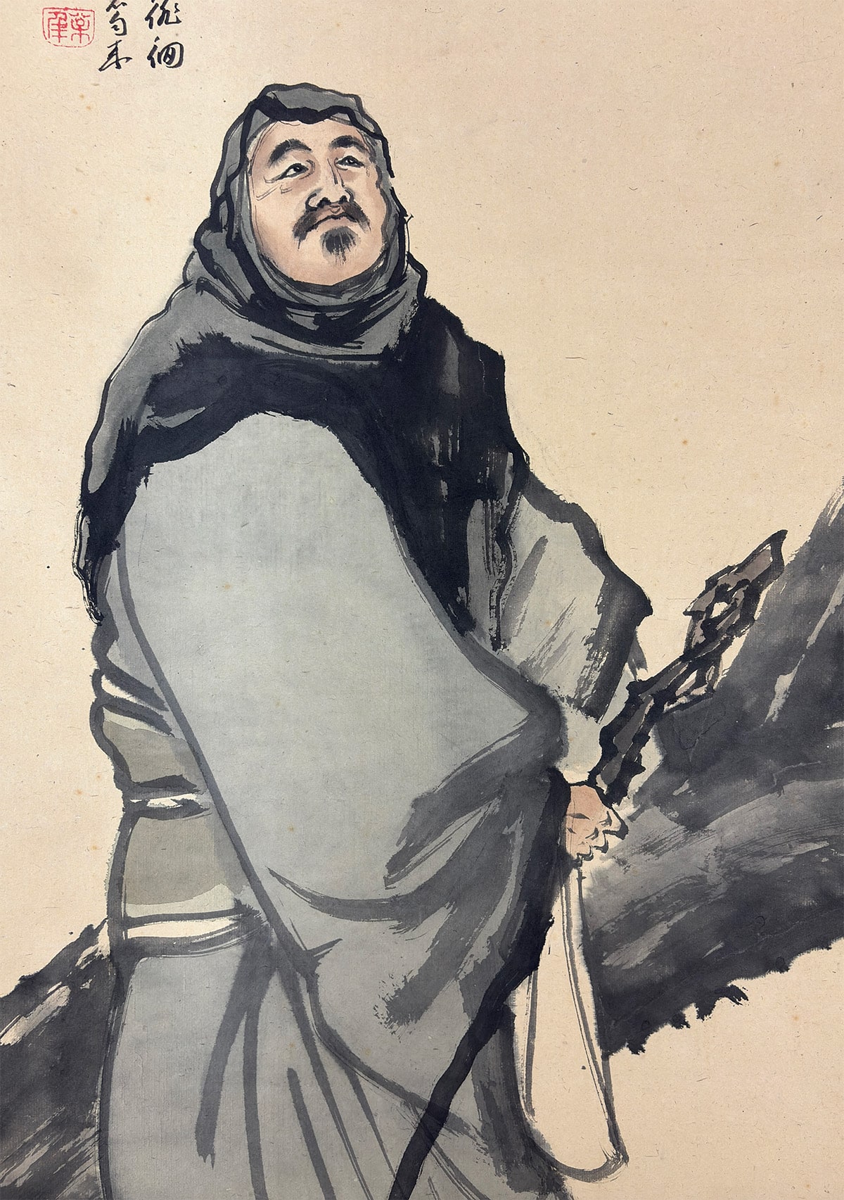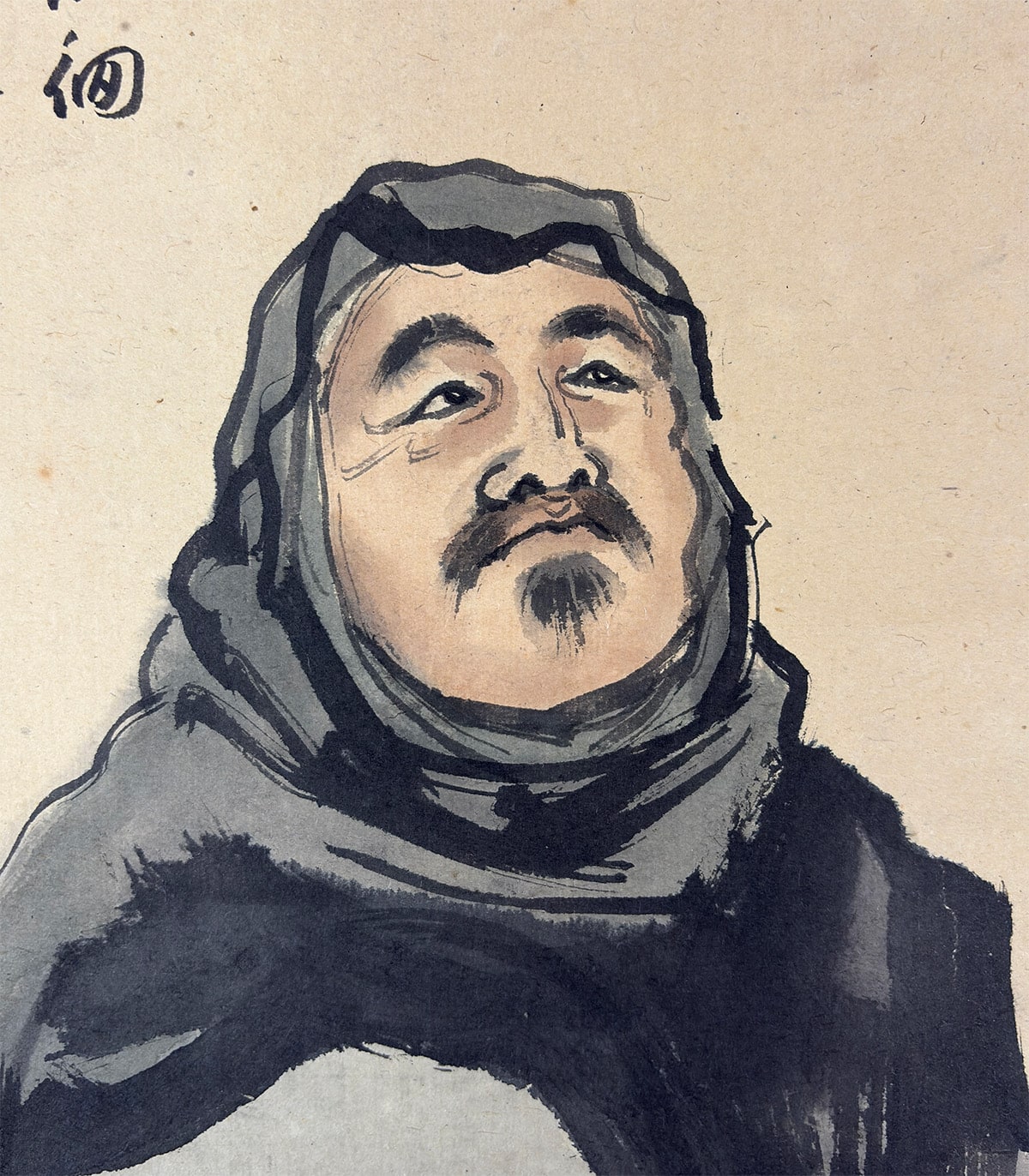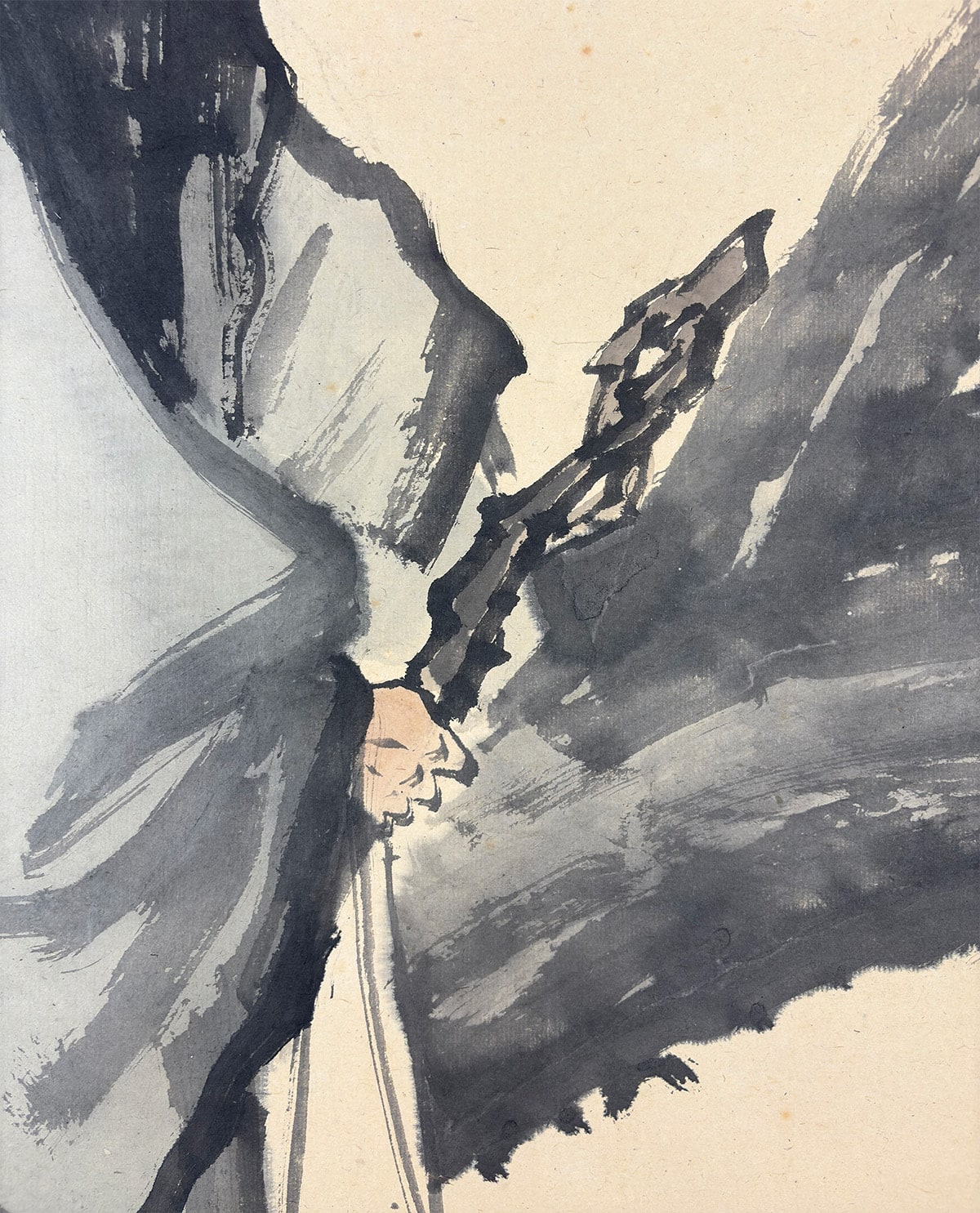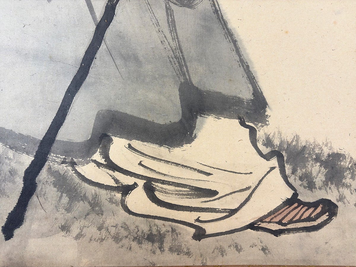 ●秋の渓谷を歩く人物が、紅葉を見上げる静かな一瞬を描いた一幅です。松年先生らしい力強い筆づかいと、淡彩のやわらかな色合いが調和し、自然の中で心を澄ませるような雰囲気が漂っています。人物は陶淵明や蘇東坡を思わせる文人風の姿で、季節の移ろいと内面の思索が重ねられています。