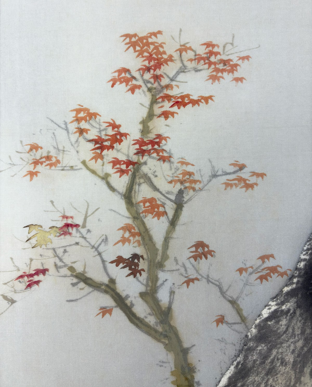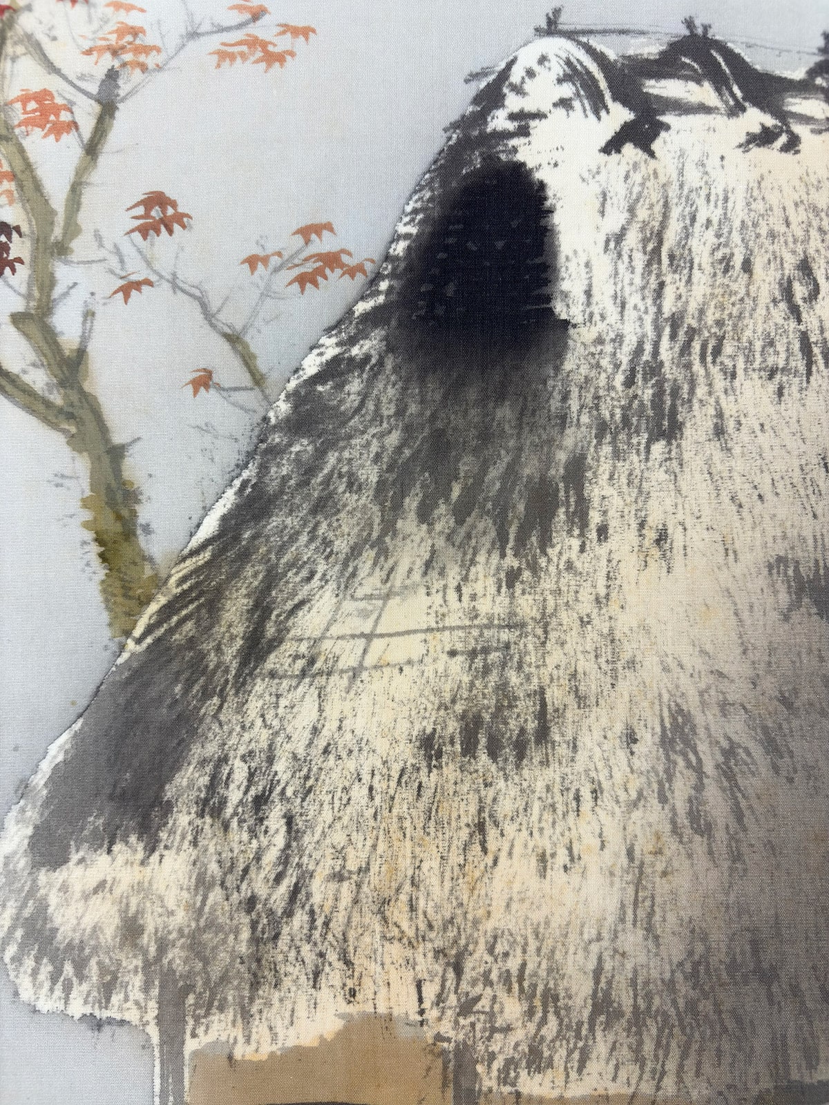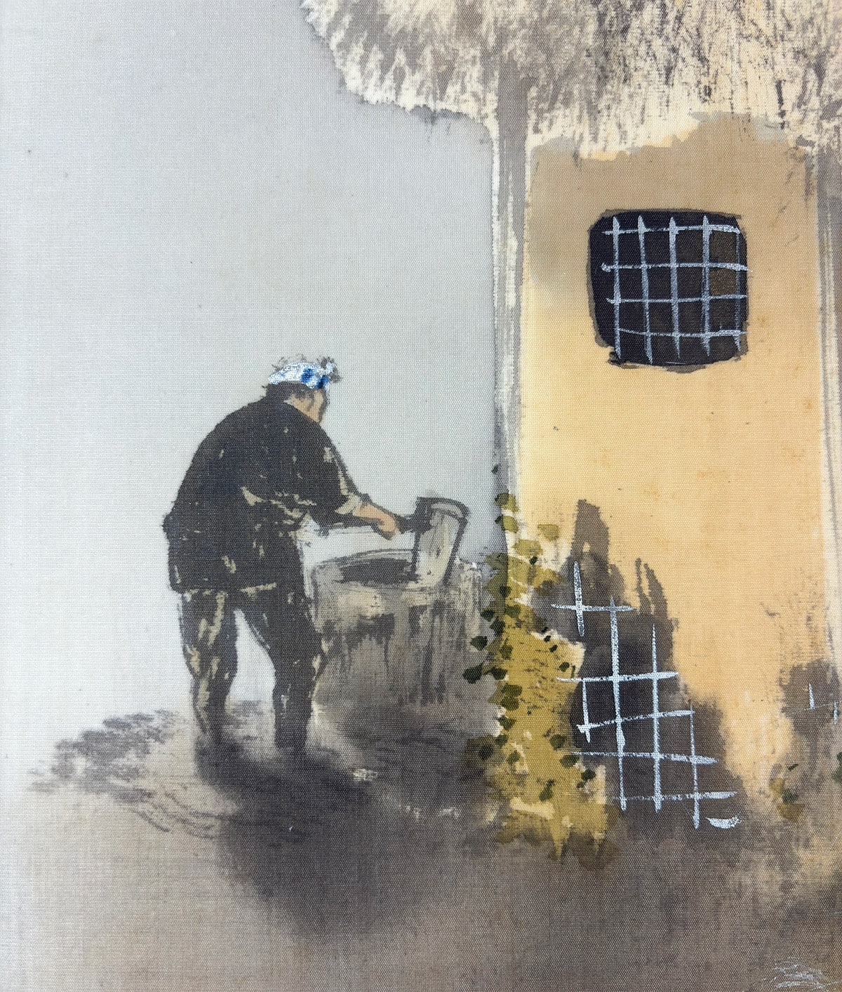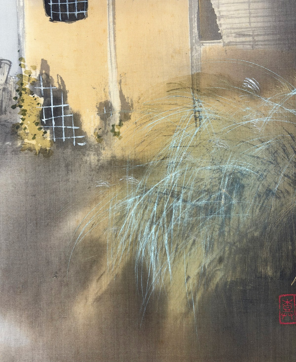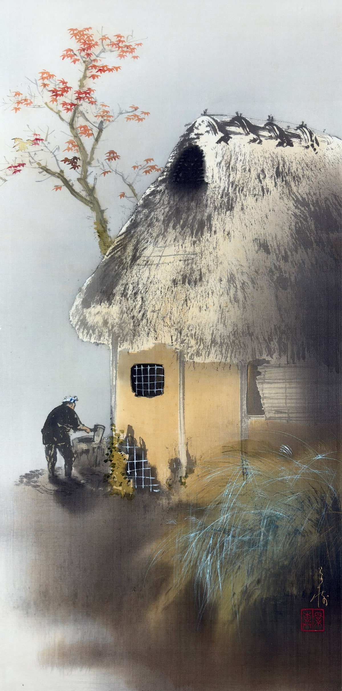 その筆致は柔らかく、月光の静けさと砧の響きを絵の中に封じ込めているようです。