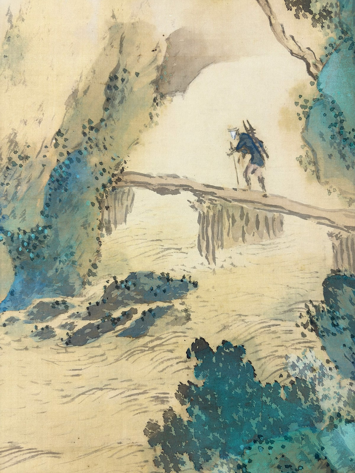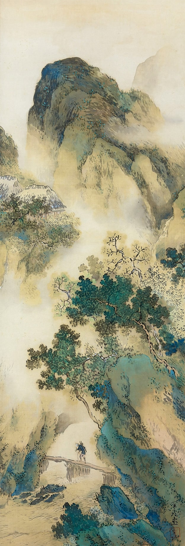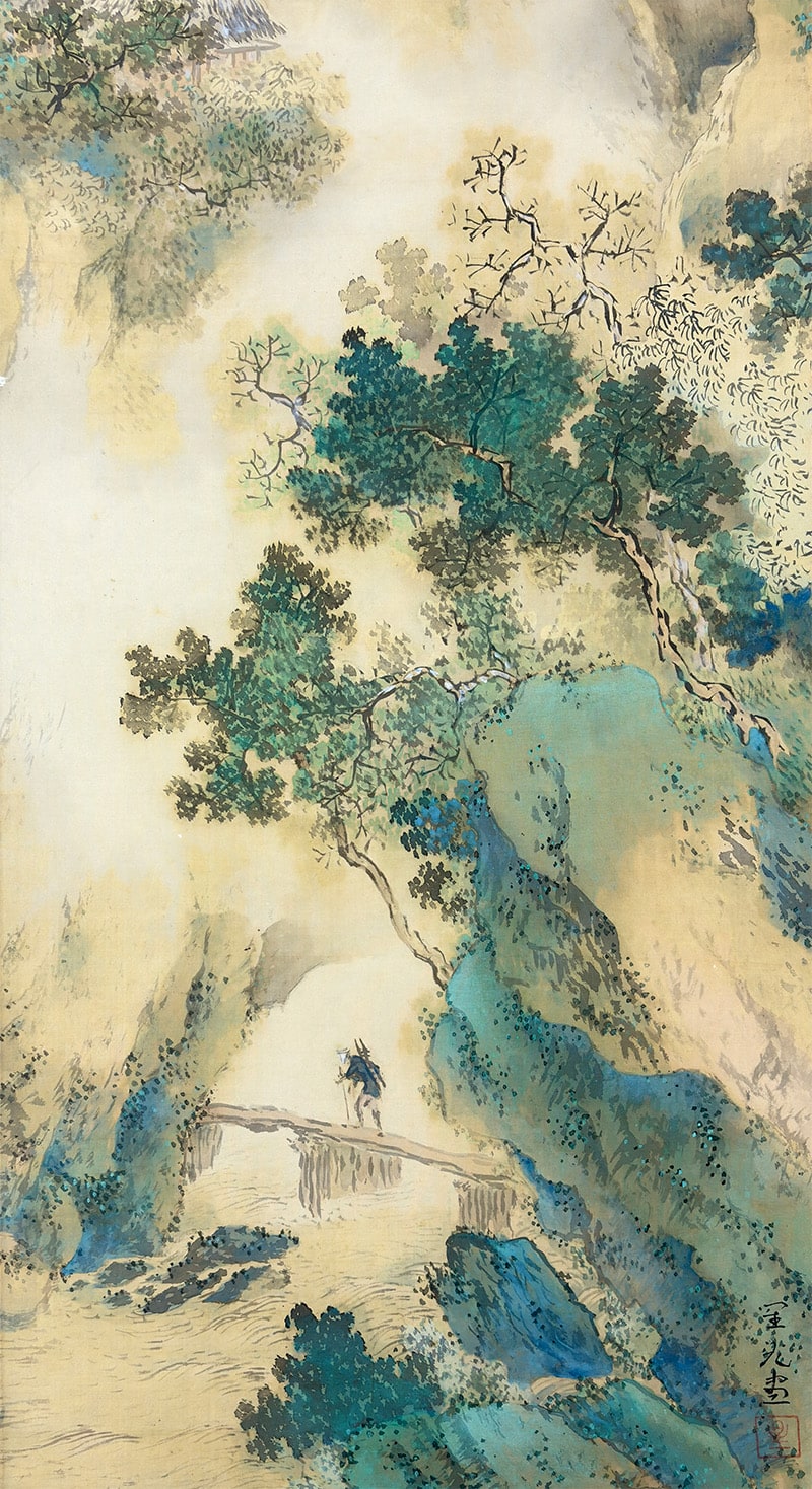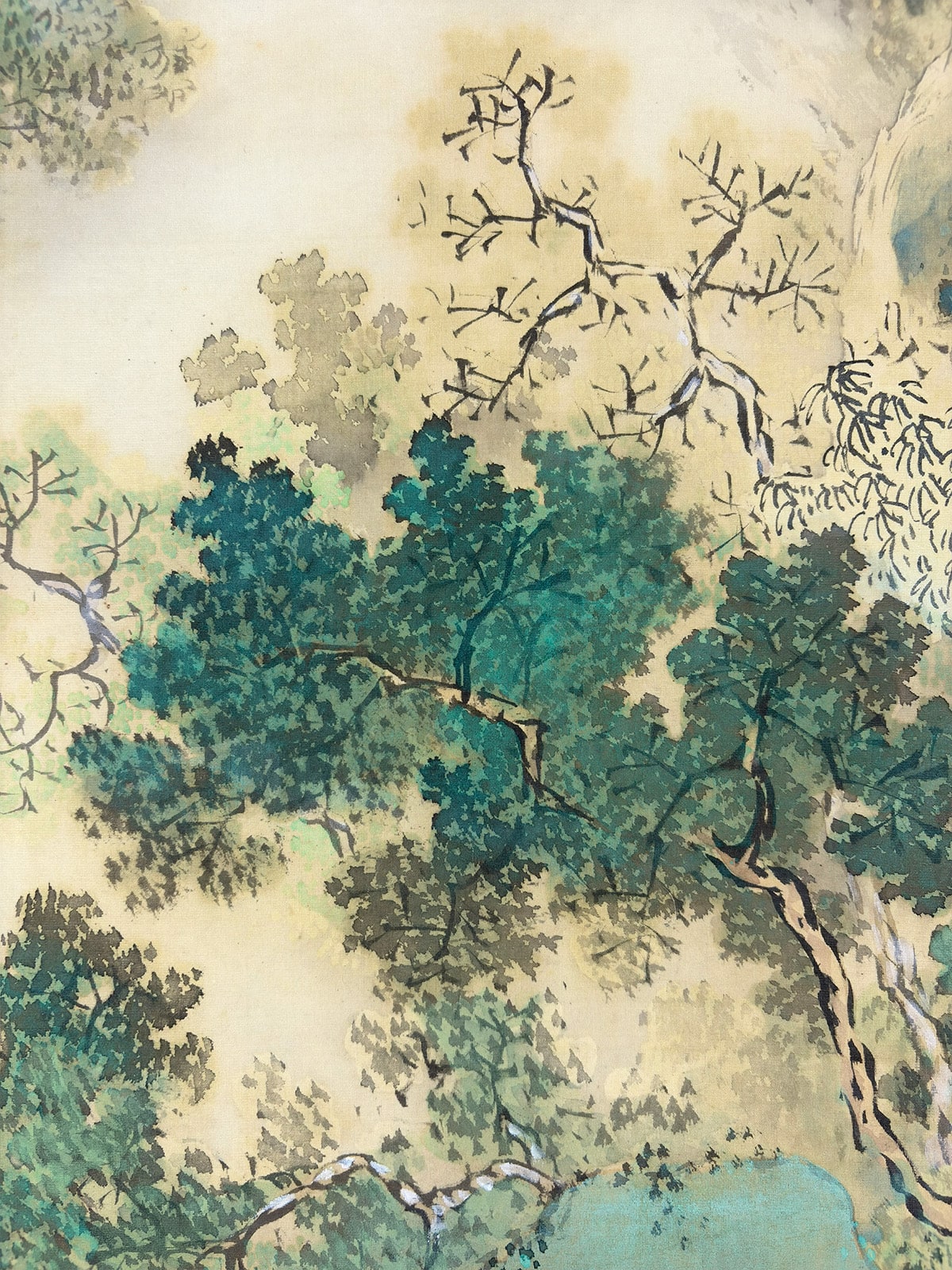 岩や木々、水の流れは細やかな筆づかいで描かれ、淡い彩色によって山の空気や湿り気まで感じられるような表現がなされています。青緑系の絵具が控えめに使われ、画面に清らかな印象と奥行きを与えています。人物は小さく描かれていますが、その姿からは一日の労を終え、家路につく安らぎが伝わってきます。