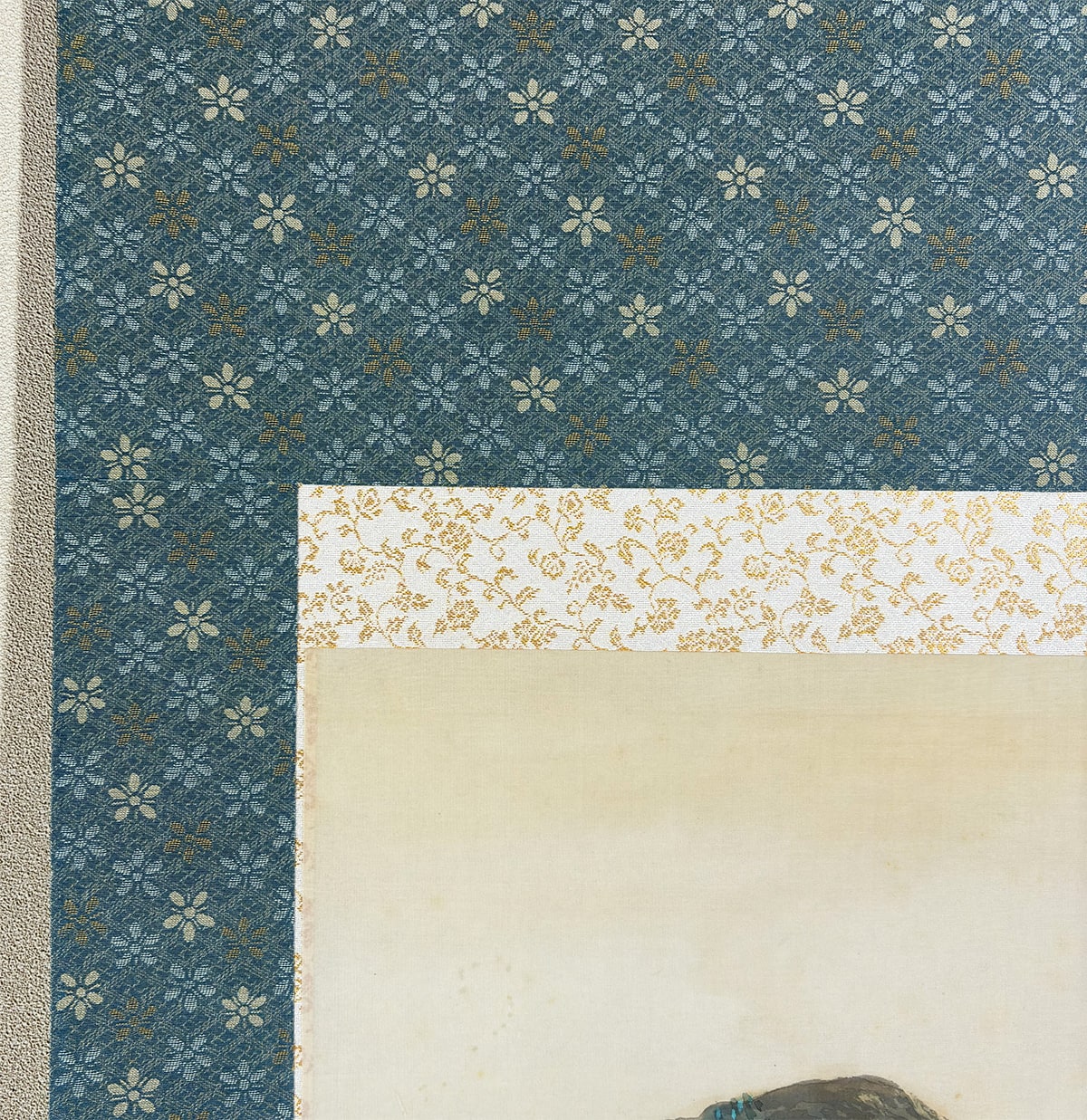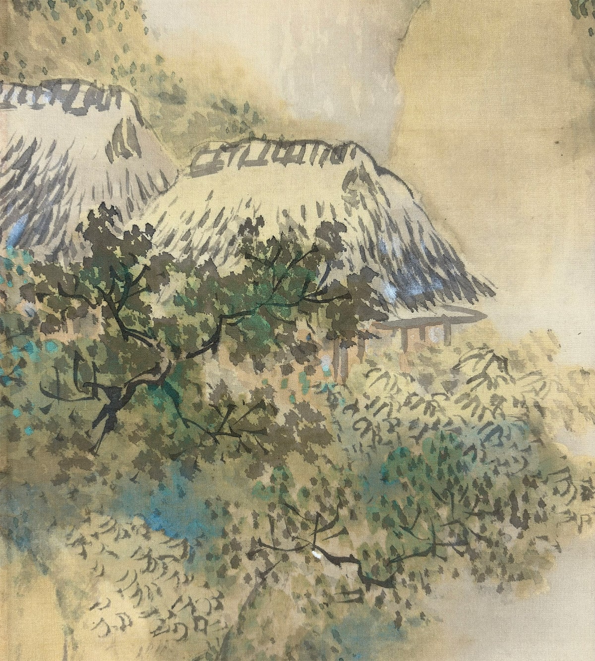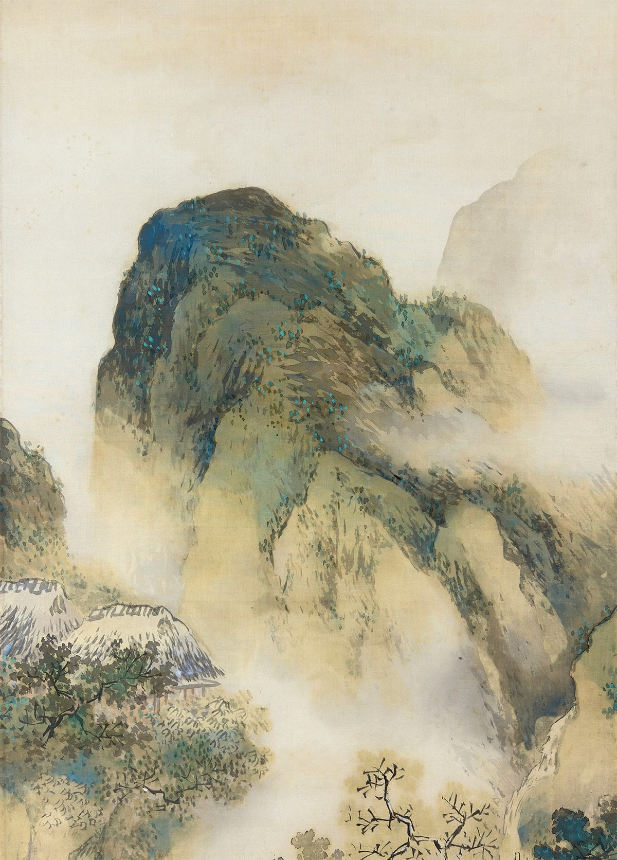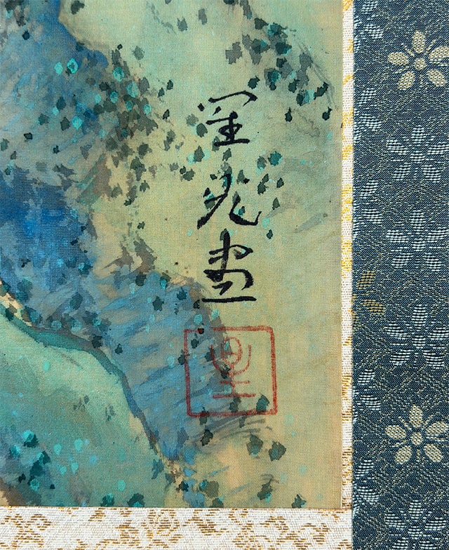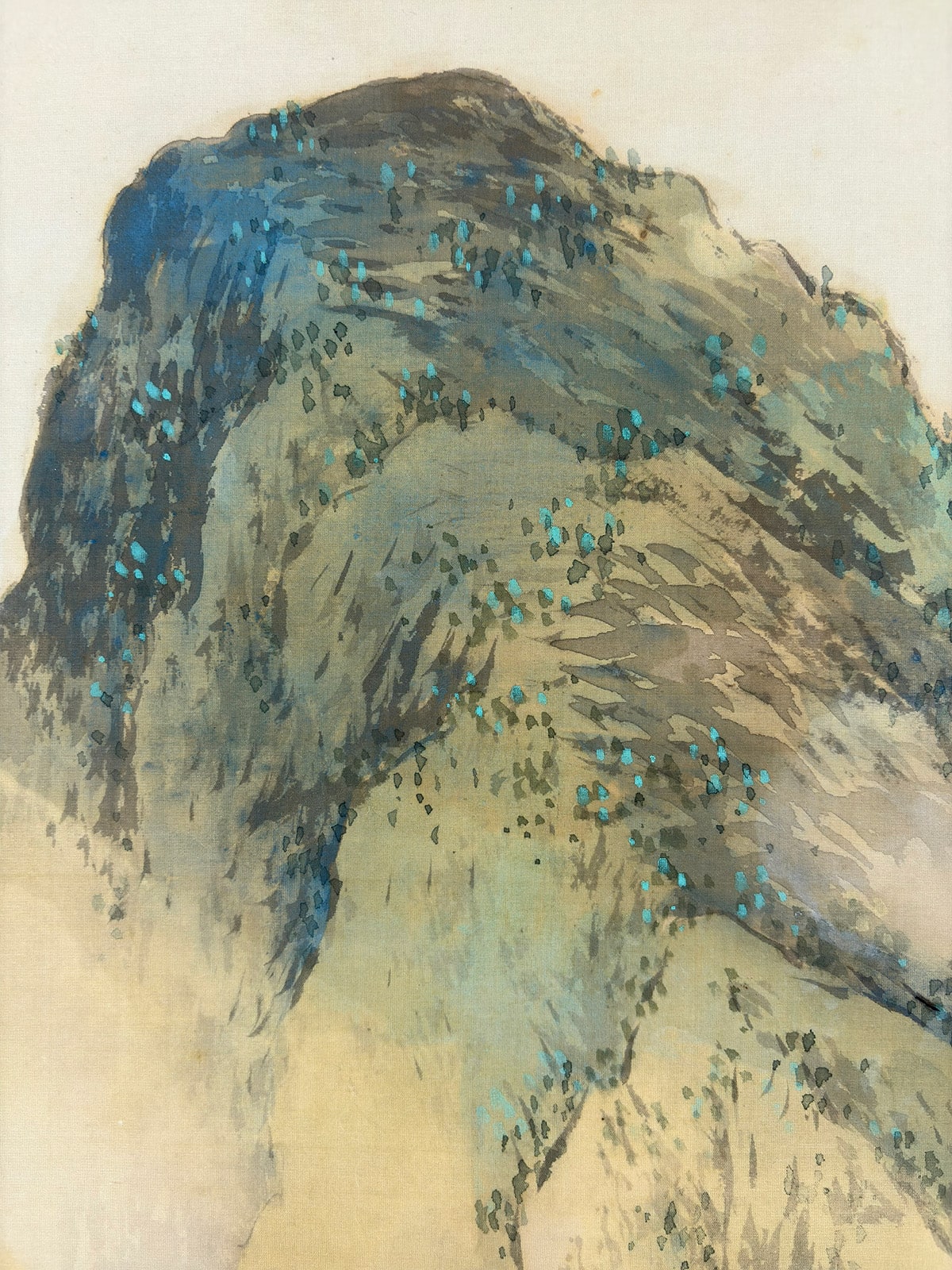 岩や木々、水の流れは細やかな筆づかいで描かれ、淡い彩色によって山の空気や湿り気まで感じられるような表現がなされています。青緑系の絵具が控えめに使われ、画面に清らかな印象と奥行きを与えています。人物は小さく描かれていますが、その姿からは一日の労を終え、家路につく安らぎが伝わってきます。