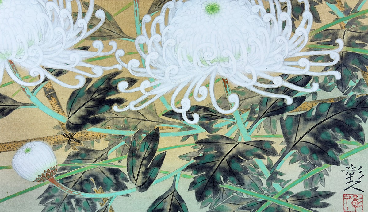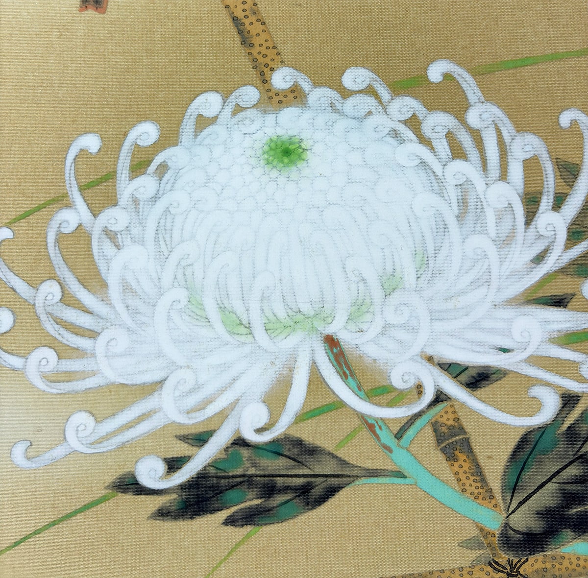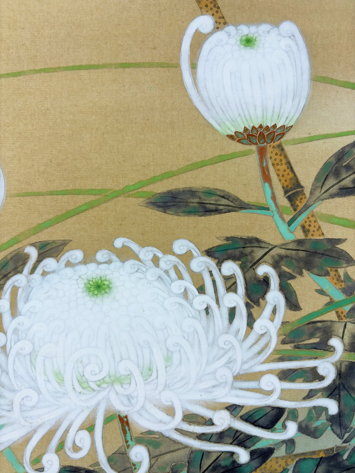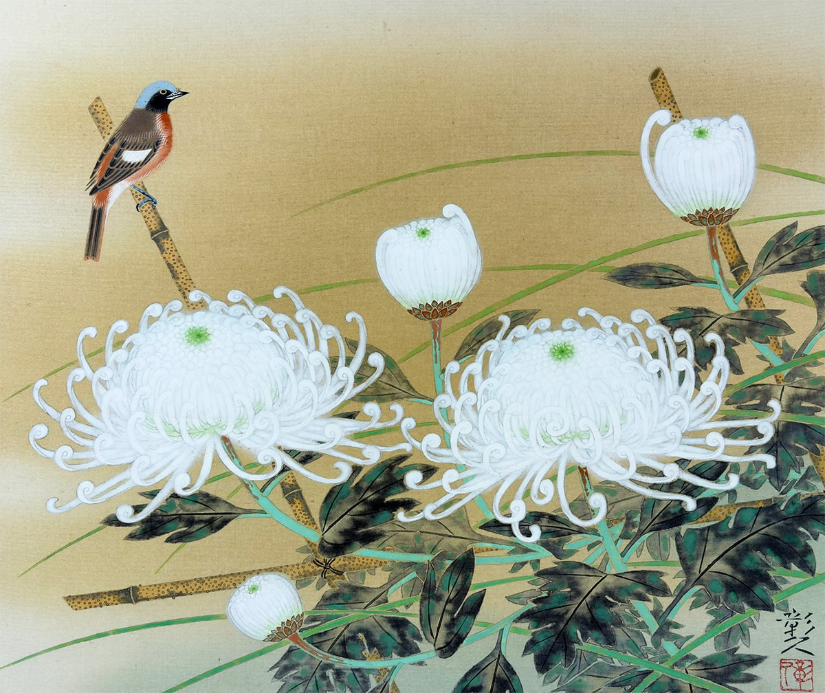 ●白く清らかな菊の花に、小鳥がそっととまる穏やかな情景を描いた一幅です。菊は古くから長寿や純粋さの象徴とされ、静かな美しさが心を落ち着かせてくれます。小鳥の柔らかな表情と、背景のやさしい色合いが調和し、秋らしい空気感を感じさせます。