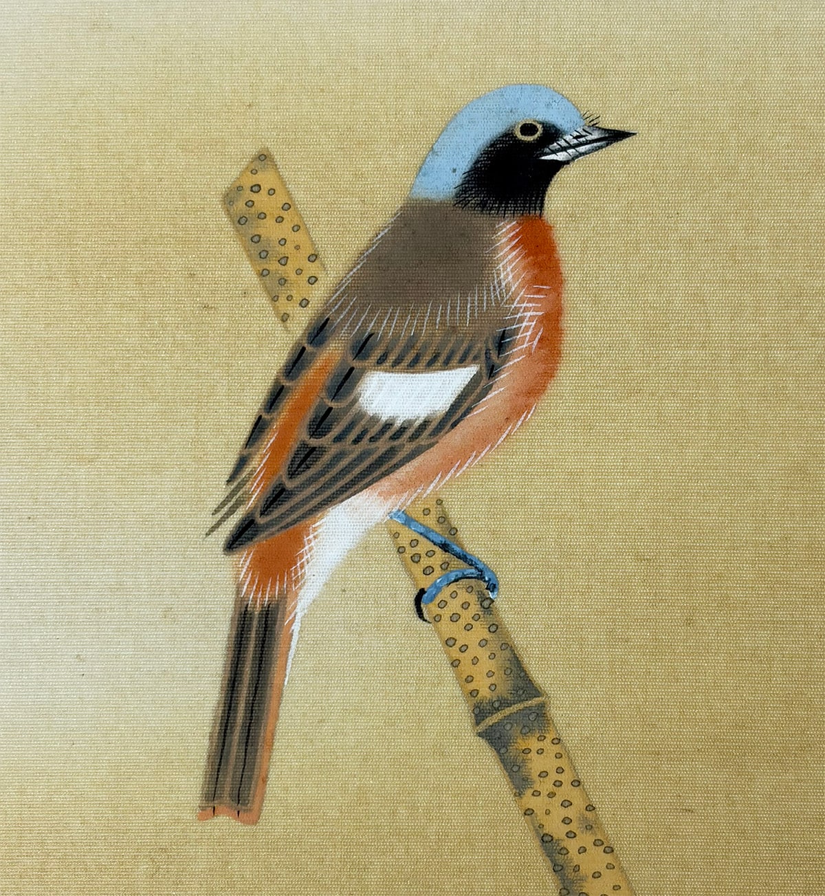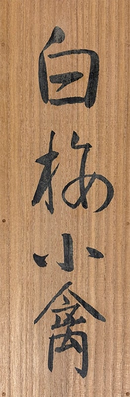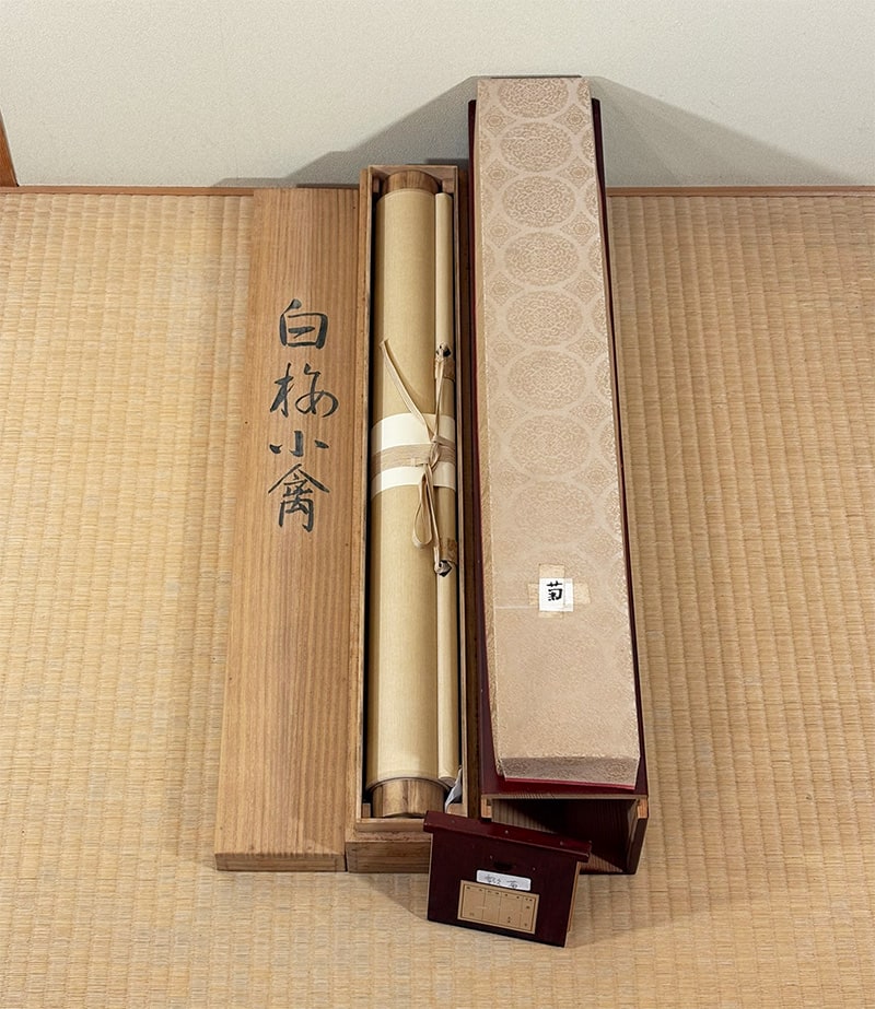 本作品《白菊小禽図》には共箱が付属しておりますが、箱書には《白梅小禽図》と記されております。作品と箱書の題名が一致しないため、恐らく以前の所有者が誤って別作品の箱に収めたものと考えられます。作品自体は「白菊」を主題としており、画面内容とも一致しております。