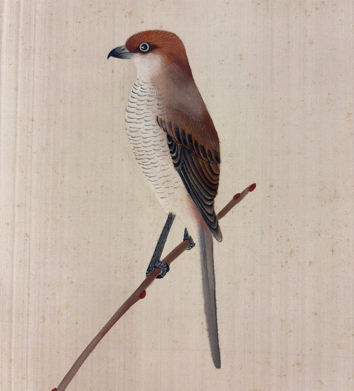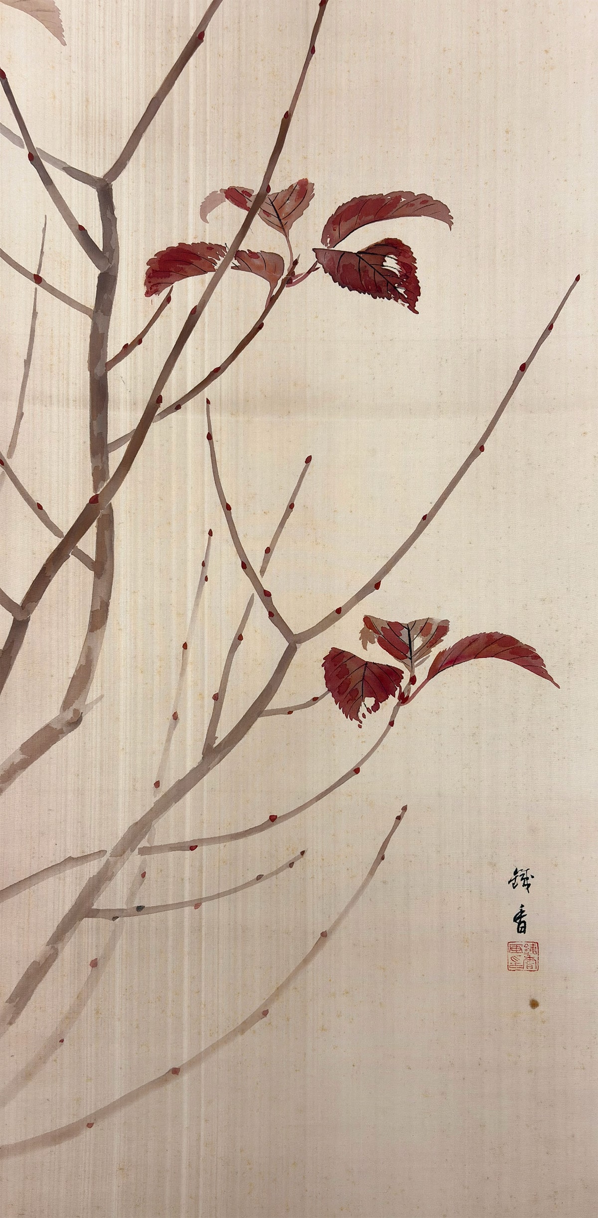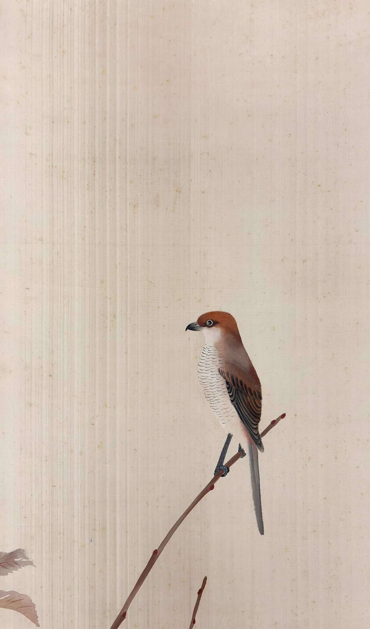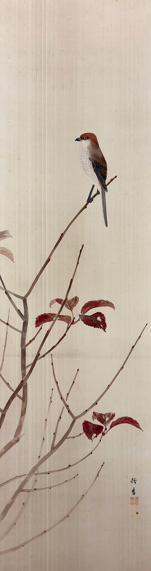 楢崎鉄香による本作は、秋の深まりを告げる百舌(モズ)を主題とした掛軸作品です。紅葉した枝にとまる一羽の百舌が、静かに季節の声を聴いているかのような佇まい。背景には、時雨のように繊細な縦筋が施され、晩秋の空気感を見事に表現しています。