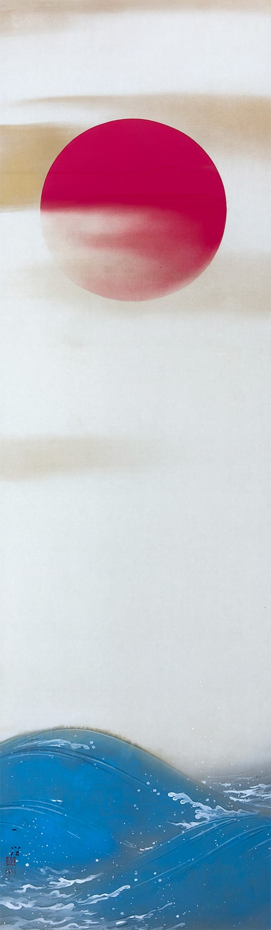 波は墨と藍で簡潔に描かれ、白の泡が命を吹き込むように舞う。その上に浮かぶ大きな朱の円は、ただの太陽ではなく、再生と祈りの象徴。日本の国旗にも通じる「日の丸」の意匠が、静かに心を打ちます。