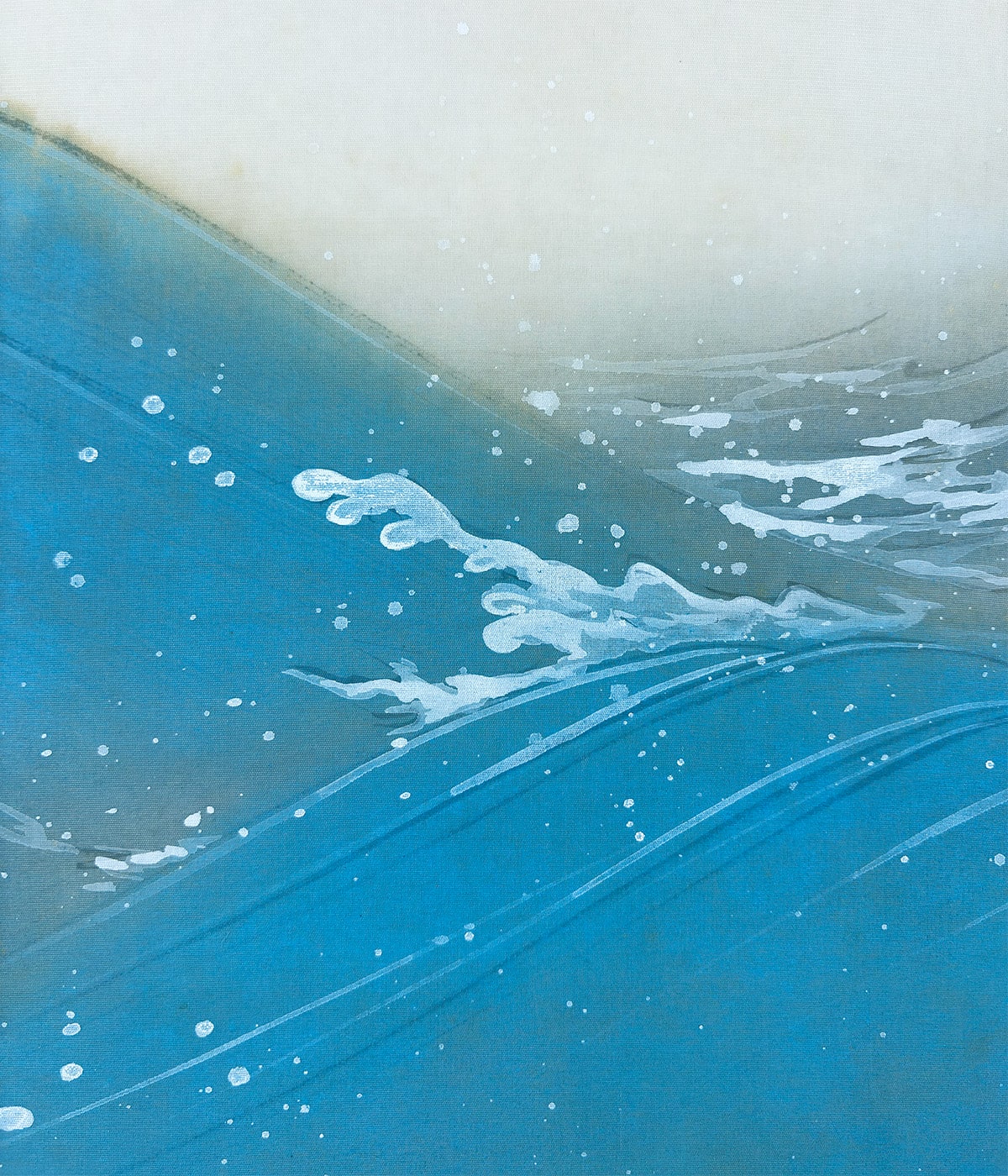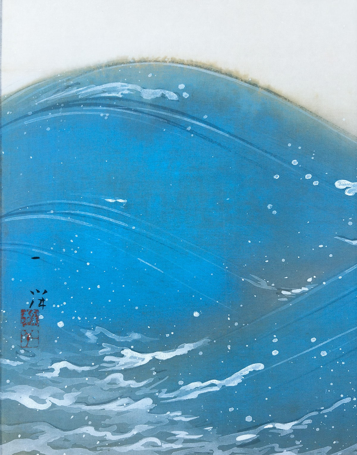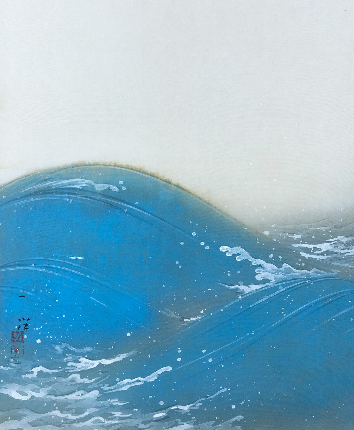 波は墨と藍で簡潔に描かれ、白の泡が命を吹き込むように舞う。