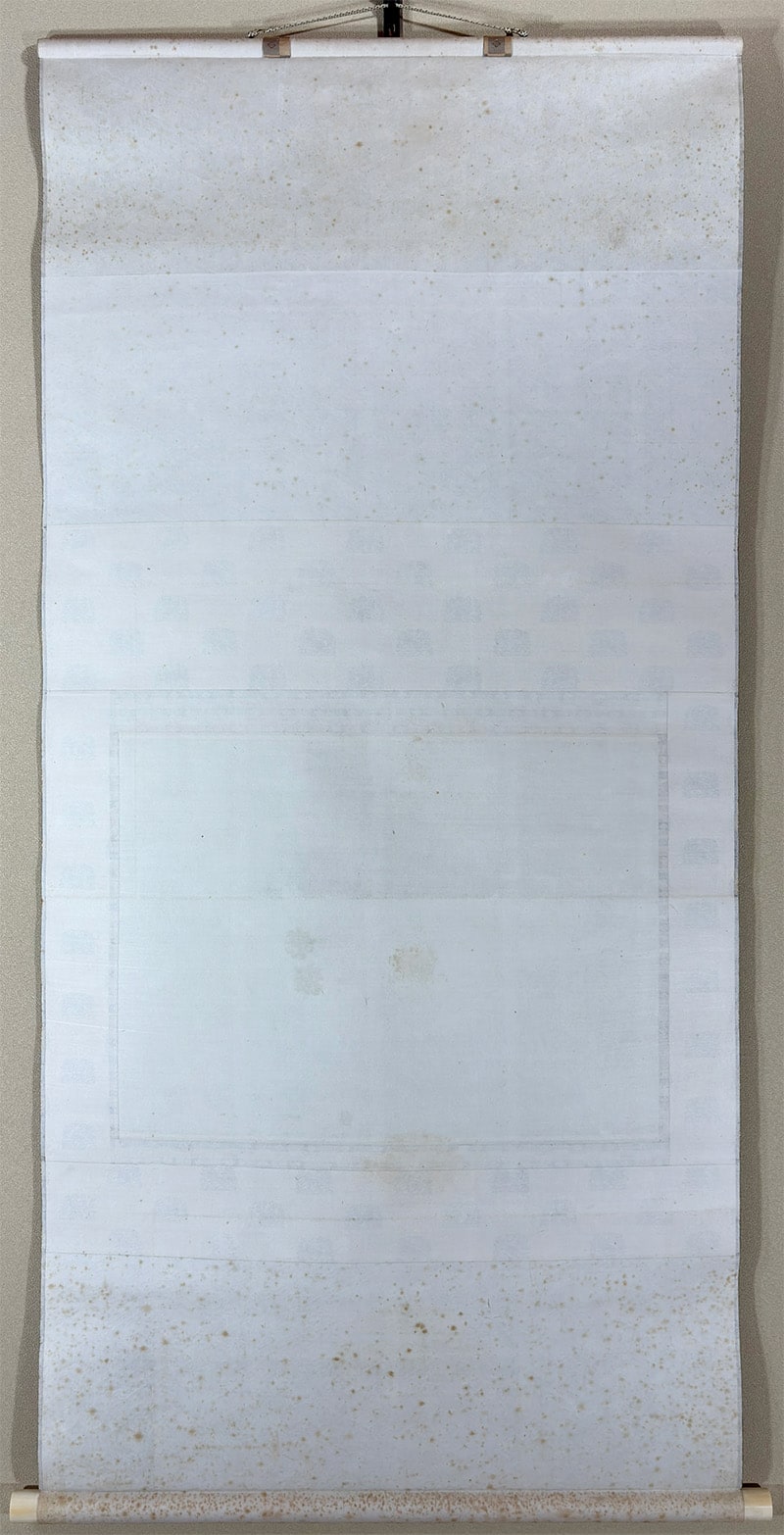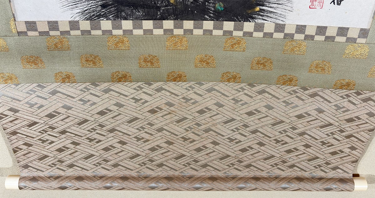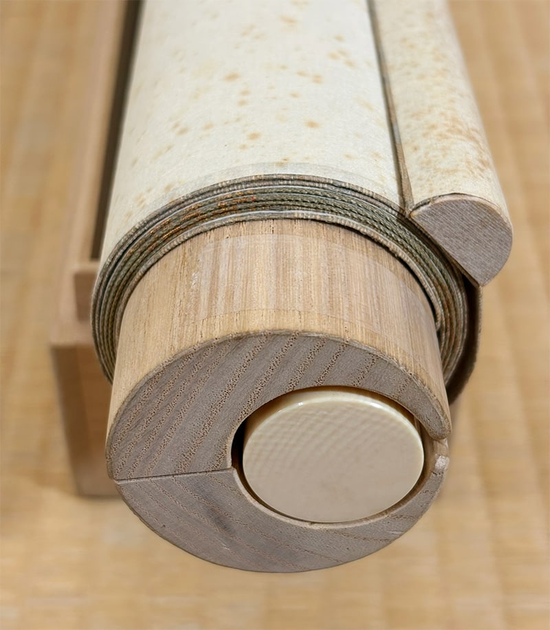 掛軸をしまう時は必ず太巻き芯棒を挟んで巻いてください。