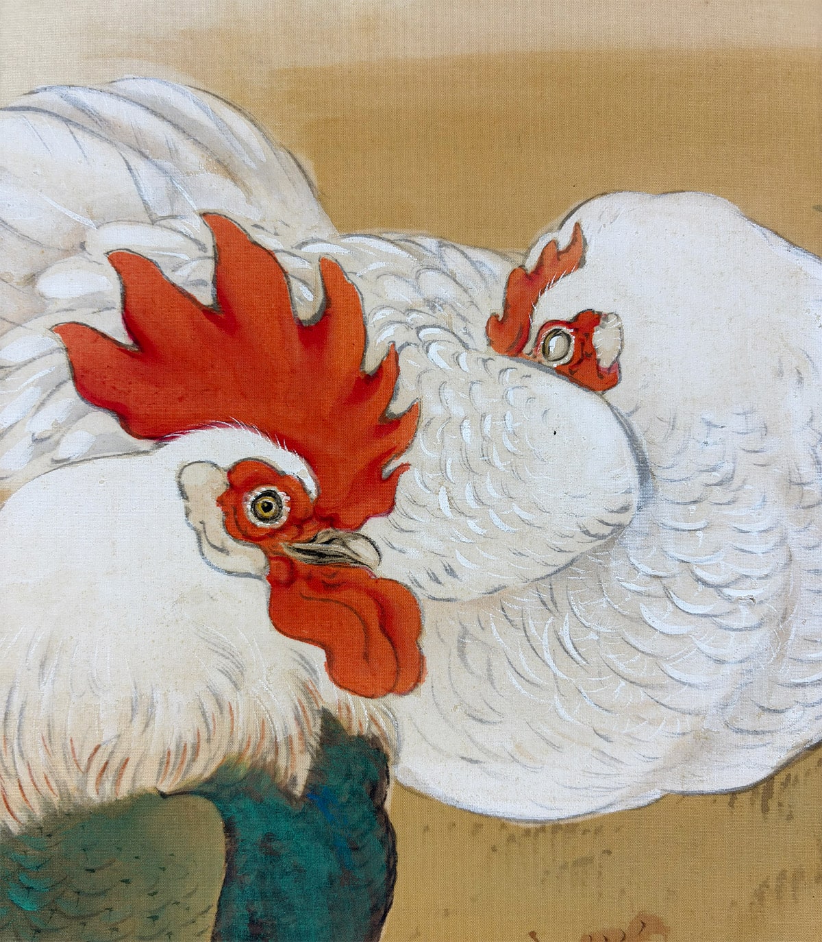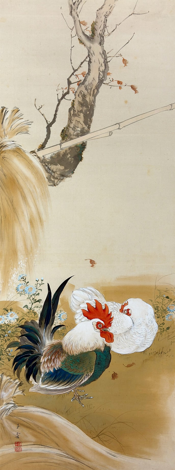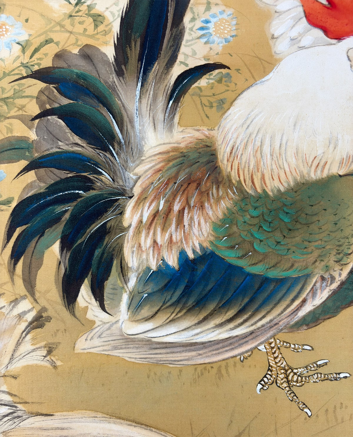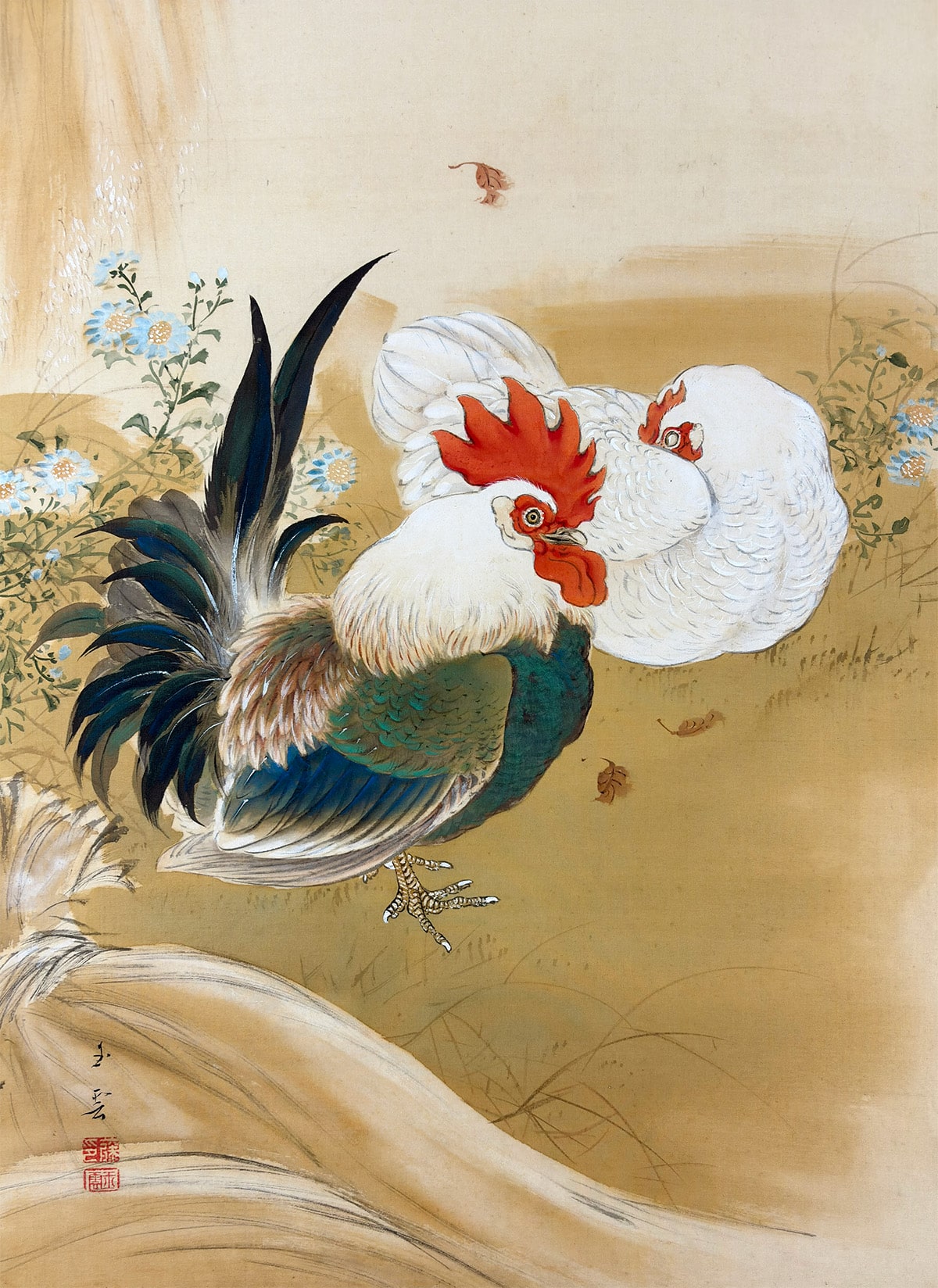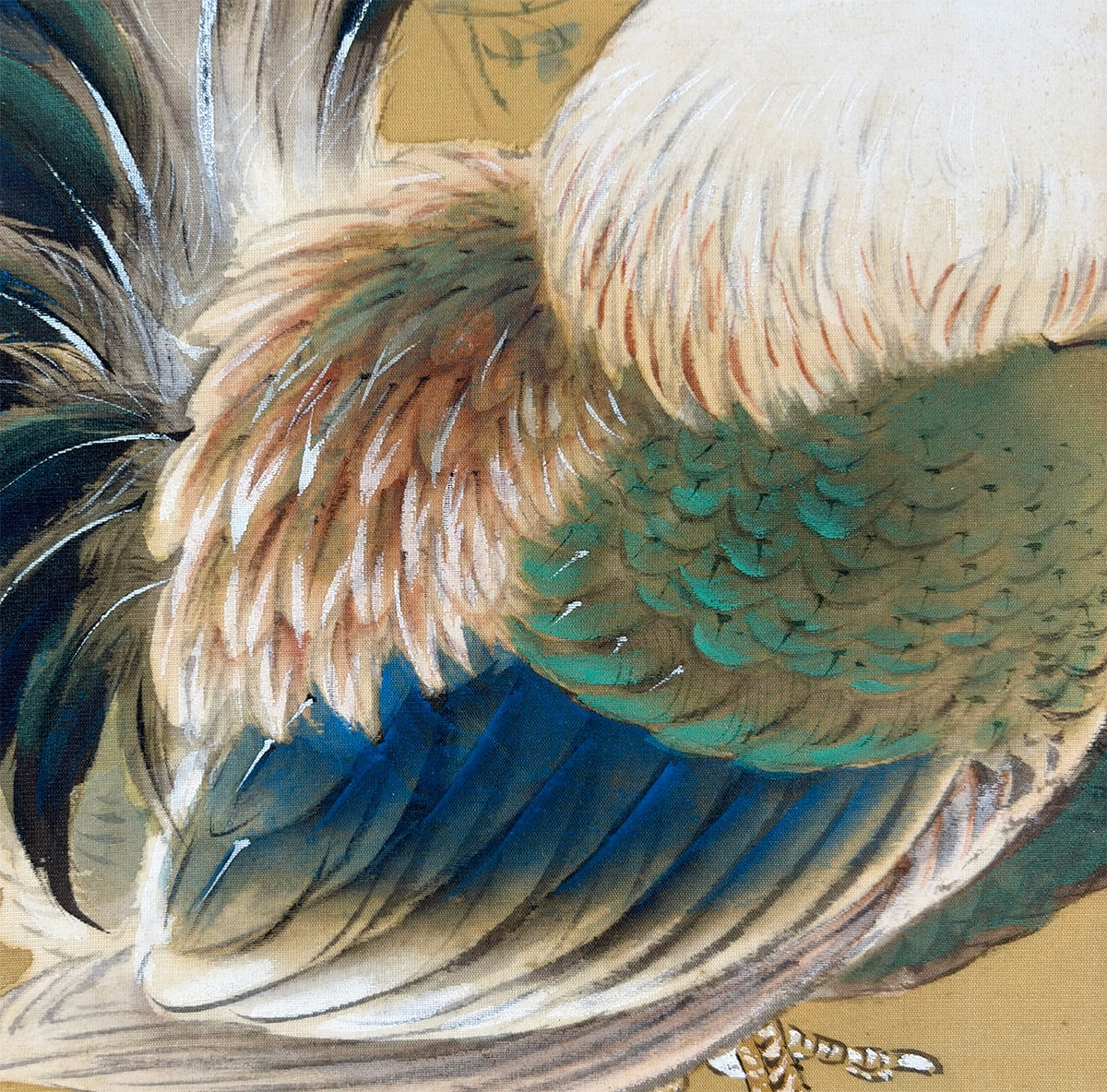 ●鶏の羽根の艶やかさや眼差しの力強さを細やかに捉え、生命の気配を画面に宿しています。