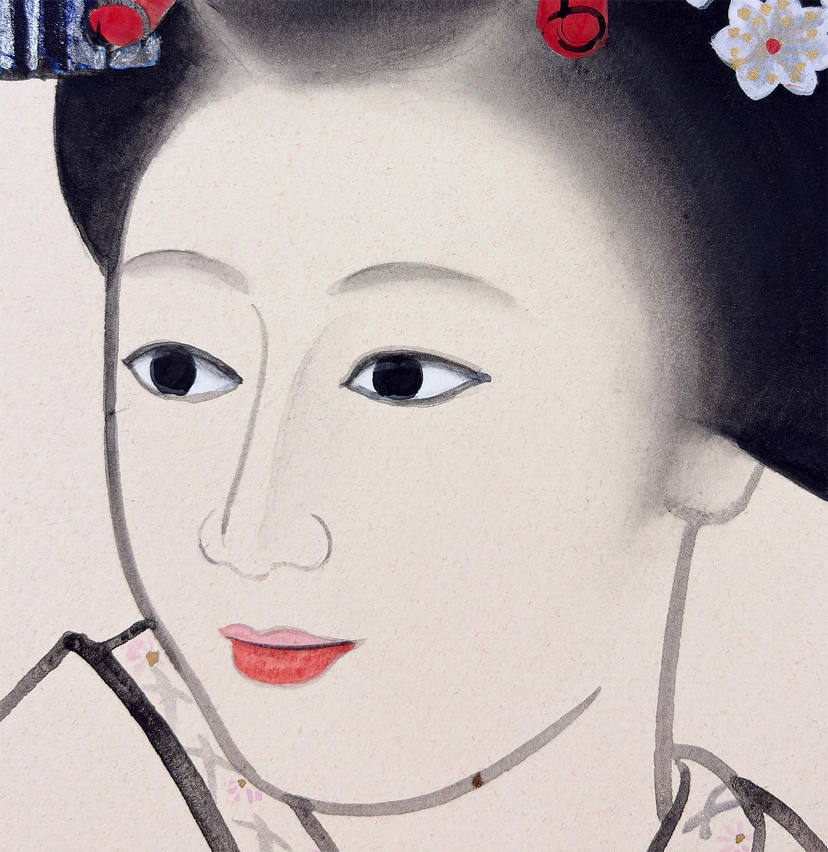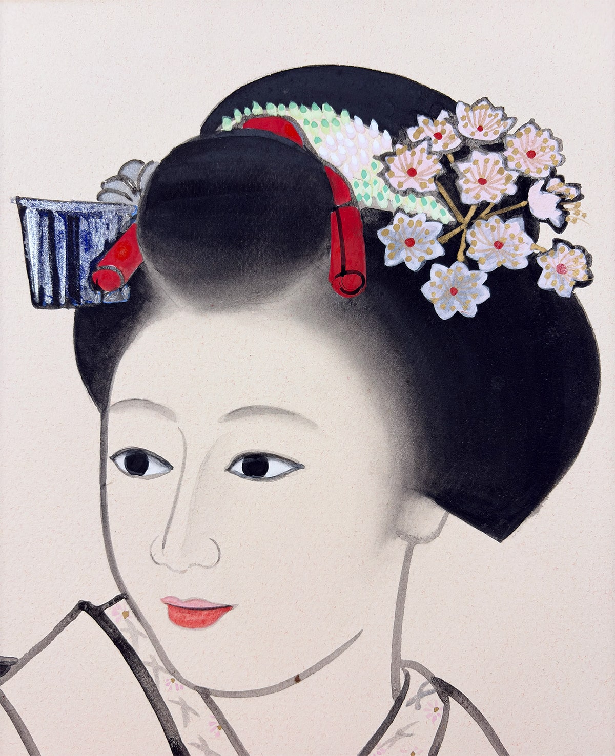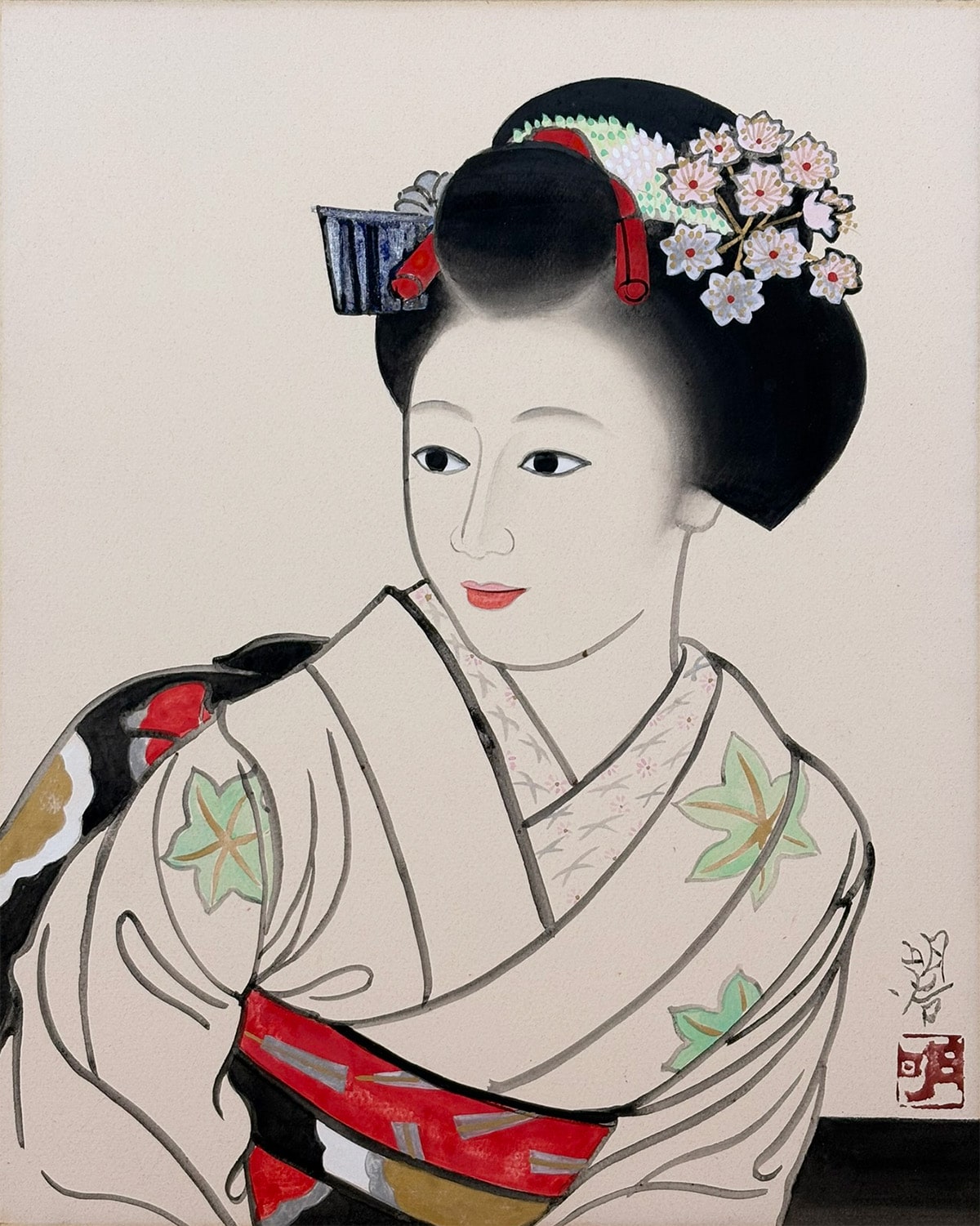 舞妓の誇り高い気高さを損なうことなく、すっきりとした仕立てでまとめられており、絵の美しさをより引き立てています