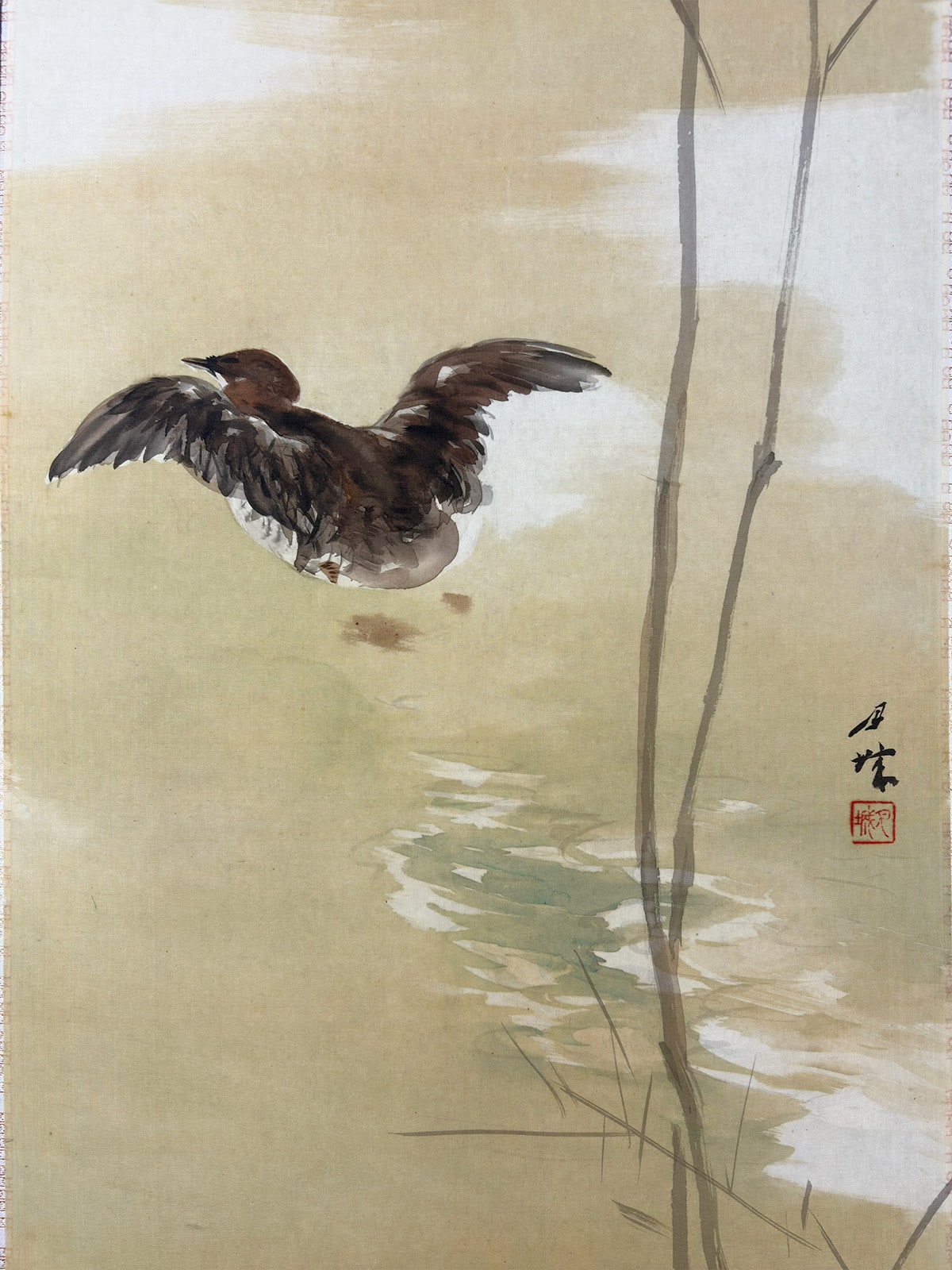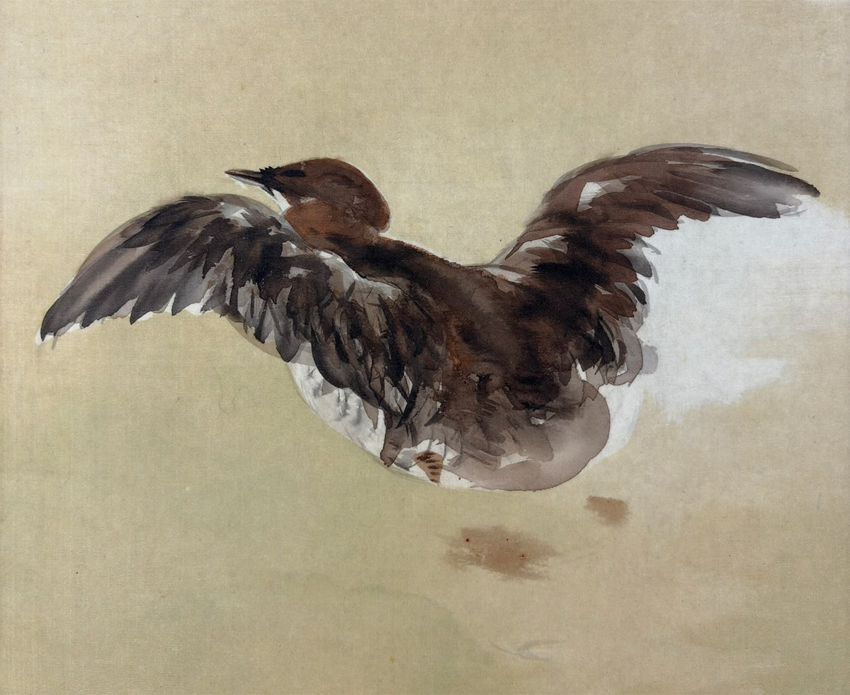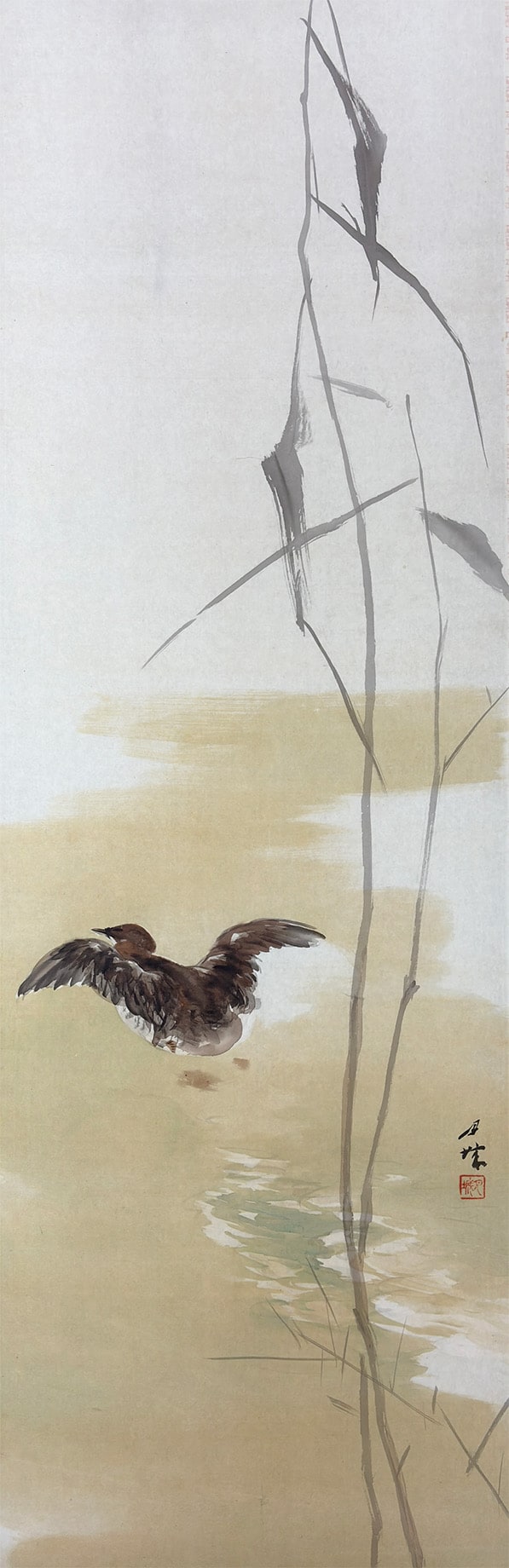 ●本作は、寒江に浮かぶ水禽が、今まさに飛び立とうとする一瞬を捉えています。