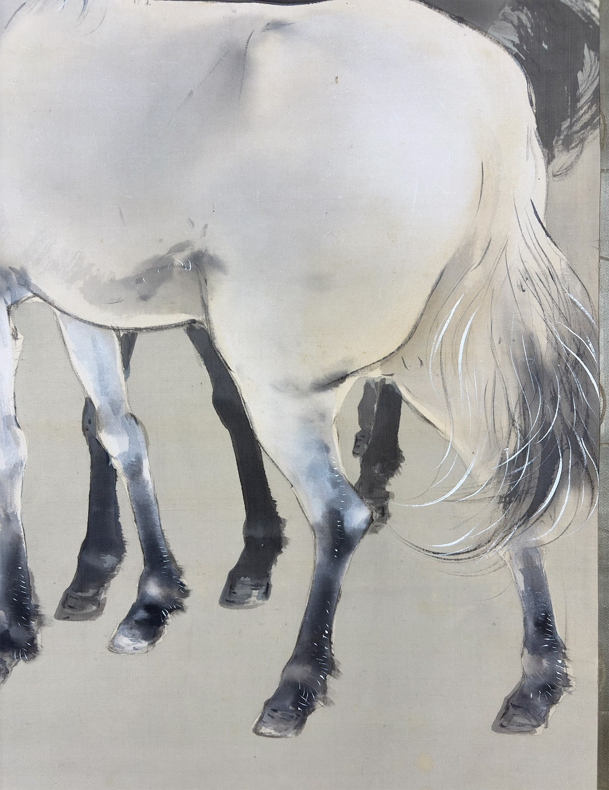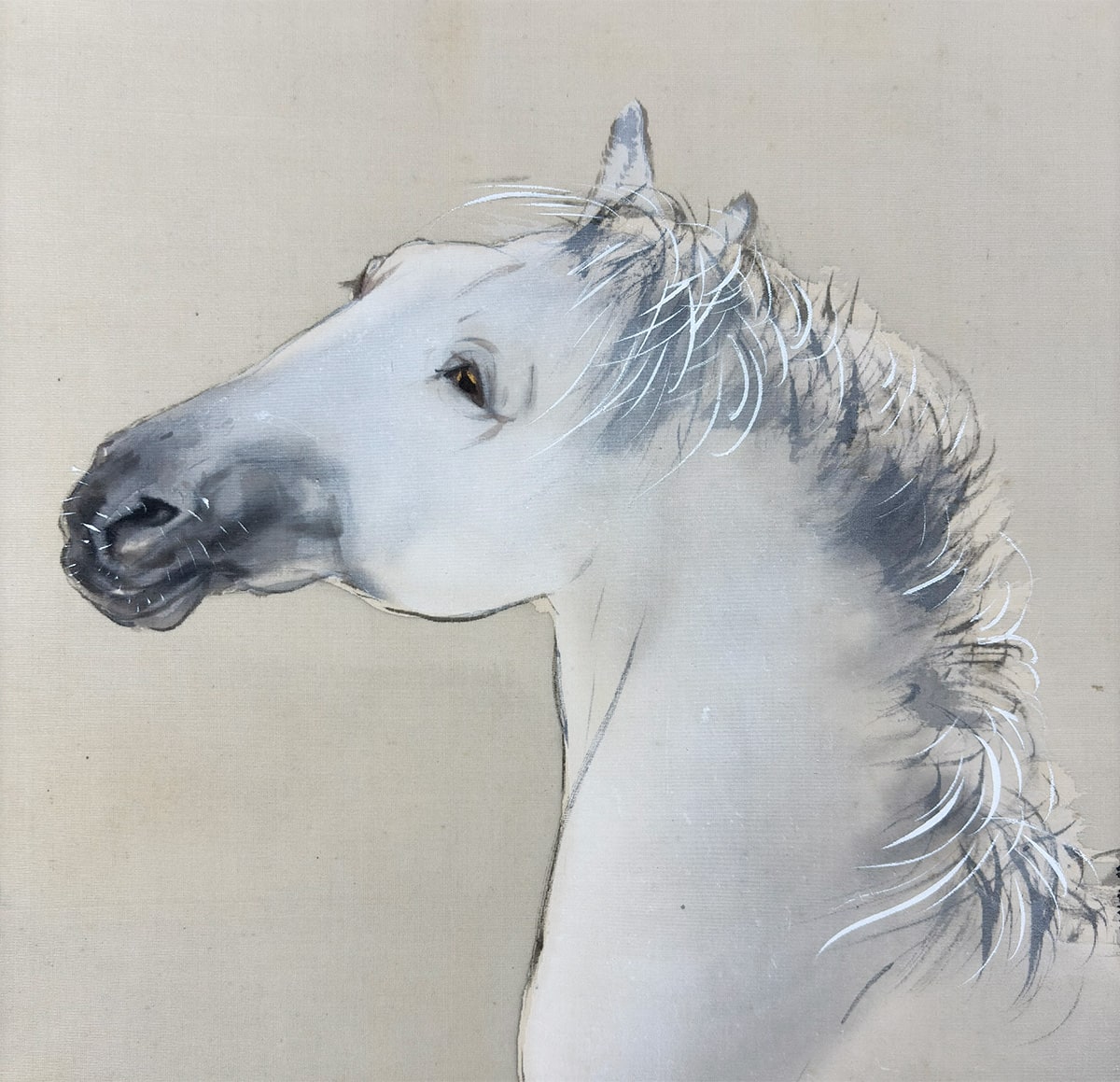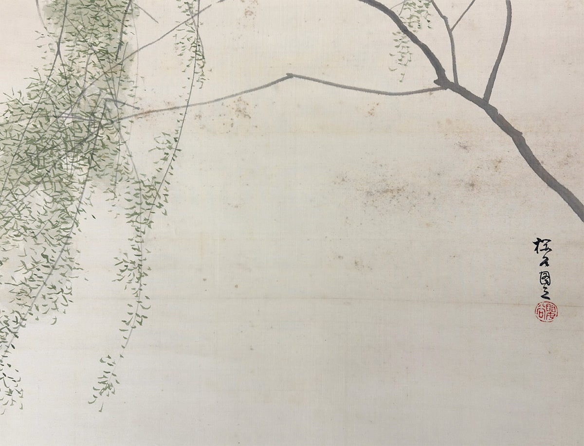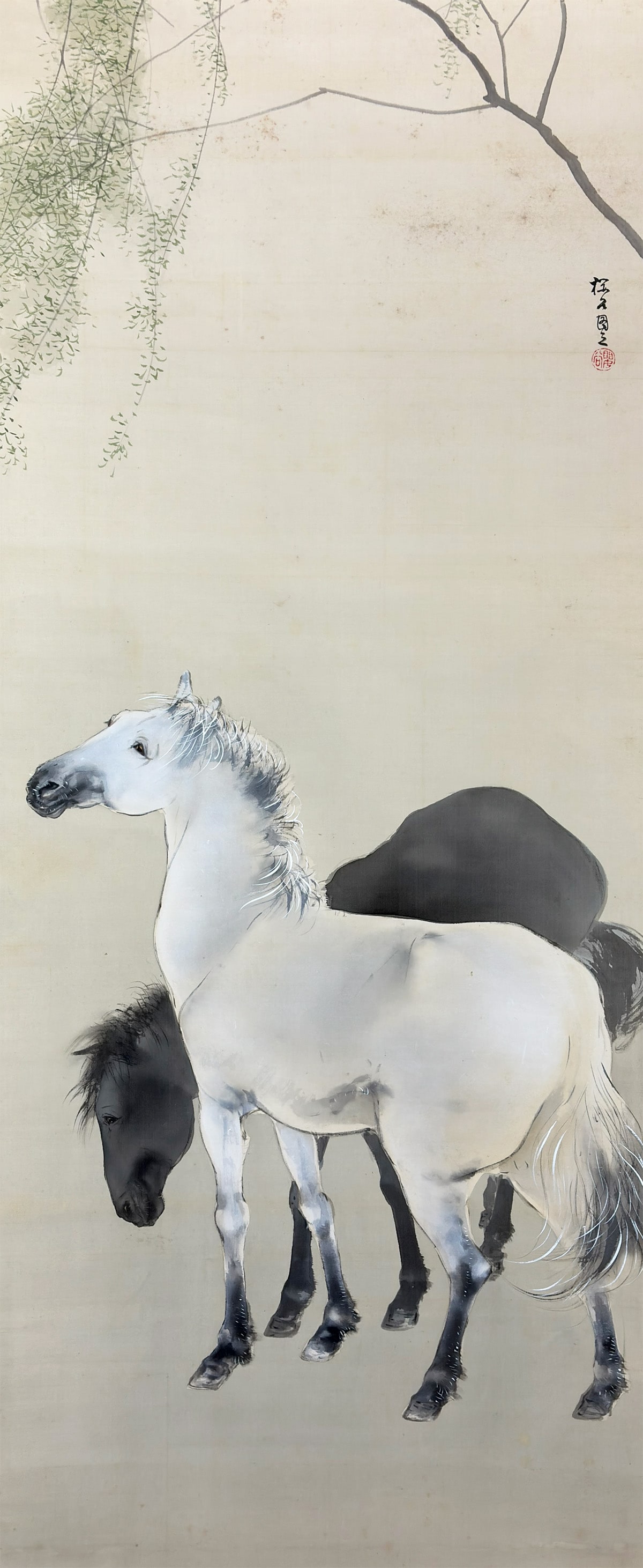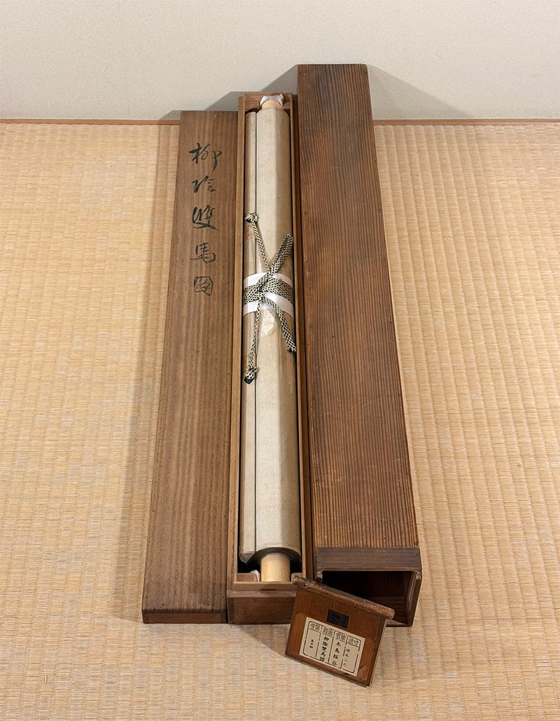 柳の枝葉は風にそよぎ、馬はその陰に身を預けるように立つ。動と静、力と優しさが一幅の中で見事に均衡を保ち、日本画ならではの「和」の美意識が息づいています。