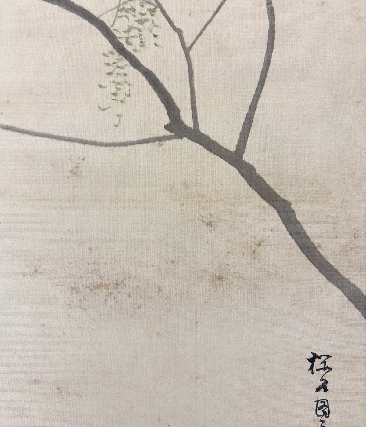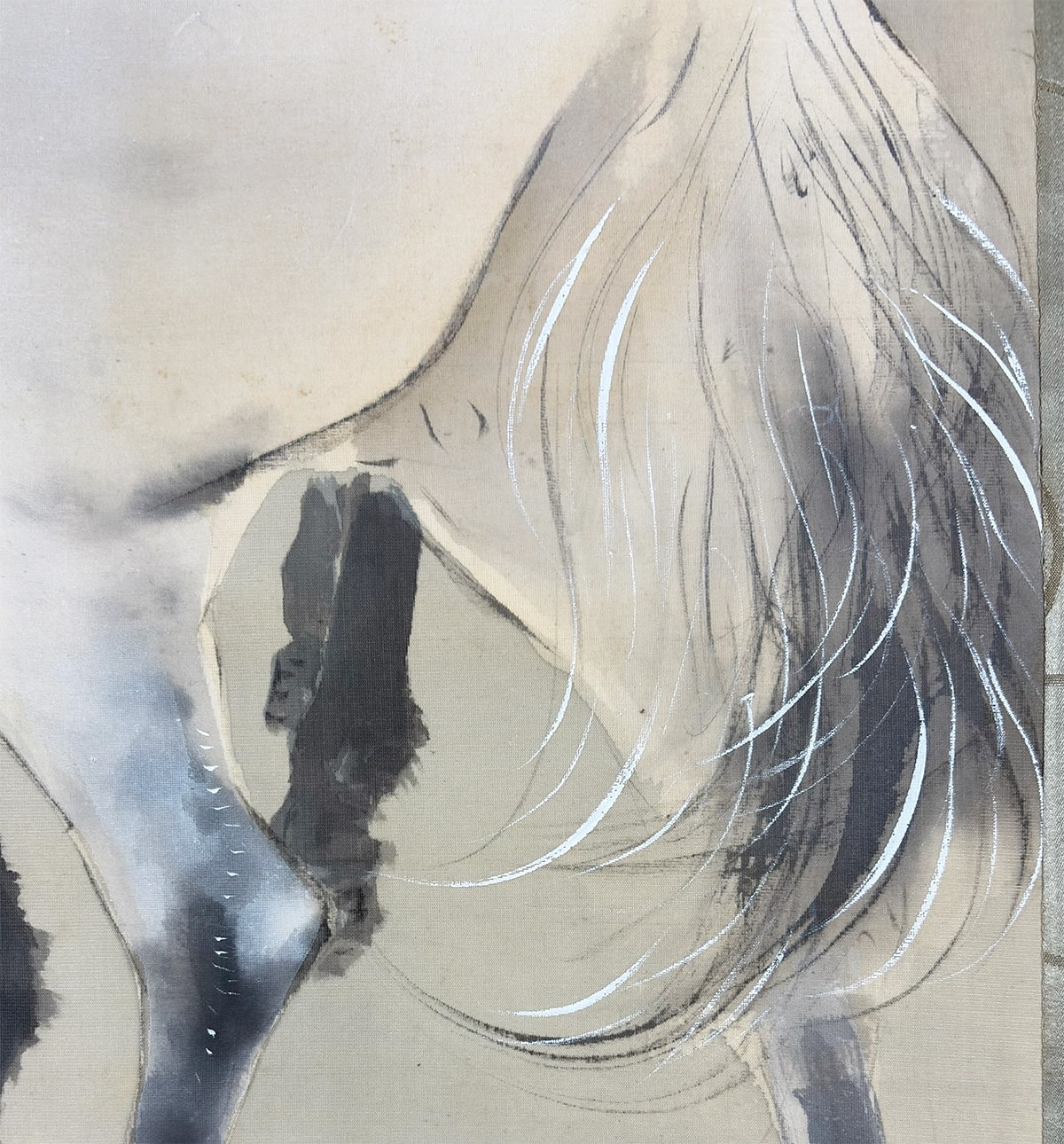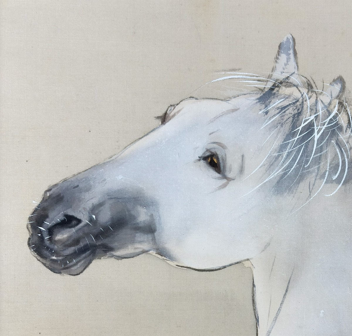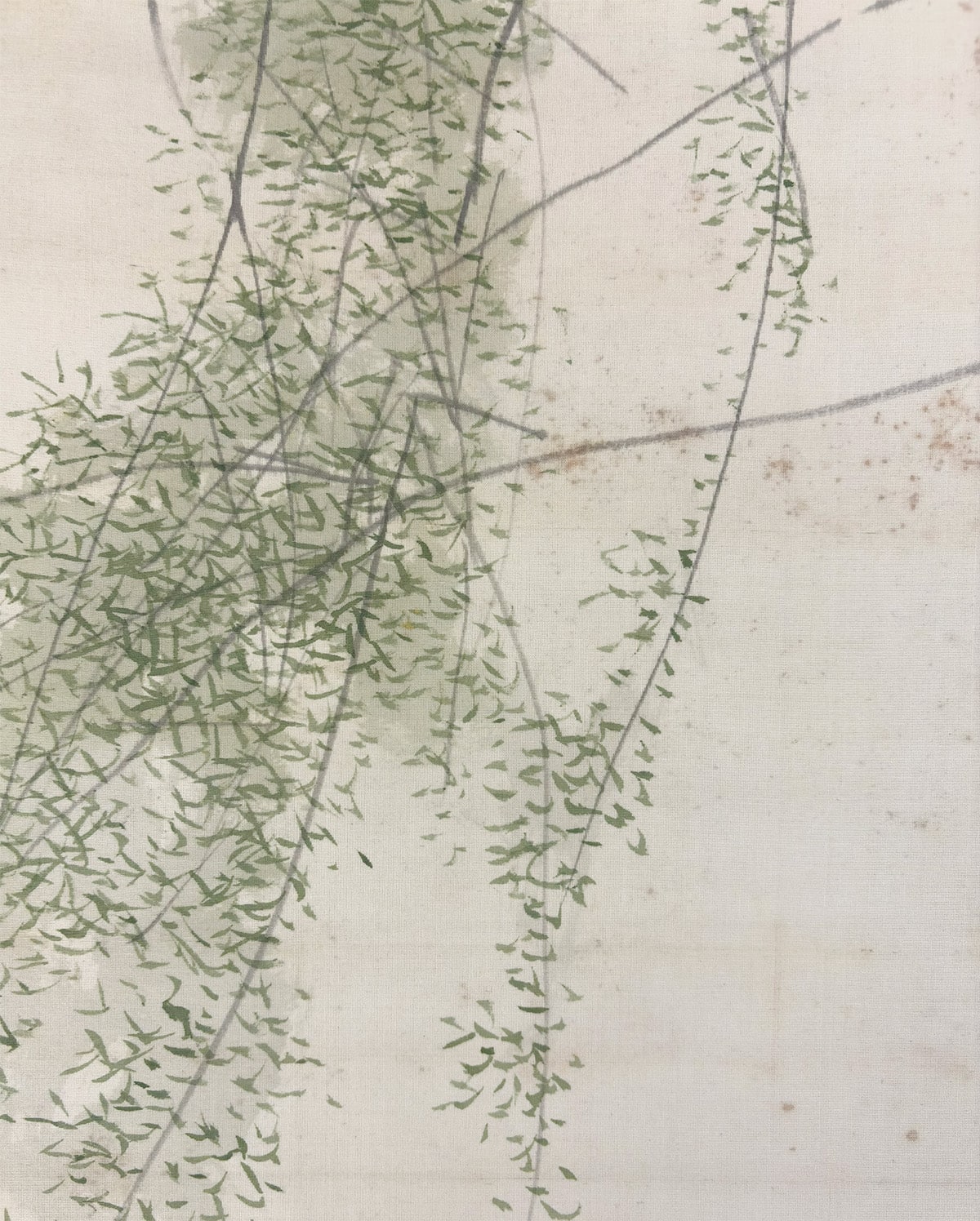柳の枝葉は風にそよぎ、馬はその陰に身を預けるように立つ。動と静、力と優しさが一幅の中で見事に均衡を保ち、日本画ならではの「和」の美意識が息づいています。