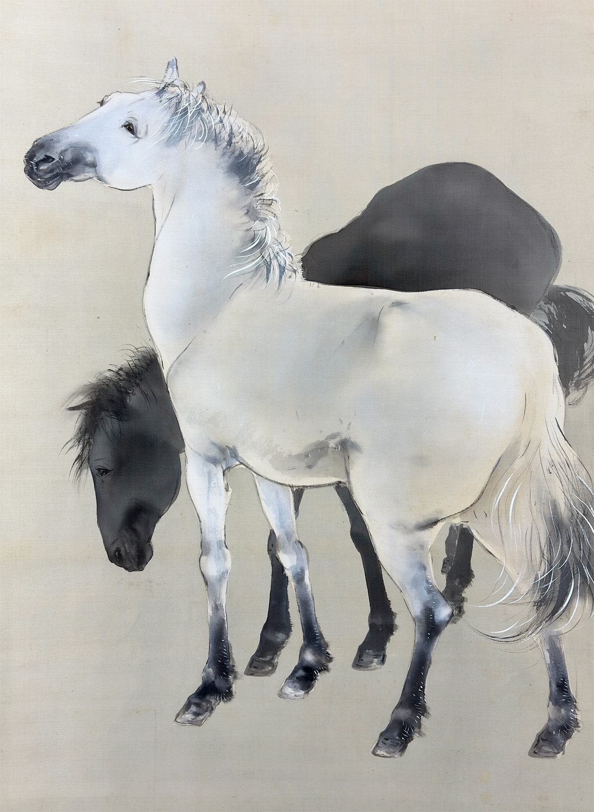 ●本画に描かれる馬は、単なる動物ではなく「和」の象徴としての意味を帯びます。木島桜谷の《柳陰雙馬》のように、静けさ・調和・品格を備えた馬の姿は、まさに「和馬」の精神そのもの。日本の馬は、力を誇示せず、自然と共にある存在として描かれることが多く、鑑賞者に深い安らぎと敬意をもたらします。