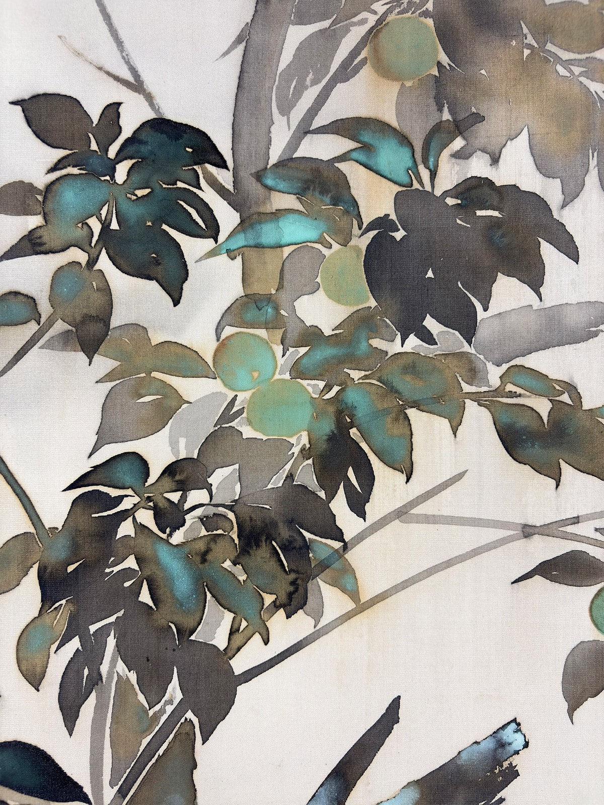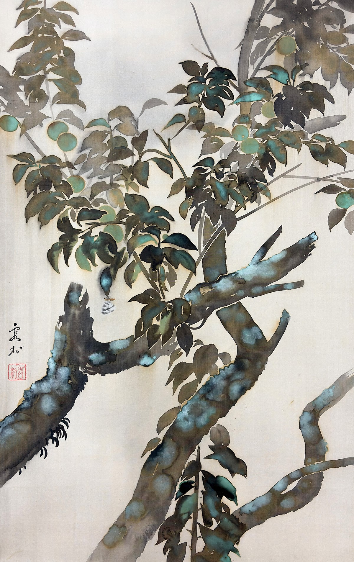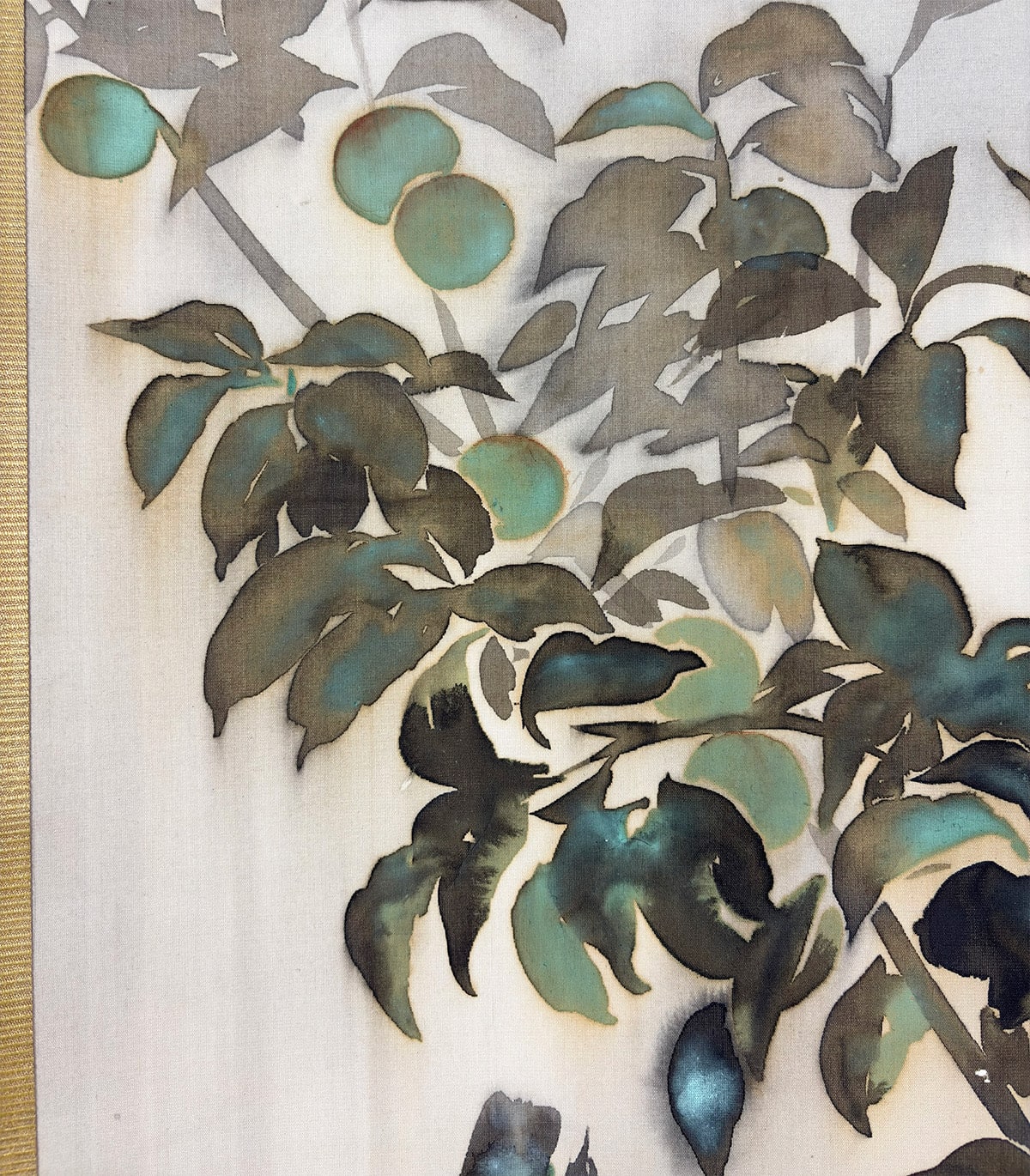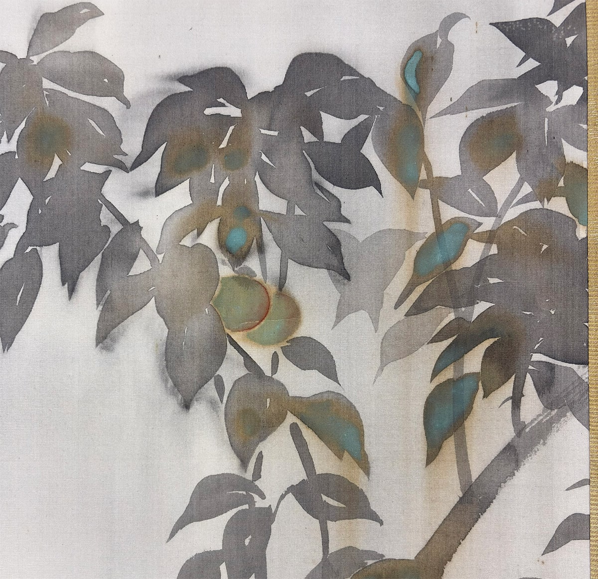 ●「たらしこみ」は、濡れた画面に墨や彩色を重ねることで、自然なにじみや揺らぎを生み出す日本画特有の技法です。霞村先生はこの技法を葉の描写に用い、雨に濡れた質感と空気の湿度を巧みに表現しています。枝間に描かれた青梅の淡緑が画面に清涼な緊張感を与え、梅雨の情景に確かな実りの予感を添えています。