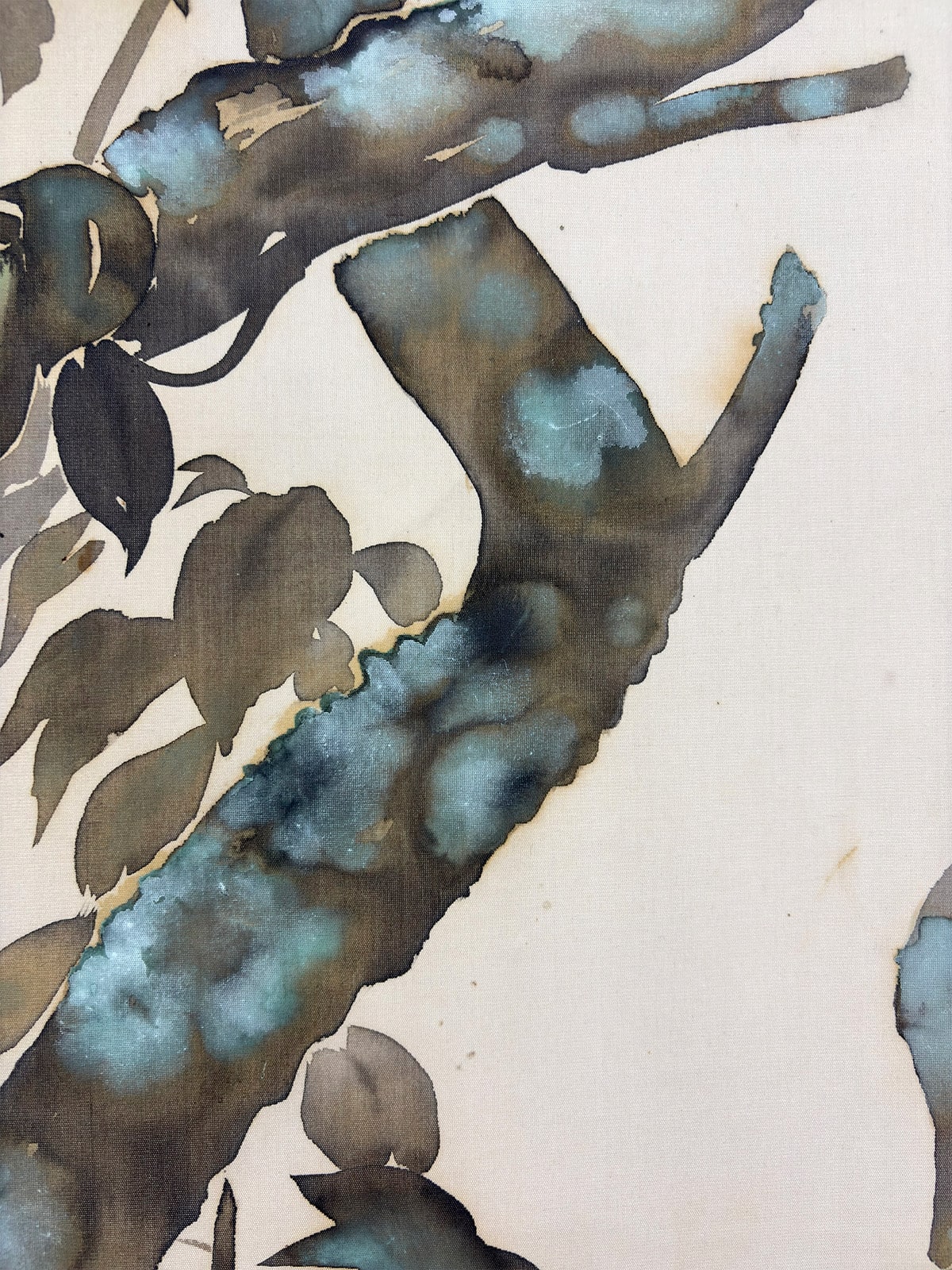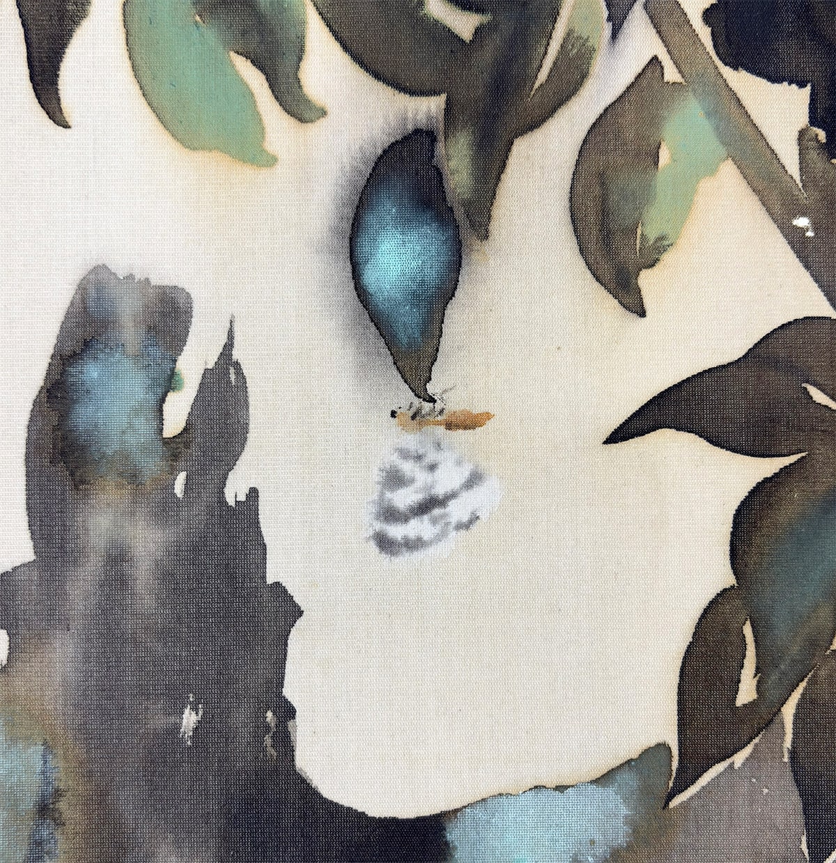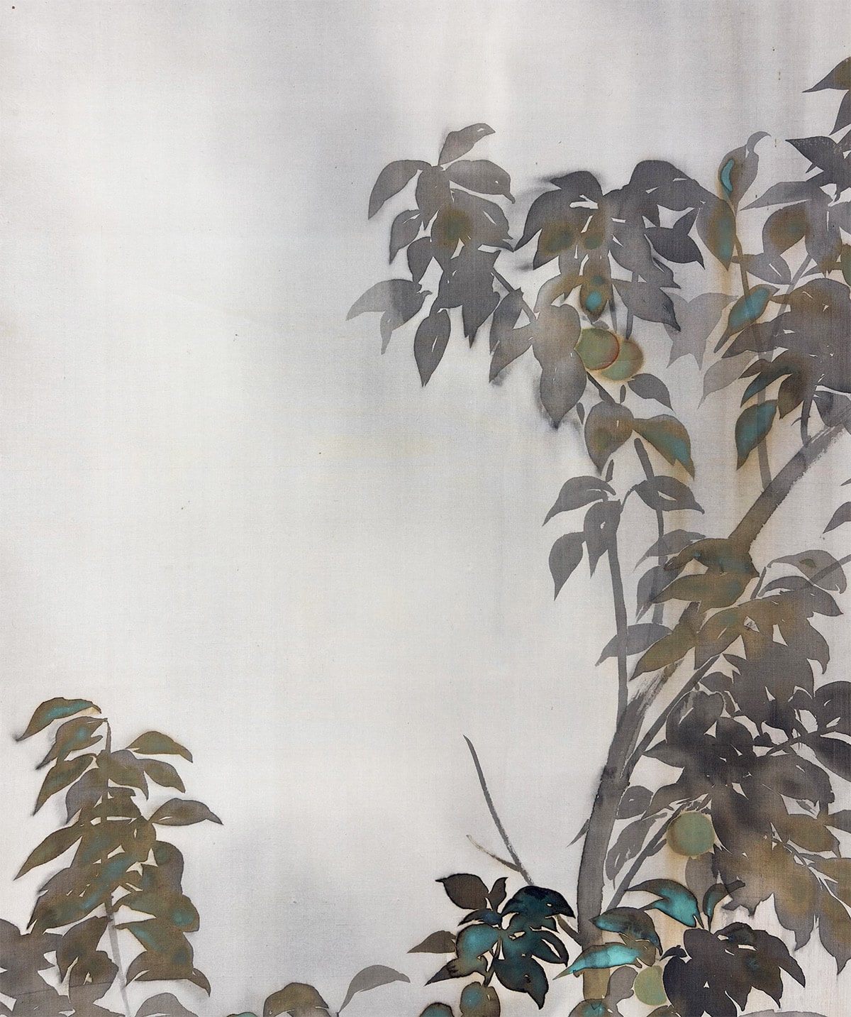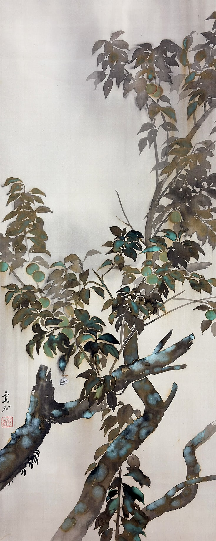 ●「たらしこみ」は、濡れた画面に墨や彩色を重ねることで、自然なにじみや揺らぎを生み出す日本画特有の技法です。霞村先生はこの技法を葉の描写に用い、雨に濡れた質感と空気の湿度を巧みに表現しています。枝間に描かれた青梅の淡緑が画面に清涼な緊張感を与え、梅雨の情景に確かな実りの予感を添えています。
