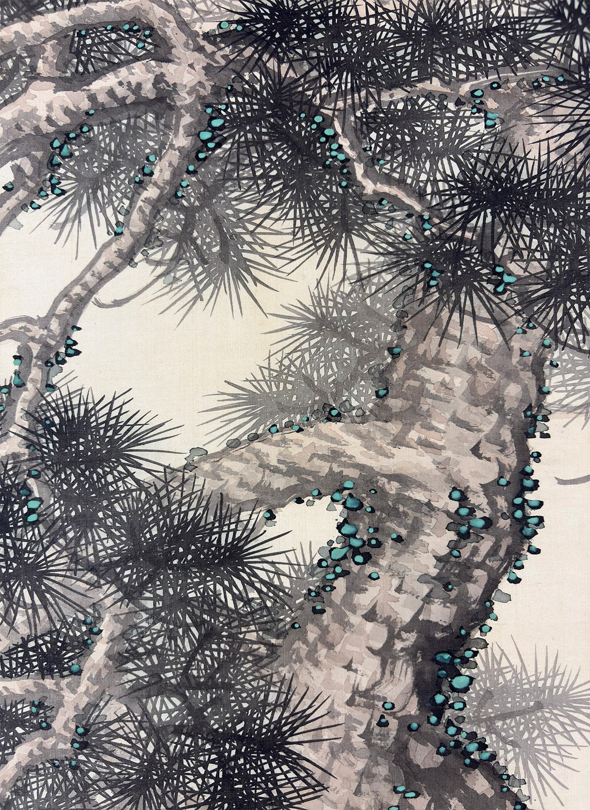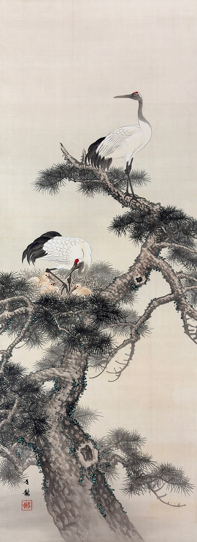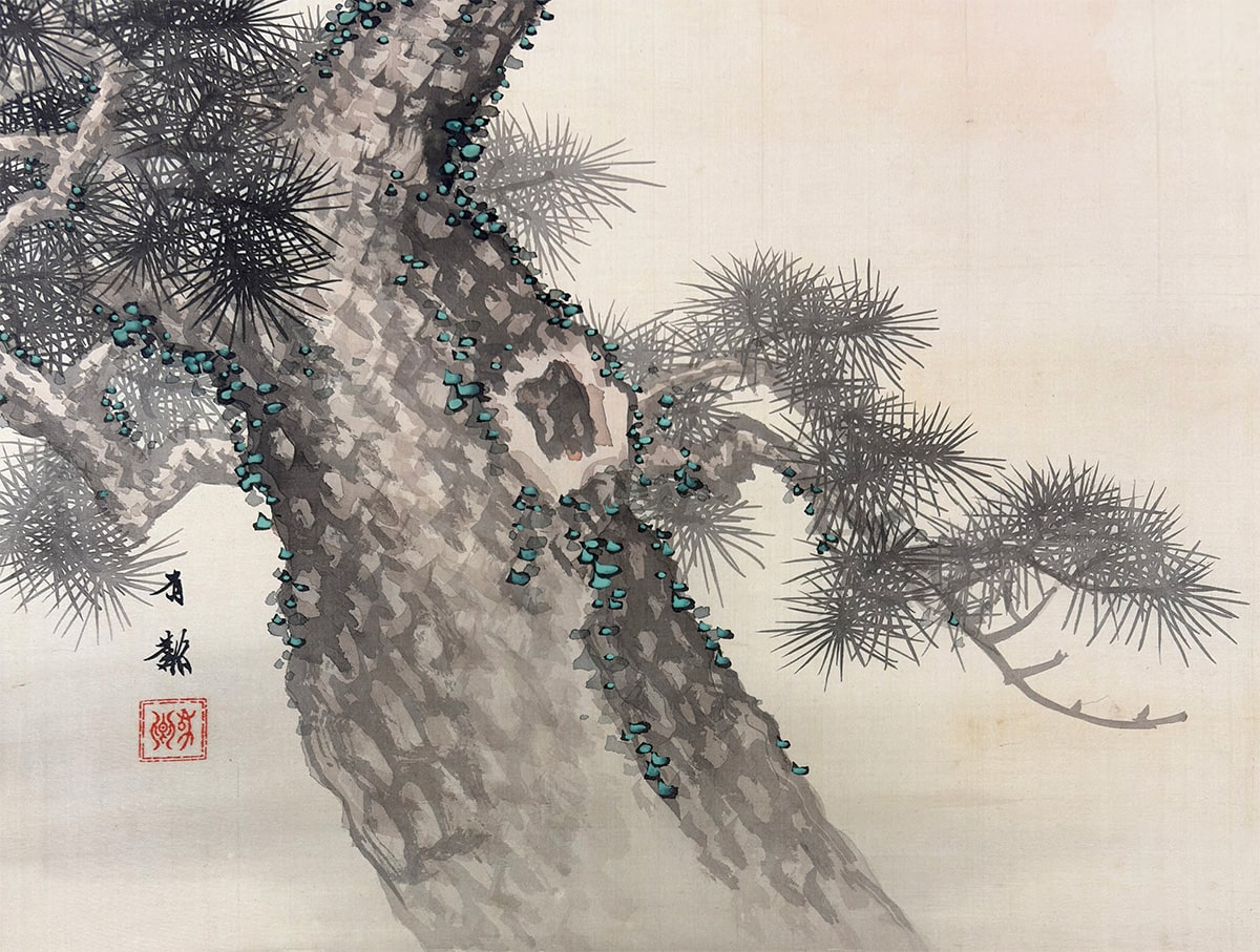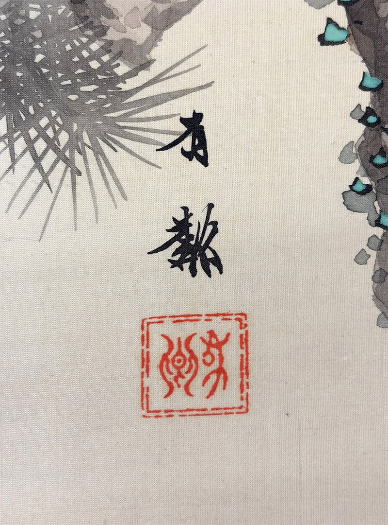 福壽の文字が繰り返され、長寿と繁栄を願う一幅です。石河 有粼による設色は柔らかく、墨線と彩色が調和しています。