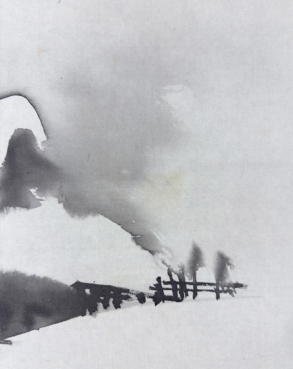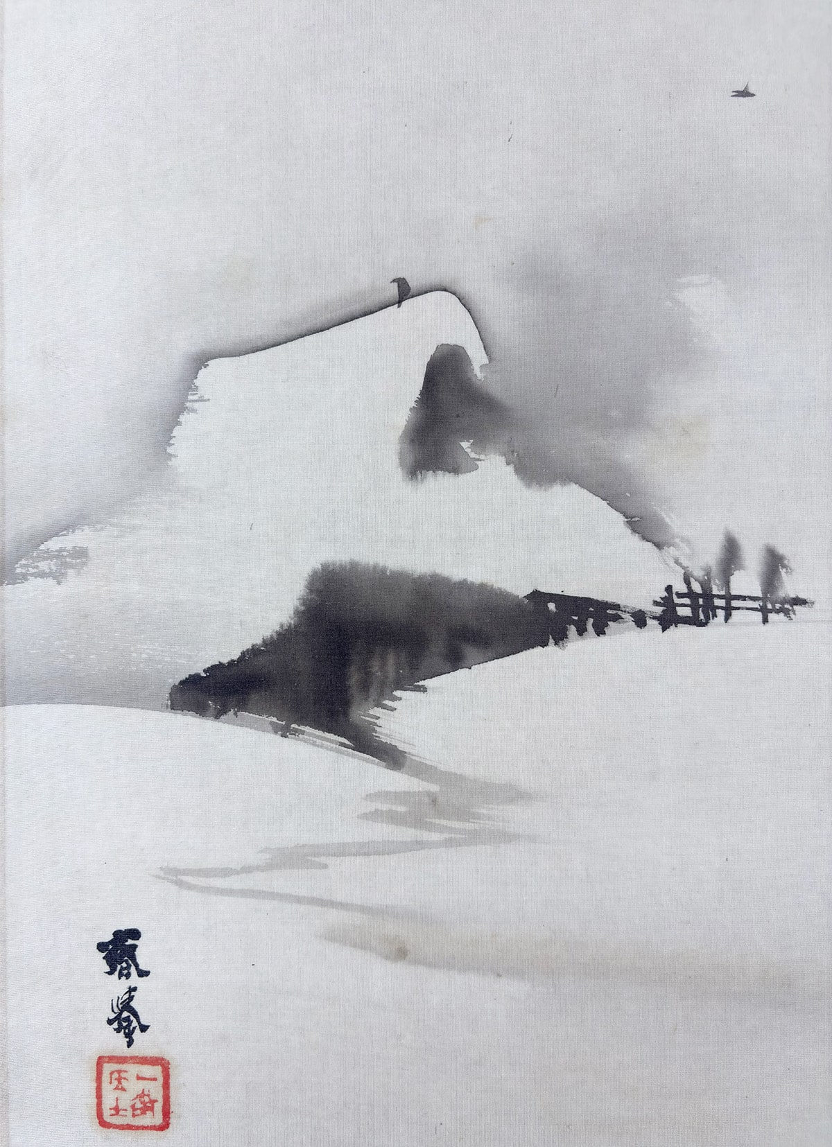 墨の濃淡と余白を活かした表現により、雪の冷たさと自然の静寂がしみじみと伝わってきます。
