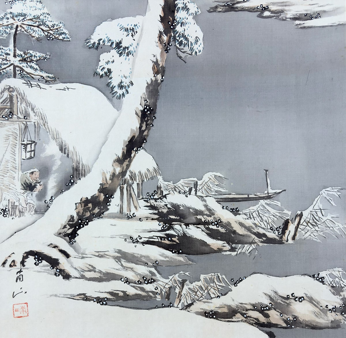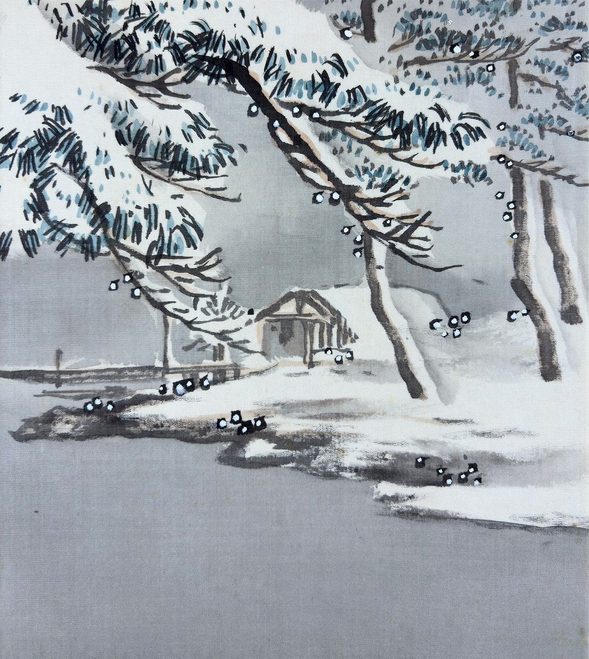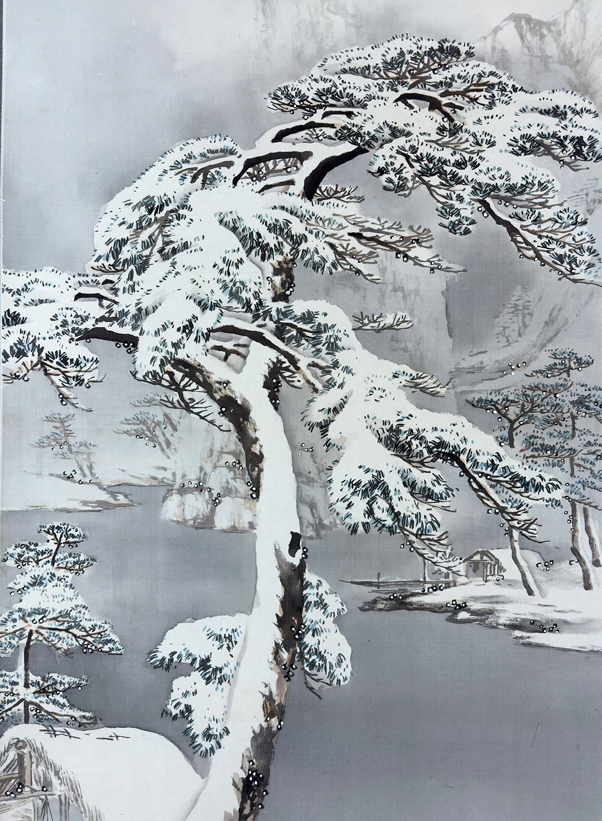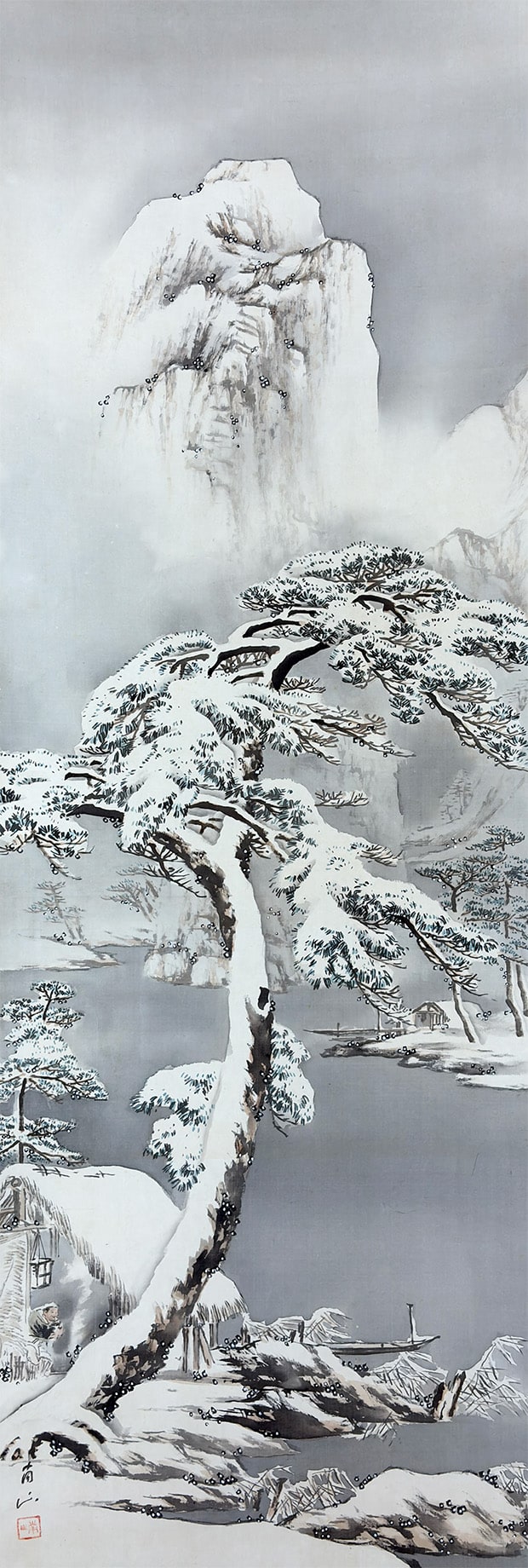 ●雪の静けさに包まれた湖畔の景。枝に雪を宿す老松が画面手前にゆるやかに立ち、奥には茅葺の庵がひっそりと佇みます。●遠景には霧に煙る山々が連なり、墨の濃淡と余白の妙により、深い奥行きと静謐な空気が描き出されています。