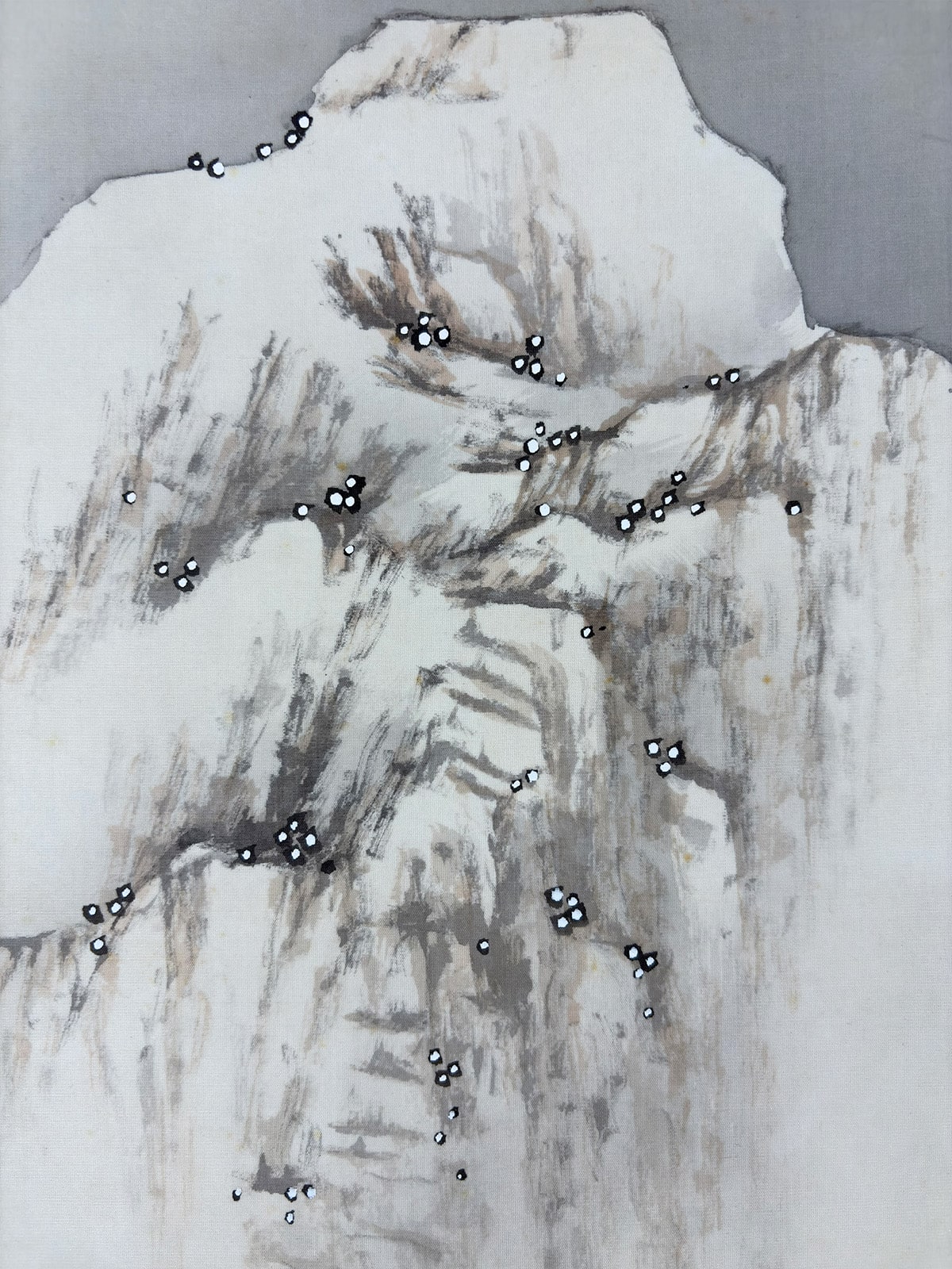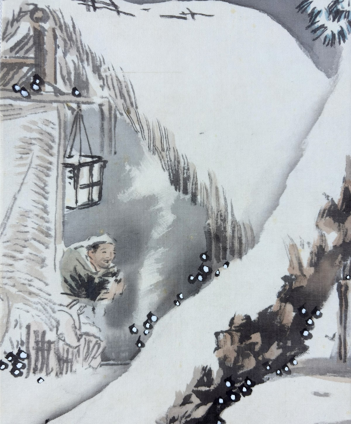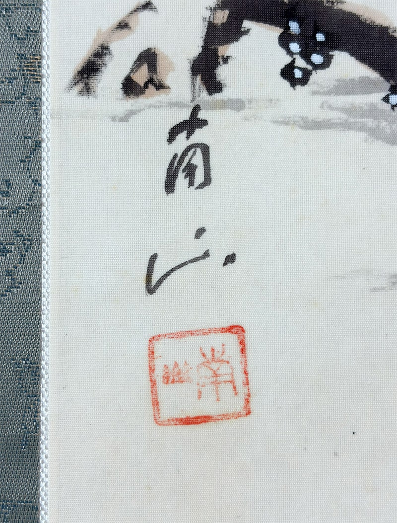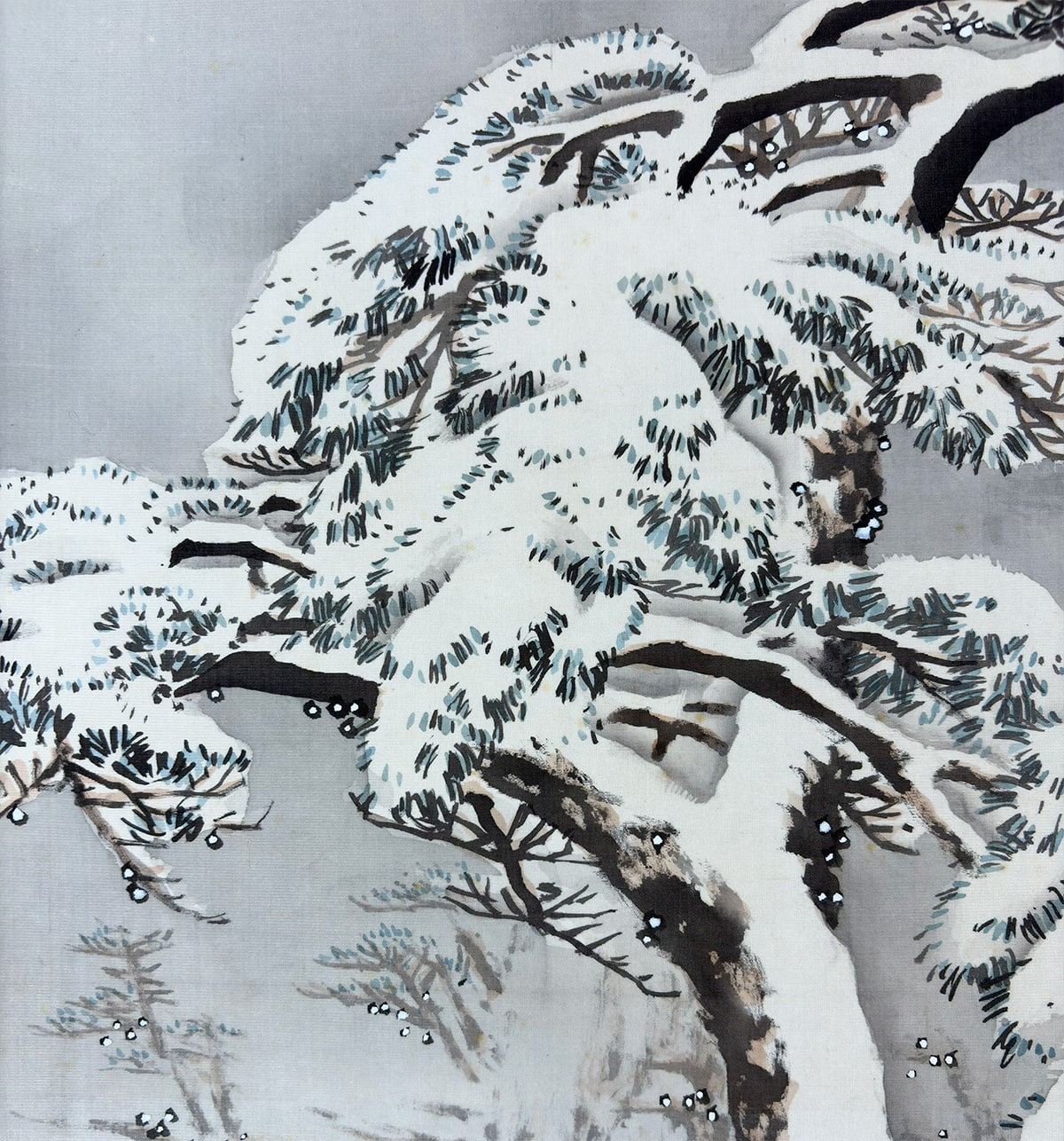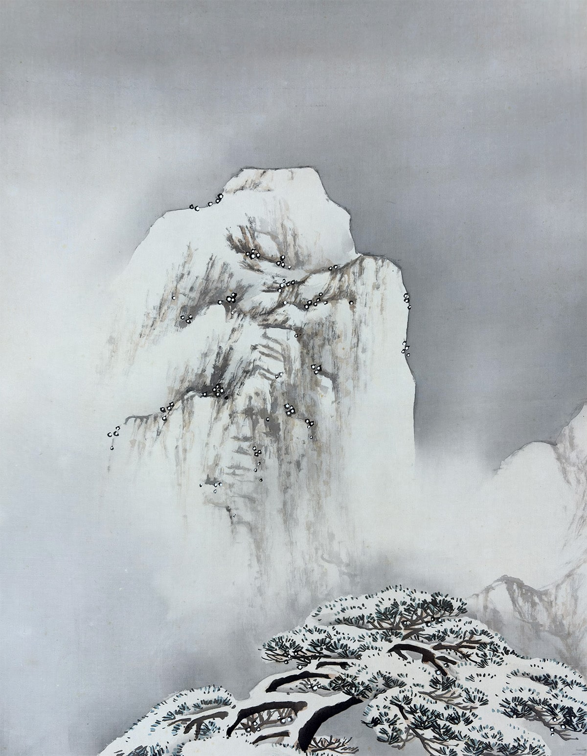 ●雪の静けさに包まれた湖畔の景。枝に雪を宿す老松が画面手前にゆるやかに立ち、奥には茅葺の庵がひっそりと佇みます。●遠景には霧に煙る山々が連なり、墨の濃淡と余白の妙により、深い奥行きと静謐な空気が描き出されています。