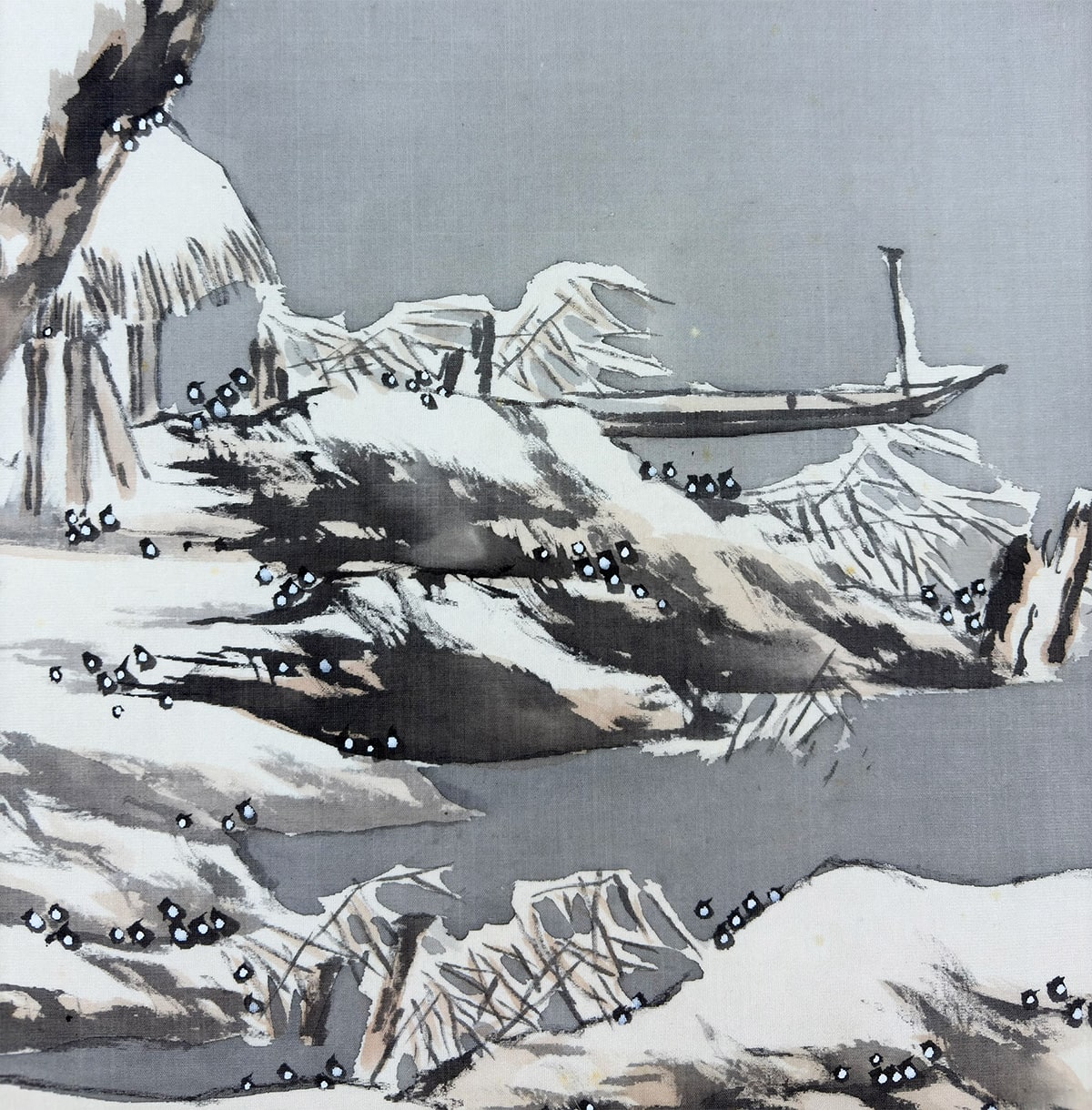 ●静寂に包まれた湖畔、雪を纏う老松がゆるやかに枝を広げ、奥には茅葺の庵がひっそりと佇む。墨の濃淡と余白が織りなす冬景は、見る者の心に静かな余韻を残します。