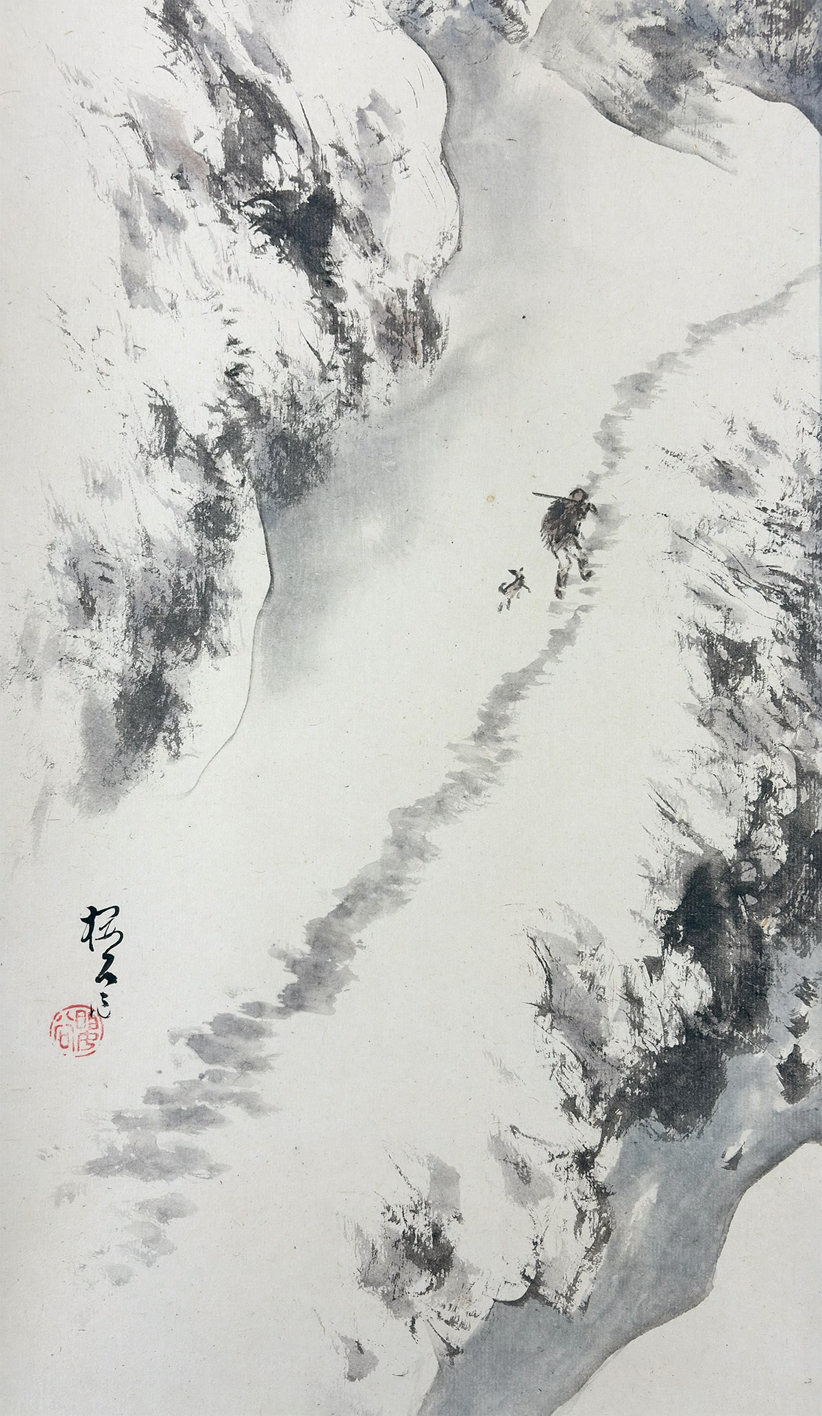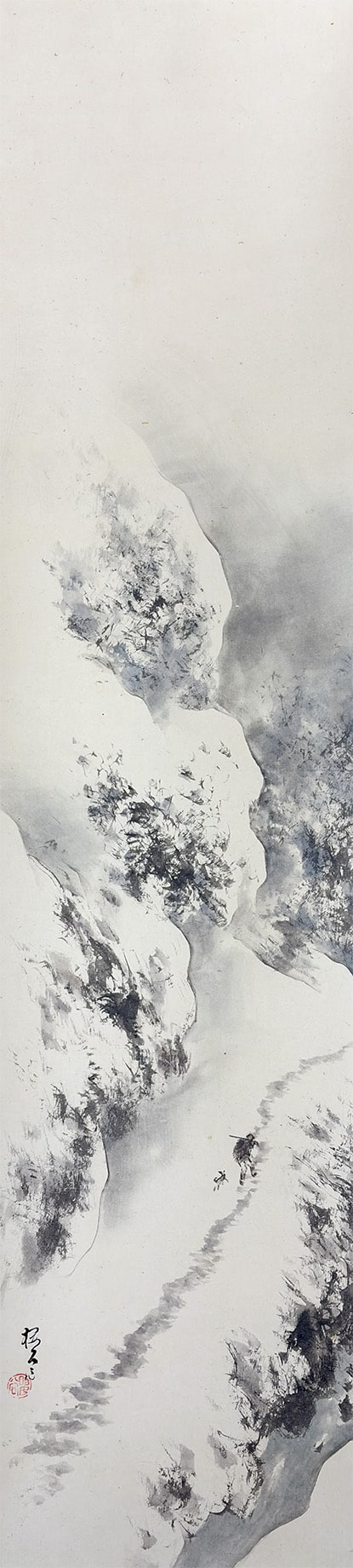 ●近年、再評価が非常に高まっている京都画壇の巨匠による、静謐で味わい深い雪渓水墨山水図です。