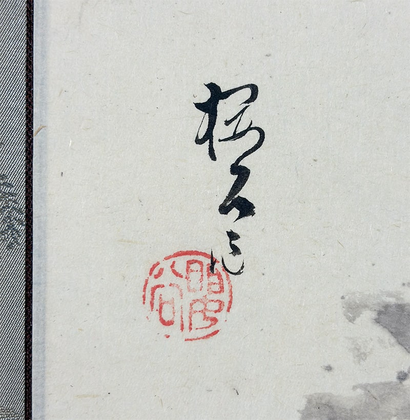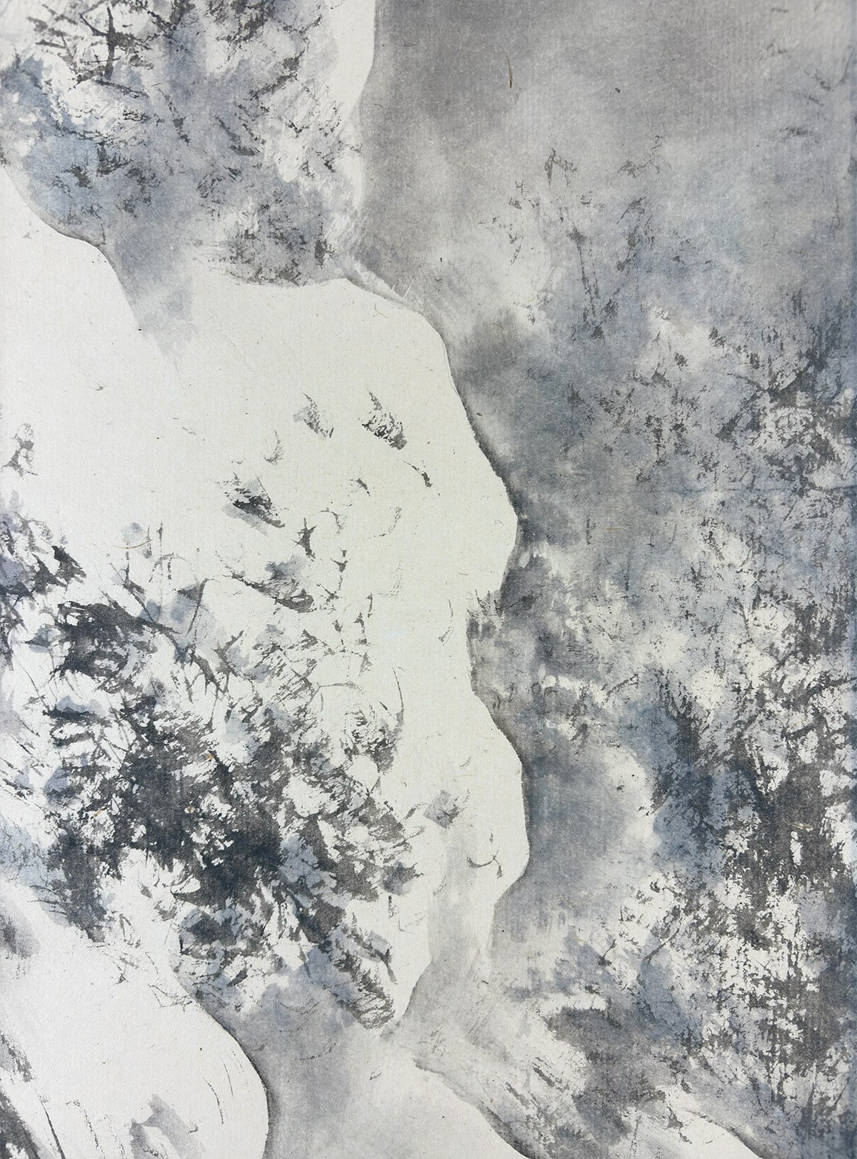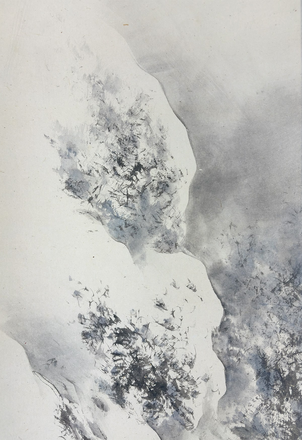 ●墨の濃淡が織りなす奥行き 黒一色でありながら、手前の岩肌の鋭い筆致と、奥へ続く霞んだ景色との対比により、画面の中に深い奥行きと豊かな色彩を感じさせます。