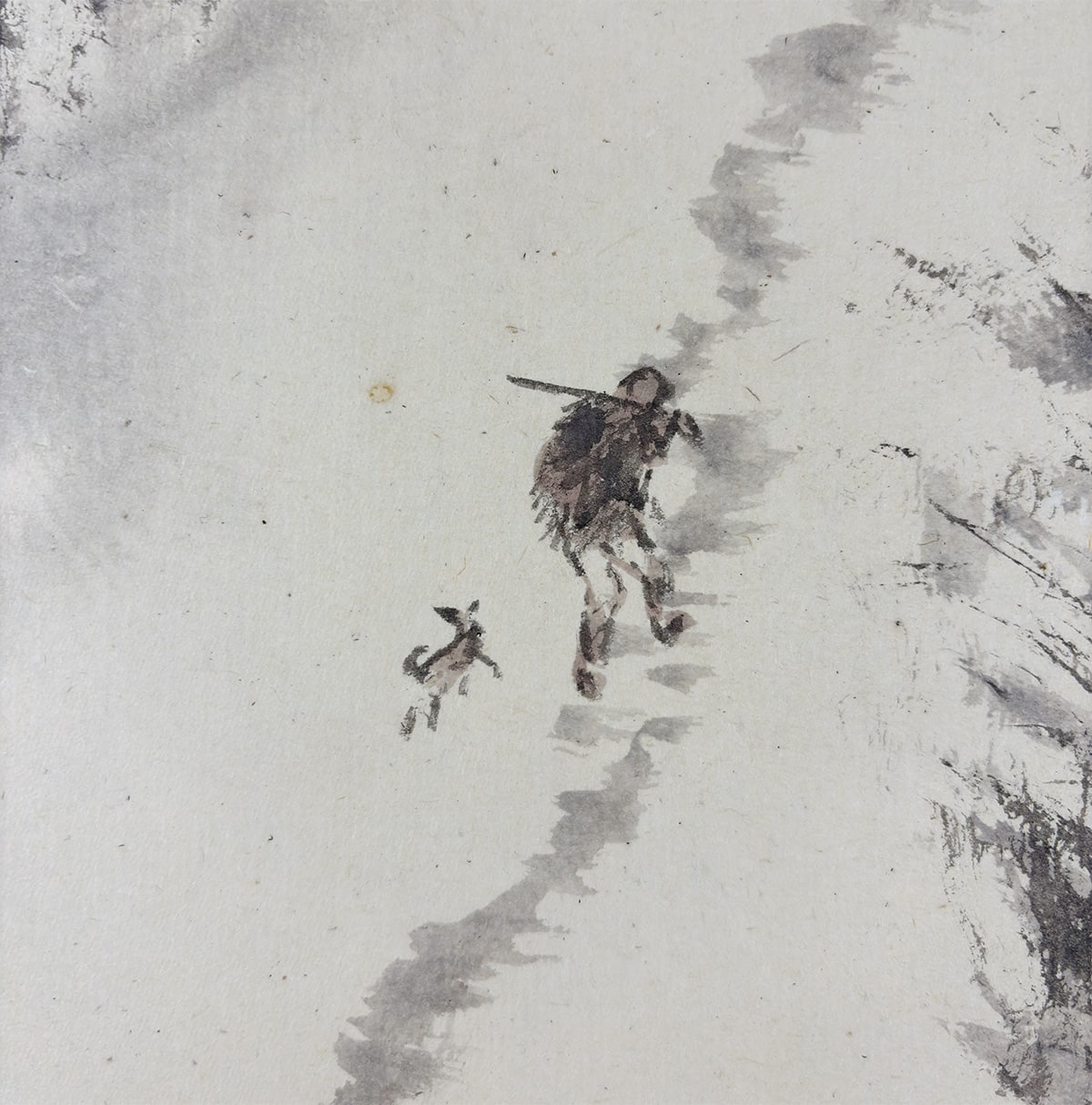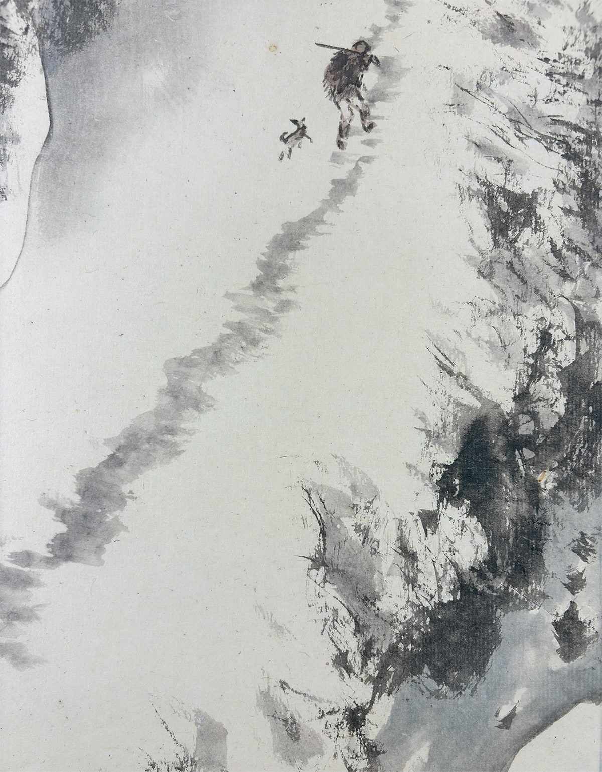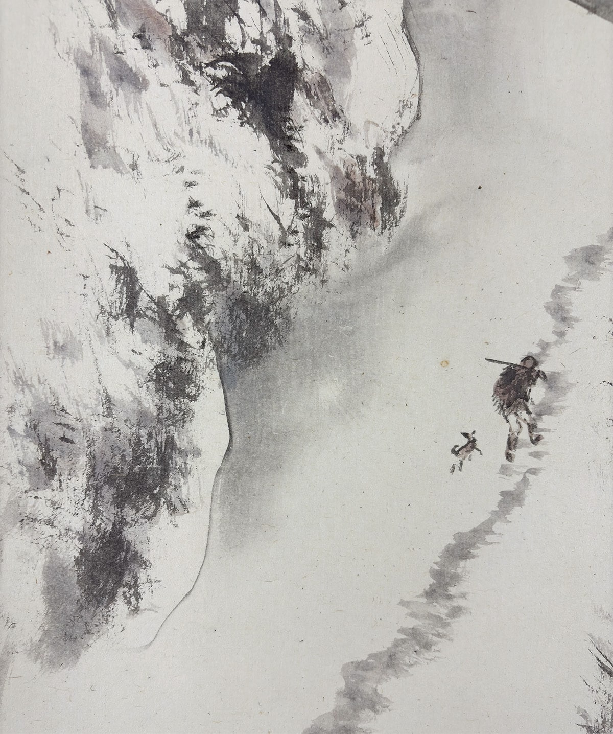 ●雪の白さは、絵の具(胡粉)を塗るのではなく、紙の地色をそのまま残す「塗り残し」の技法で表現されています。周囲を淡い墨でふんわりとぼかすことで、雪の柔らかな厚みと、谷間の冷たく澄んだ空気を際立たせています。