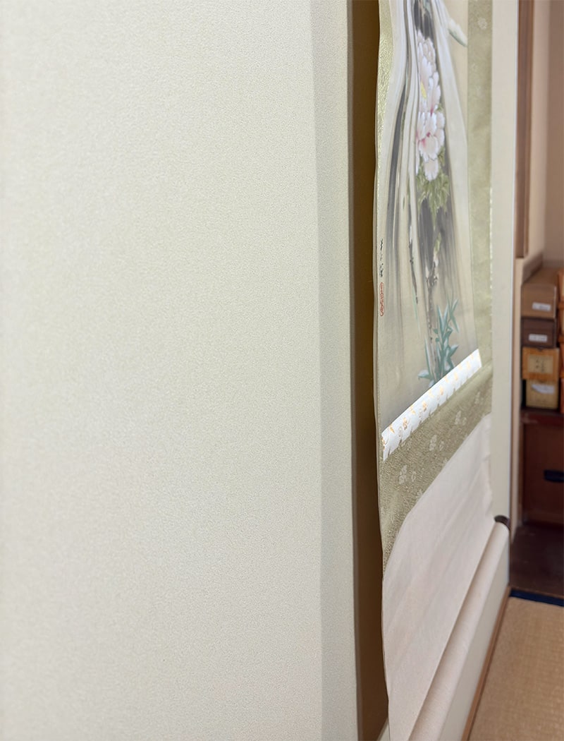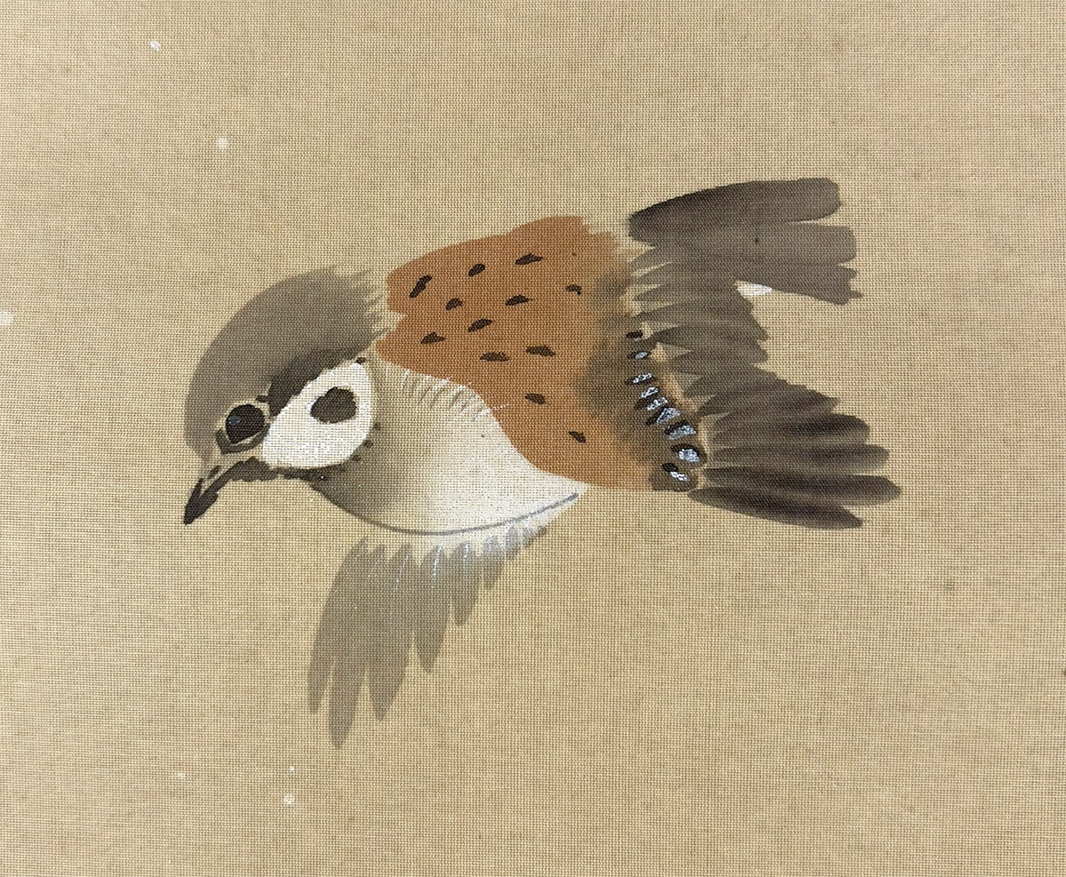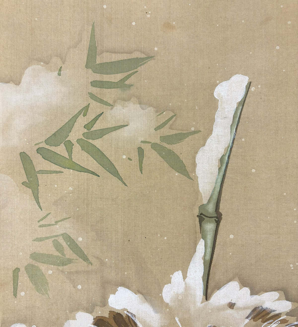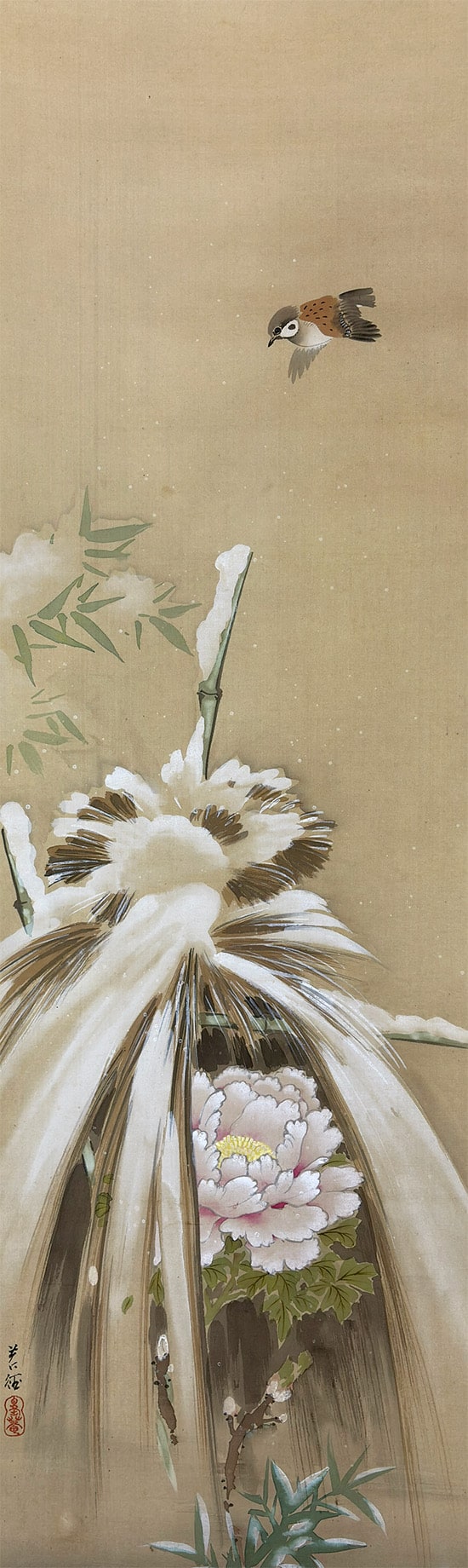 柔らかな筆致で表現された牡丹と竹に積もる雪、その上を舞う雀が、寒中の生命の輝きをそっと伝えます。