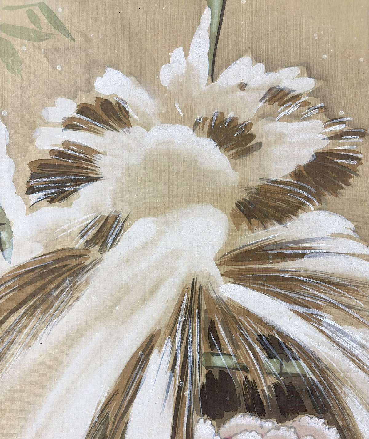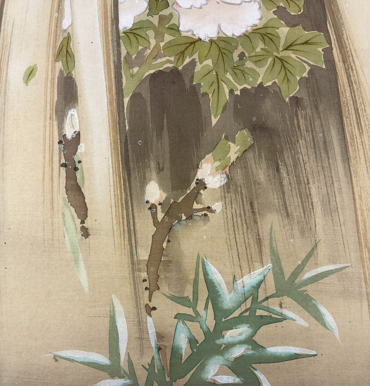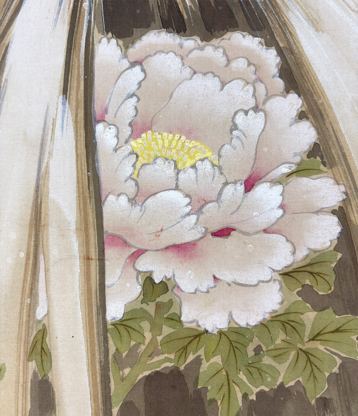 柔らかな筆致で表現された牡丹と竹に積もる雪、その上を舞う雀が、寒中の生命の輝きをそっと伝えます。