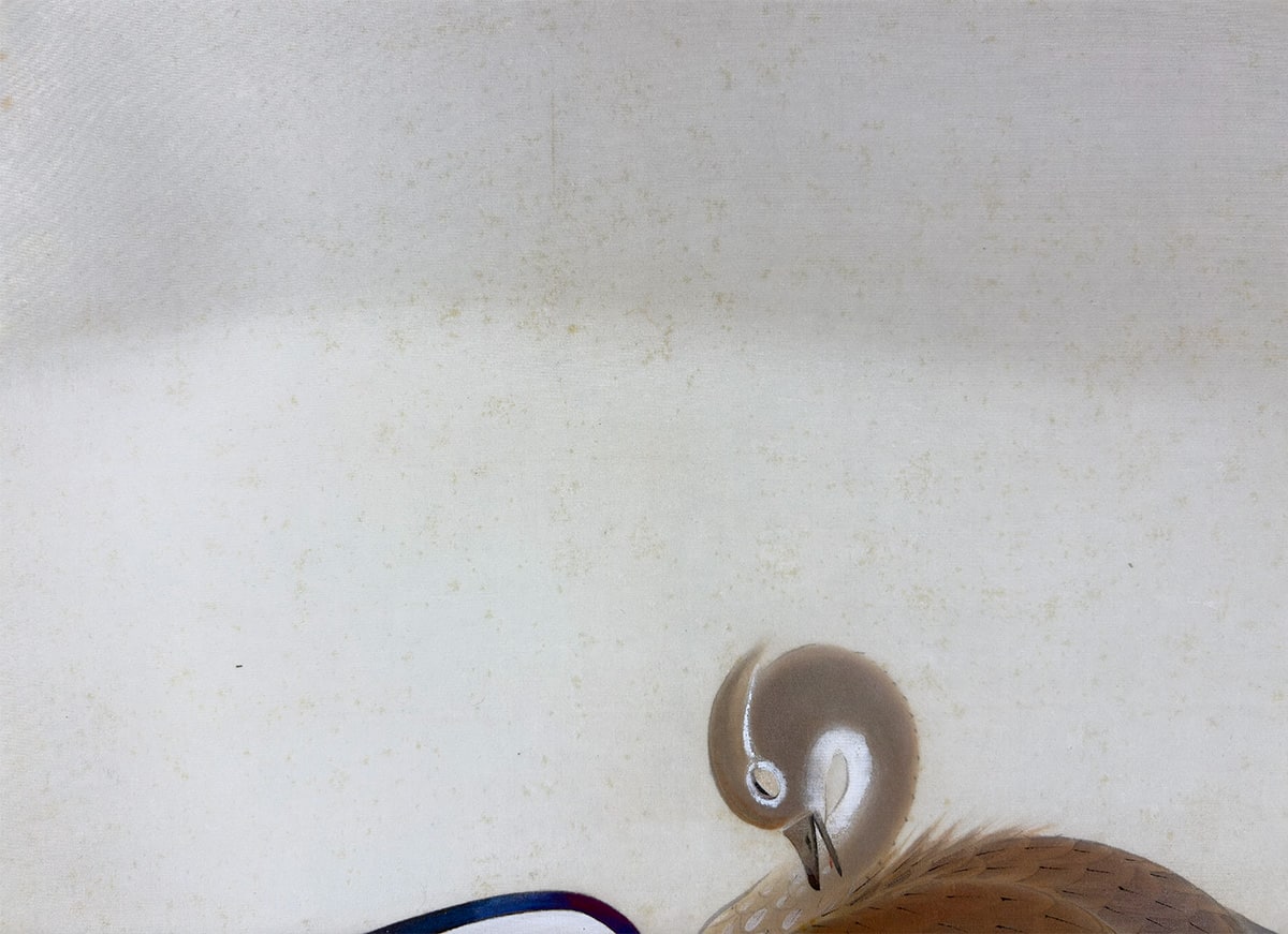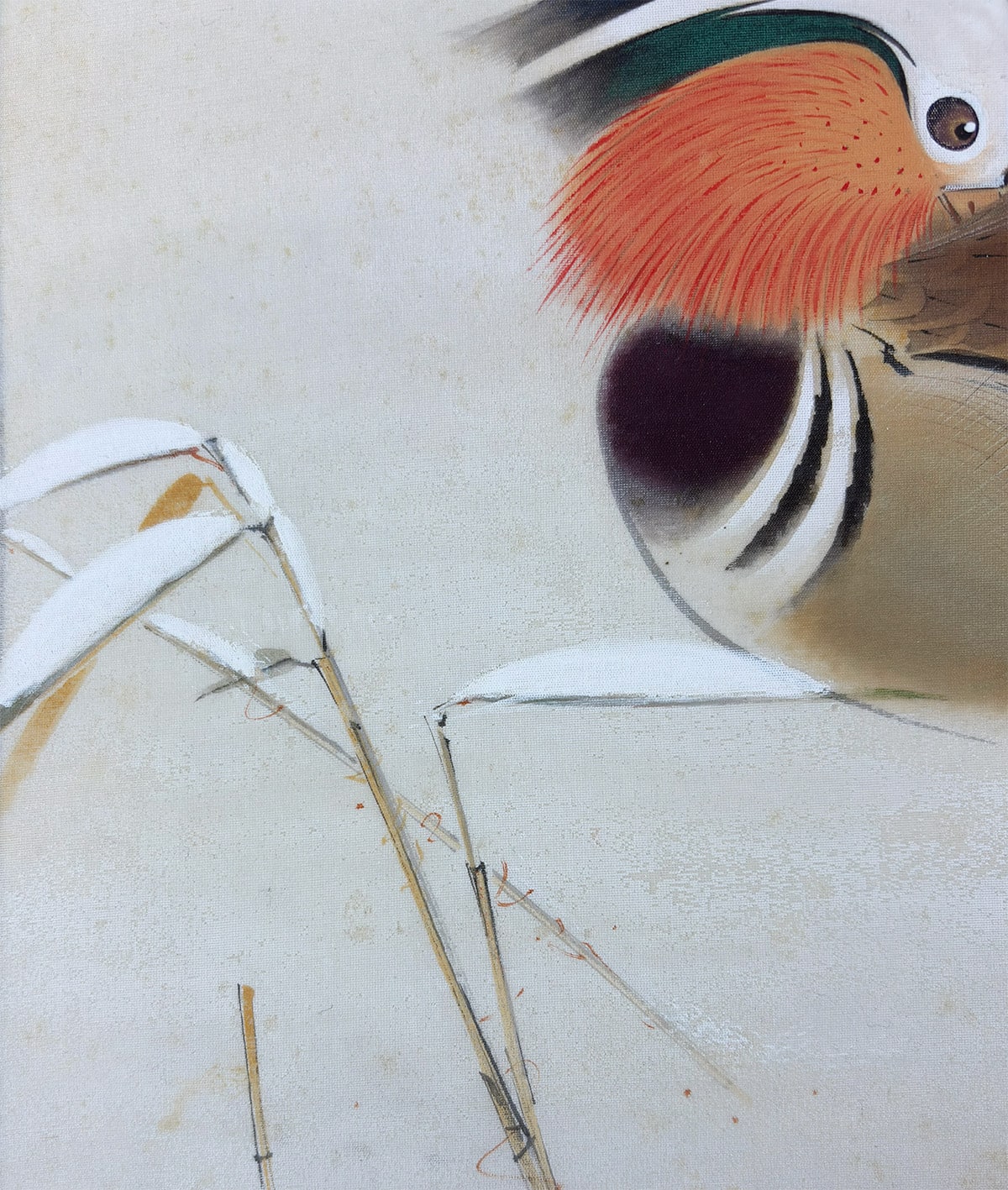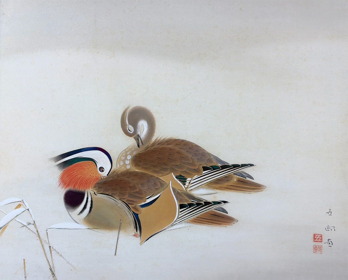 ●鴛鴦の羽根の質感や表情に細やかな筆致が光り、雪の白が画面に凛とした緊張感と詩情をもたらします。冬の静寂の中に寄り添う二羽の姿が、観る者の心に静かな余韻を残しています。