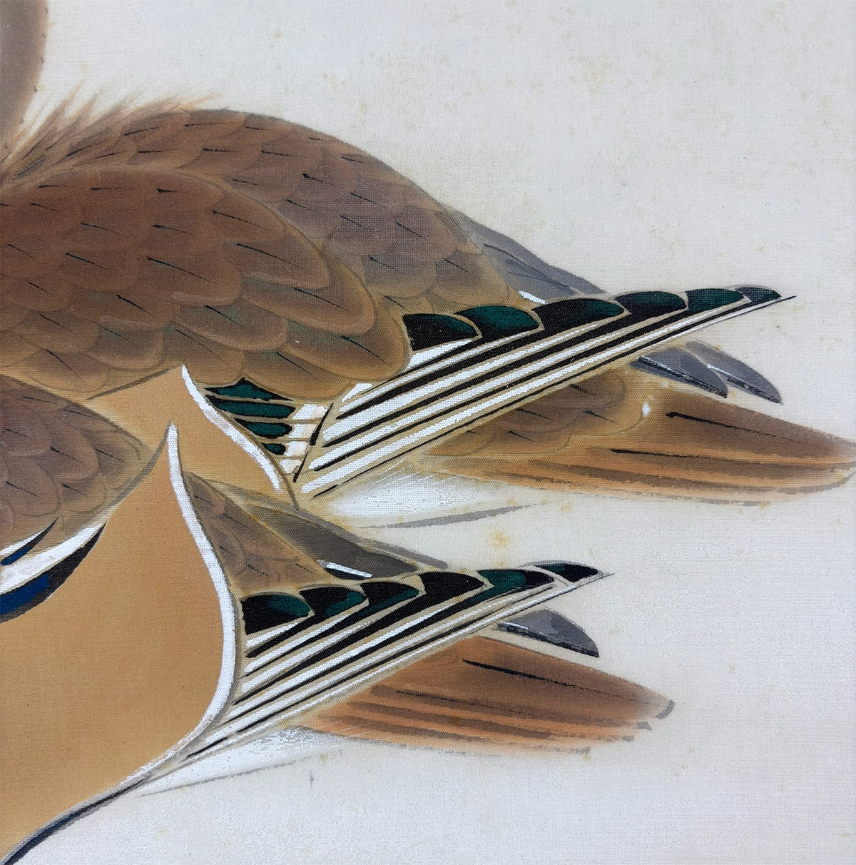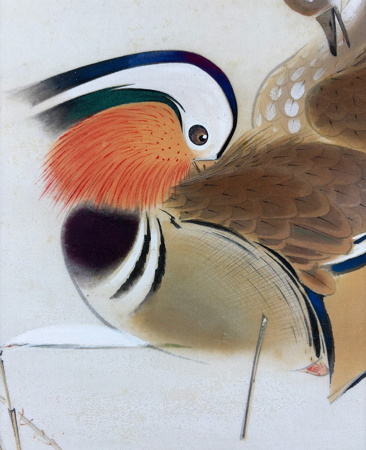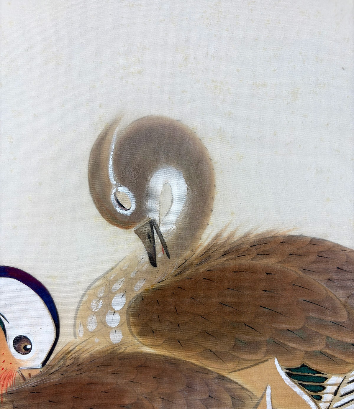 ●鴛鴦の羽根の質感や表情に細やかな筆致が光り、雪の白が画面に凛とした緊張感と詩情をもたらします。冬の静寂の中に寄り添う二羽の姿が、観る者の心に静かな余韻を残しています。