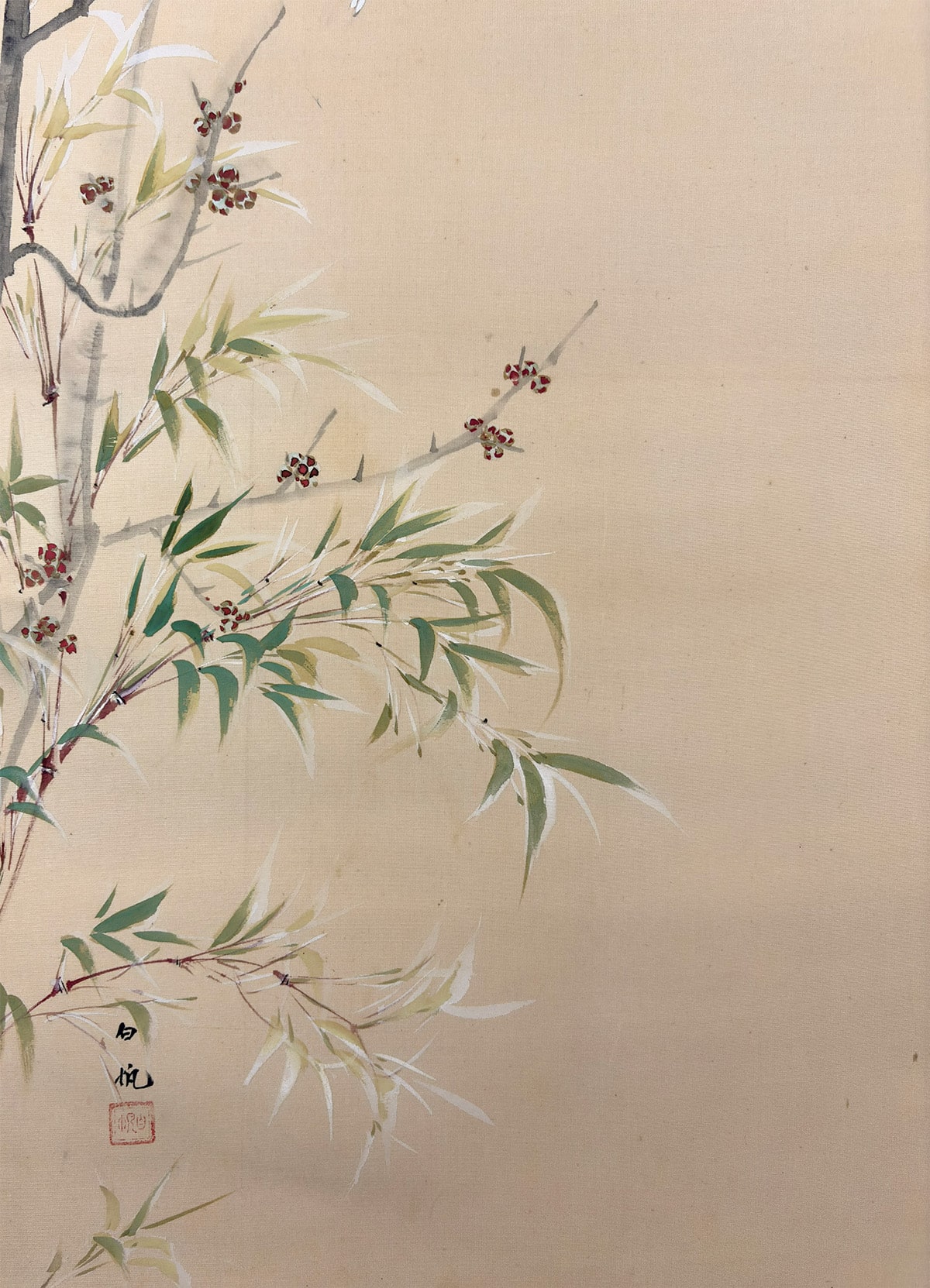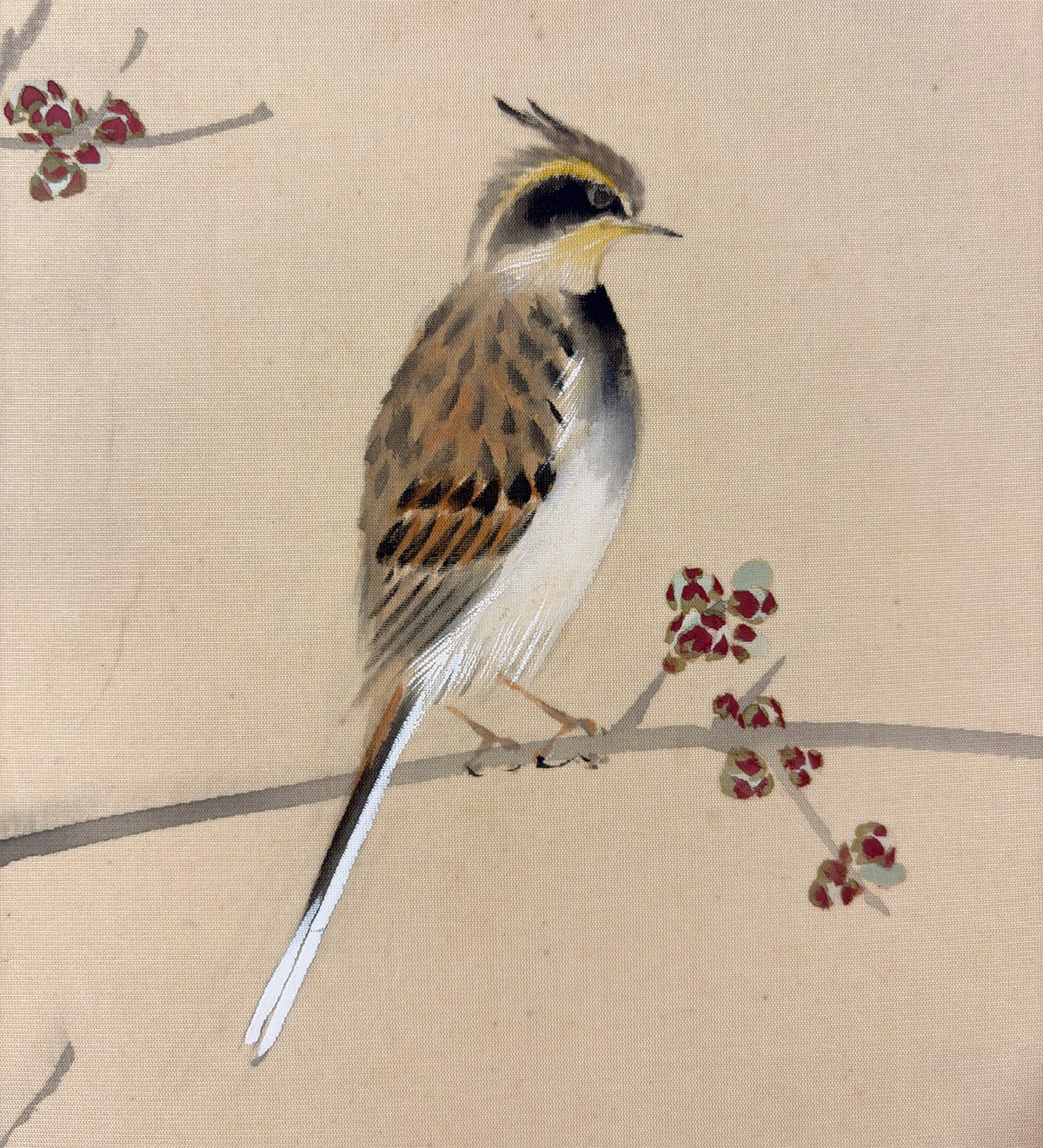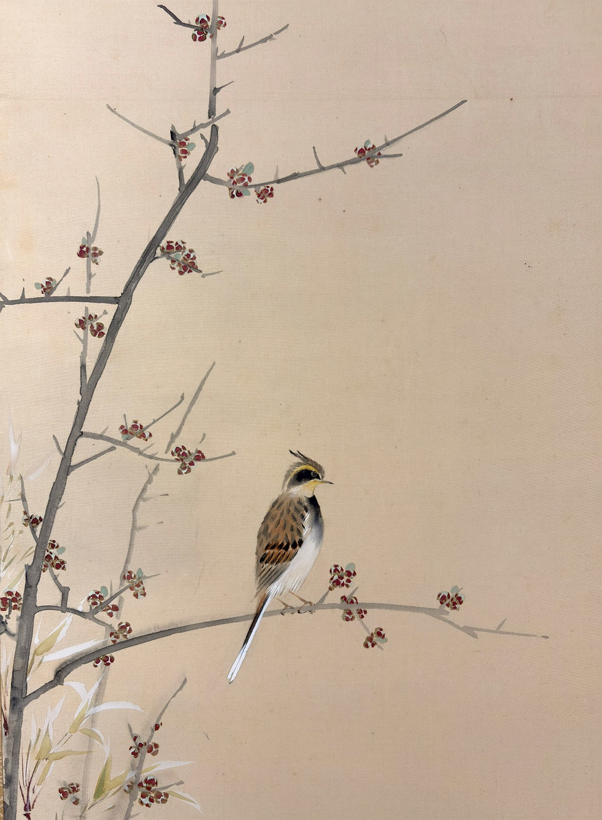 ●春の気配がまだ浅い頃、野に残る実と小鳥の姿をそっと描いた一幅です。